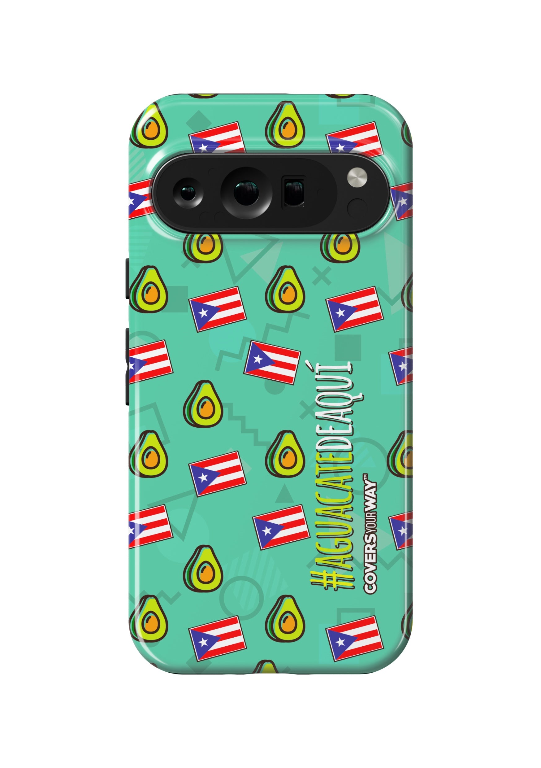 Este protector para celular luce un diseño exclusivo con la frase "#AGUACATEDEAQUÍ" en letras modernas y llamativas, destacada sobre un fondo fresco que incluye ilustraciones de aguacates y la bandera puertorriqueña. Con colores vivos y un estilo divertido, celebra lo local y auténtico. Fabricado con materiales resistentes, ofrece protección con un toque de orgullo y sabor caribeño.