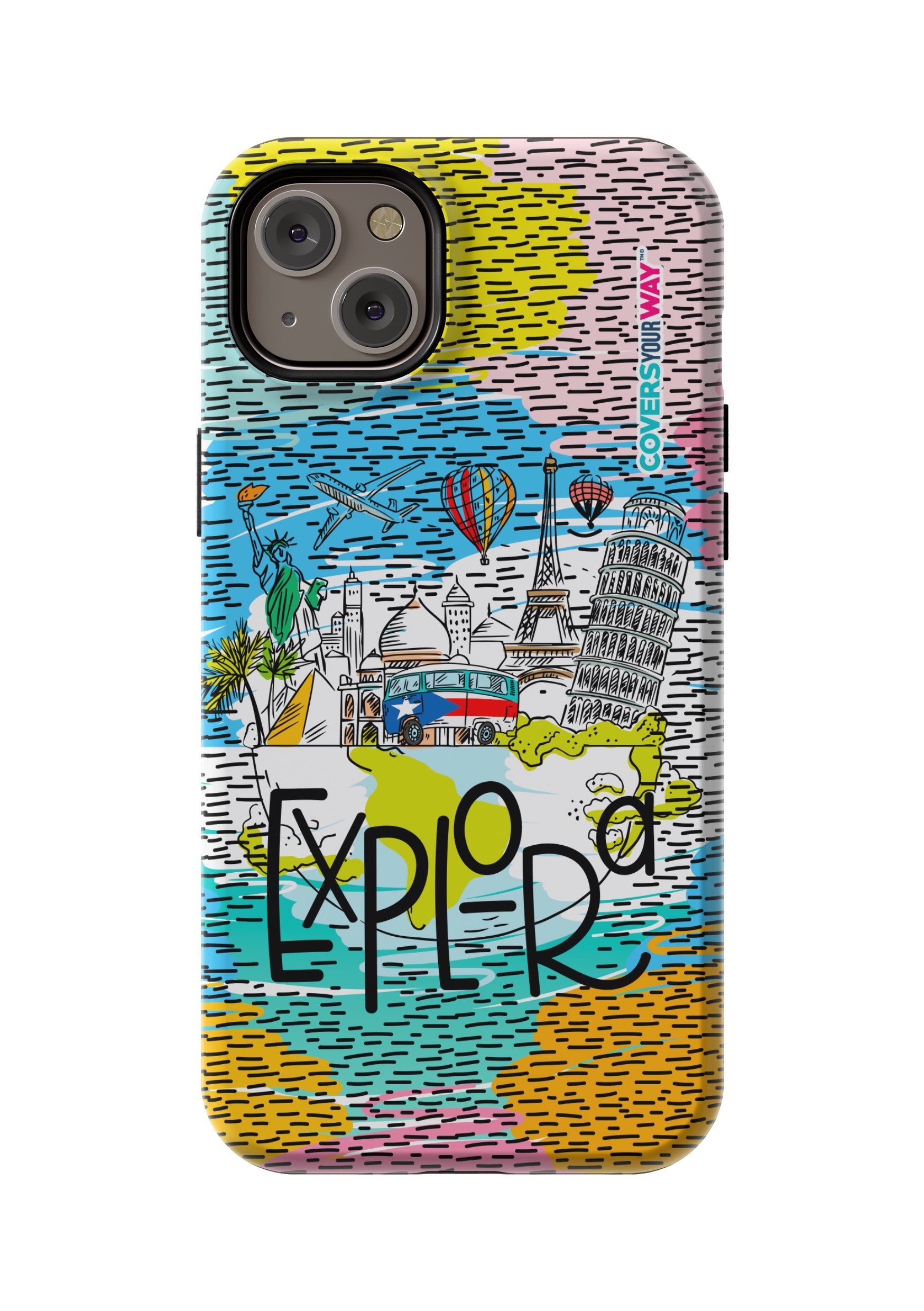 Protector de celular con diseño exclusivo que combina estilo y resistencia. Presenta un fondo artístico de maravillas mundiales y la palabra "Explora" en tipografía inspiradora, ideal para amantes de la aventura. Fabricado con materiales duraderos que protegen contra golpes y rayaduras.