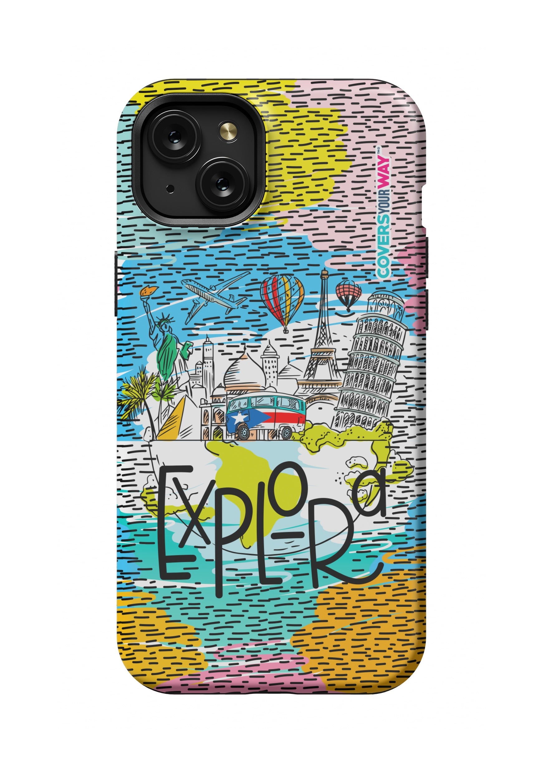 Exclusive phone case that combines style and durability. Features an artistic background of world wonders and the word "Explore" in an inspiring font—perfect for adventure lovers. Made with durable materials that protect against bumps and scratches.