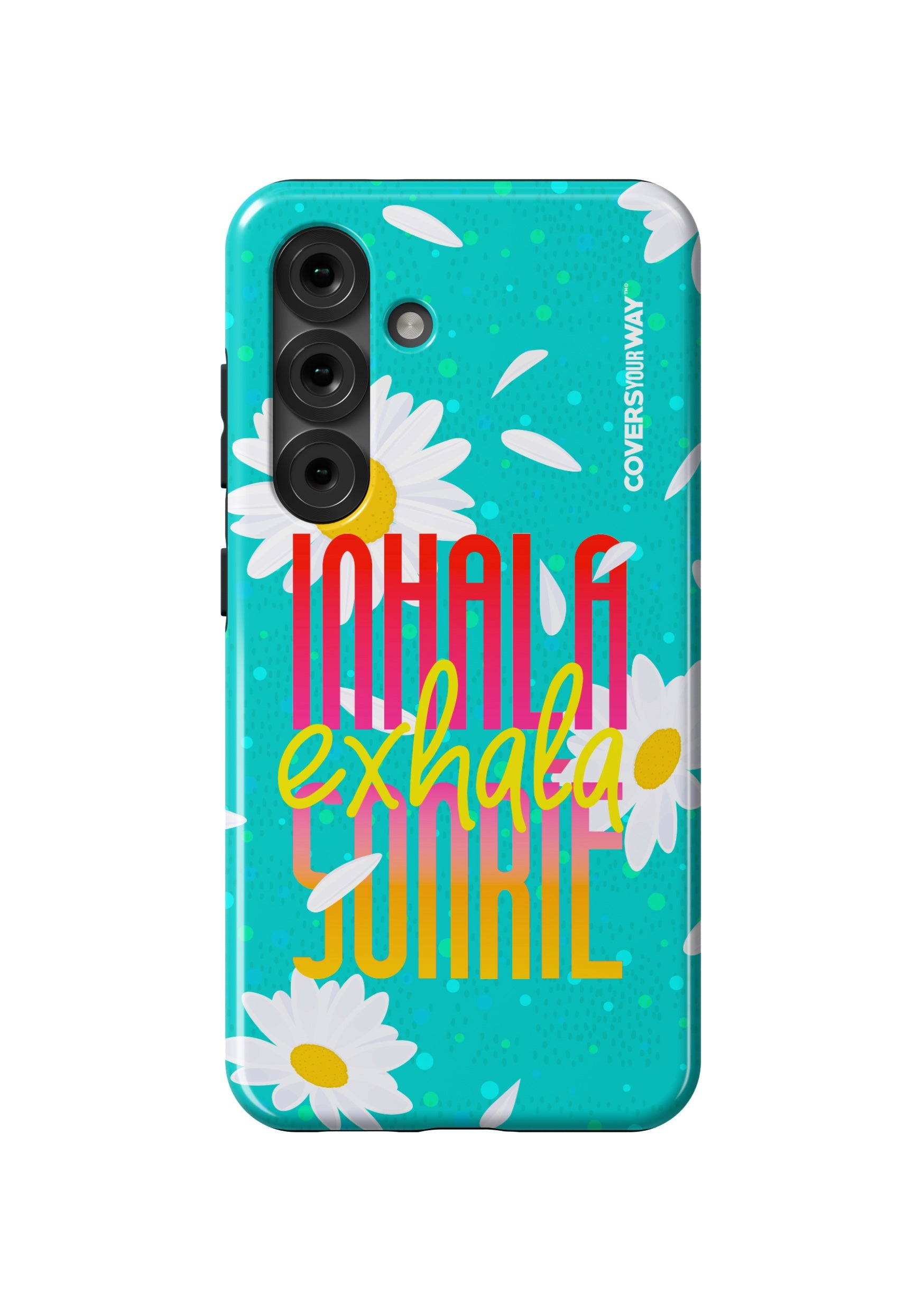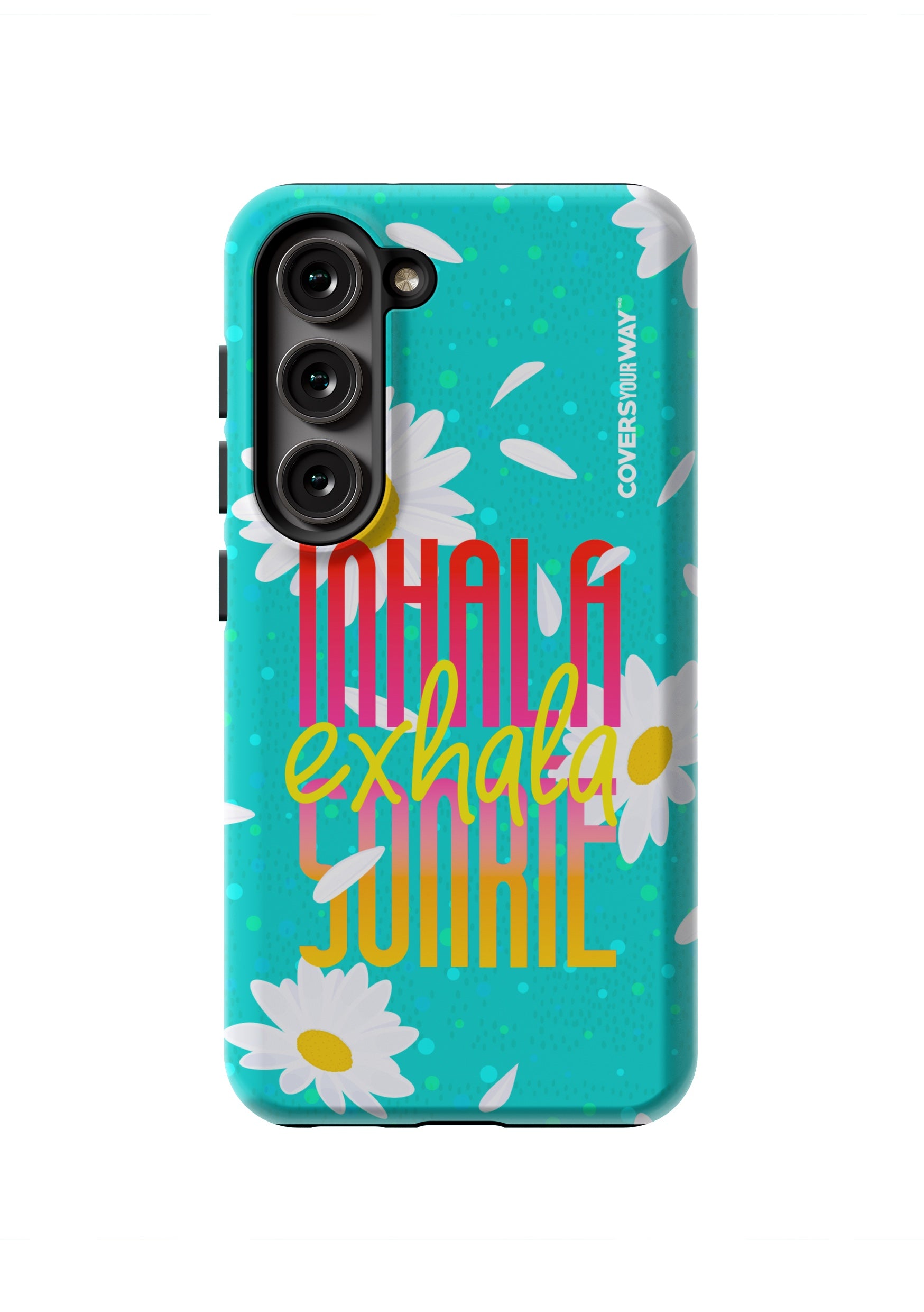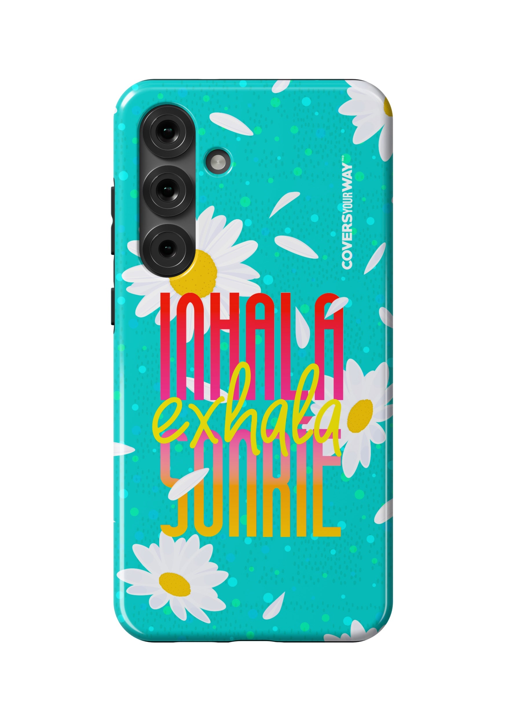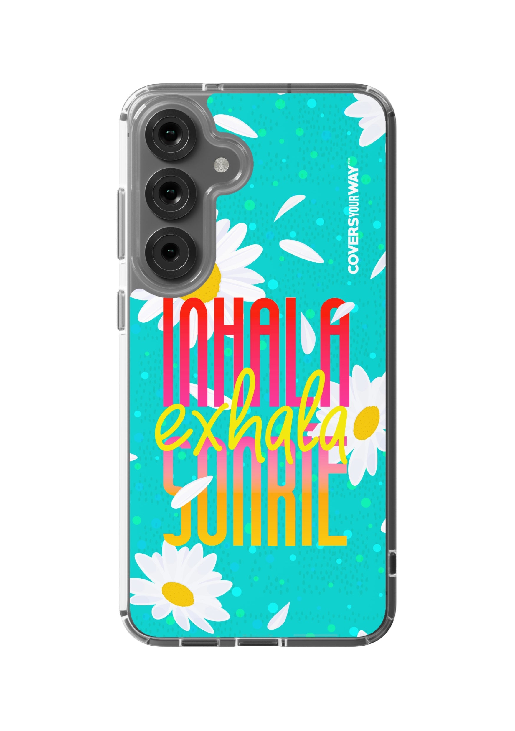 Protector de celular con diseño exclusivo que transmite calma y bienestar. Presenta la frase "Inhala Exhala Sonríe" en una tipografía suave, acompañada de un fondo relajante con tonos pastel. Ideal para quienes buscan equilibrio y serenidad en su día a día. Brinda protección confiable contra golpes y rayaduras.