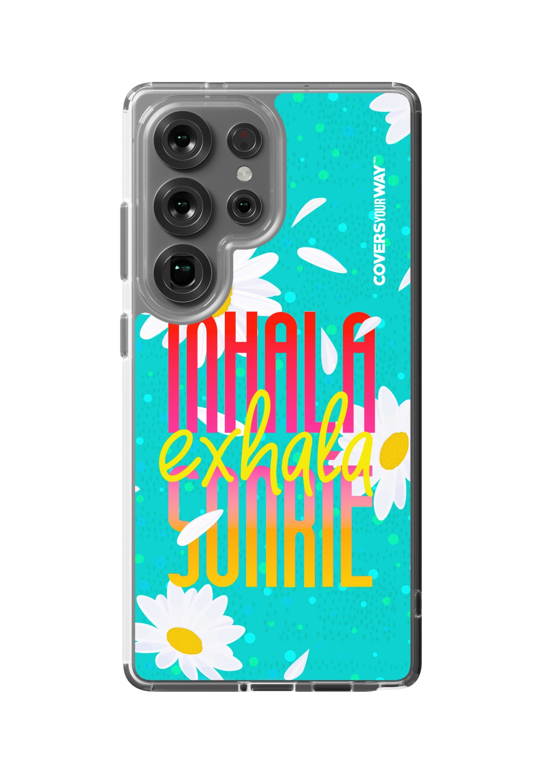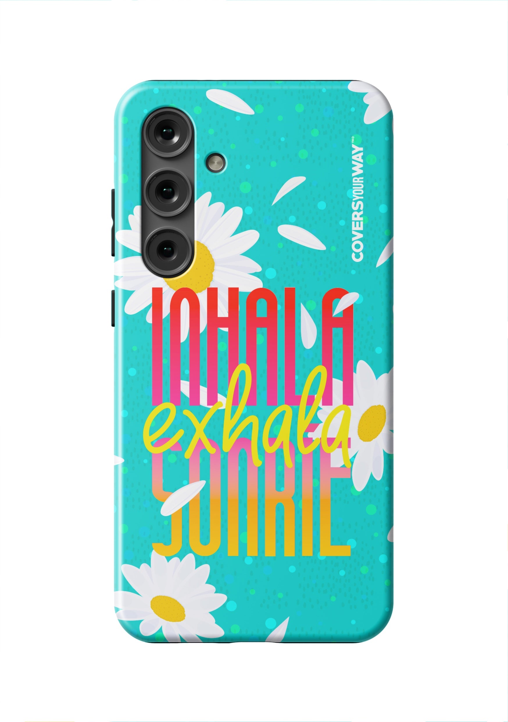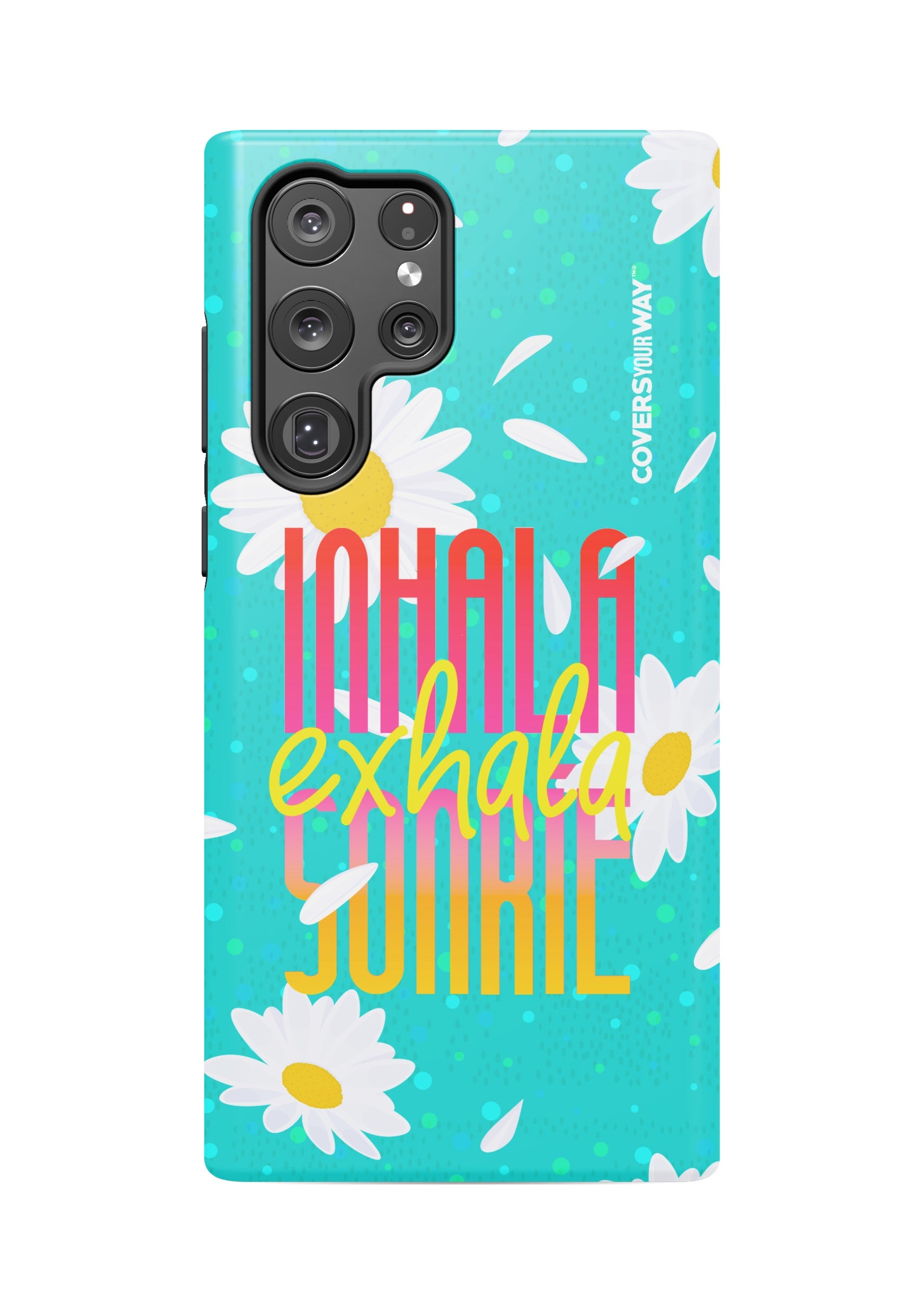 Protector de celular con diseño exclusivo que transmite calma y bienestar. Presenta la frase "Inhala Exhala Sonríe" en una tipografía suave, acompañada de un fondo relajante con tonos pastel. Ideal para quienes buscan equilibrio y serenidad en su día a día. Brinda protección confiable contra golpes y rayaduras.