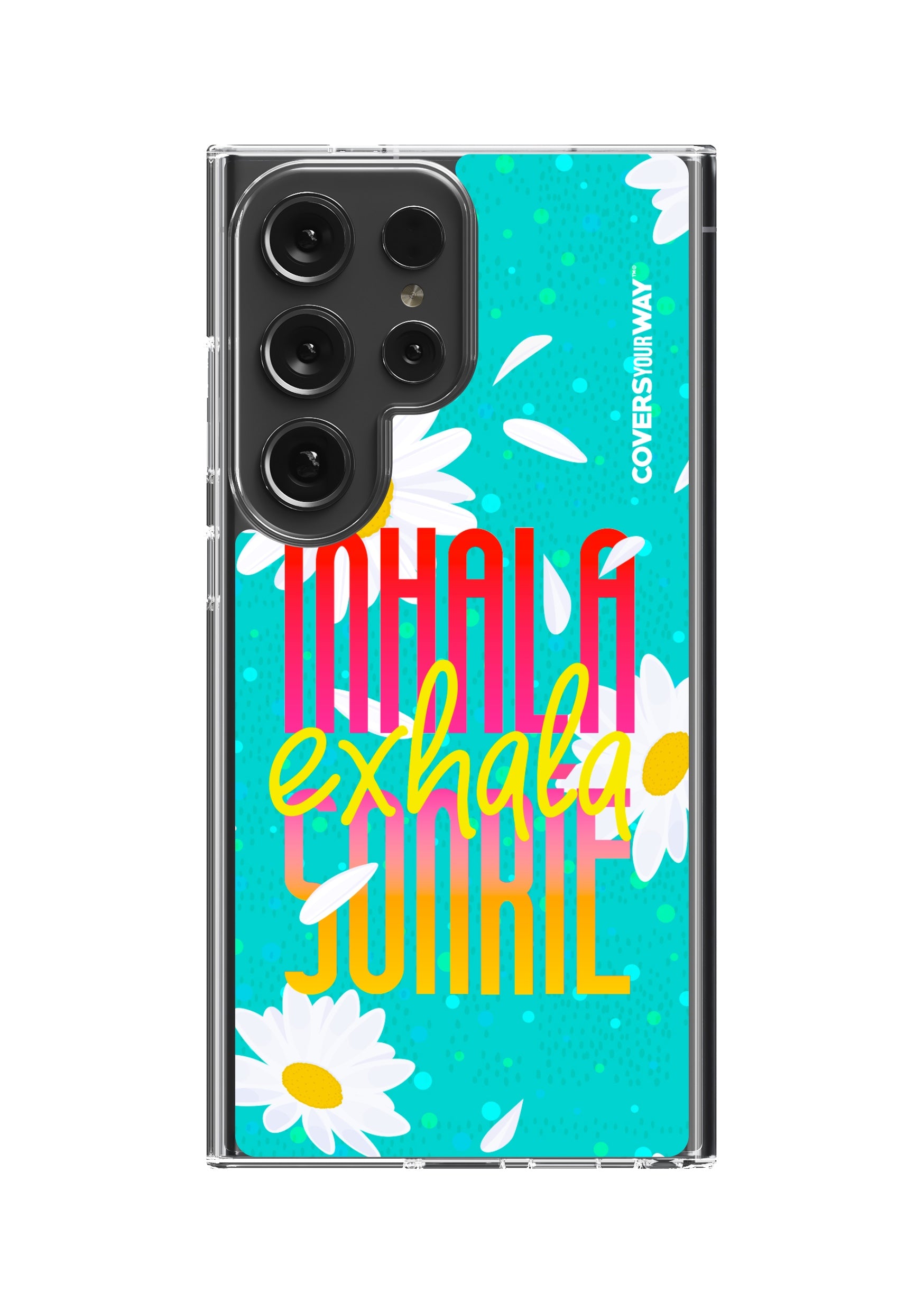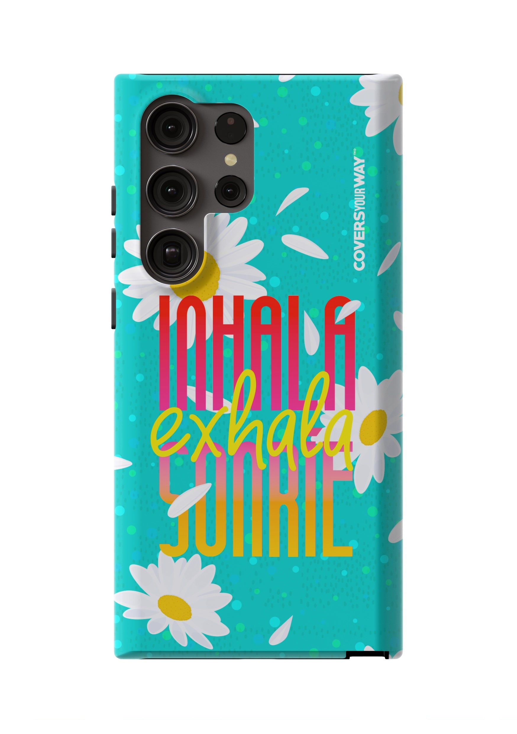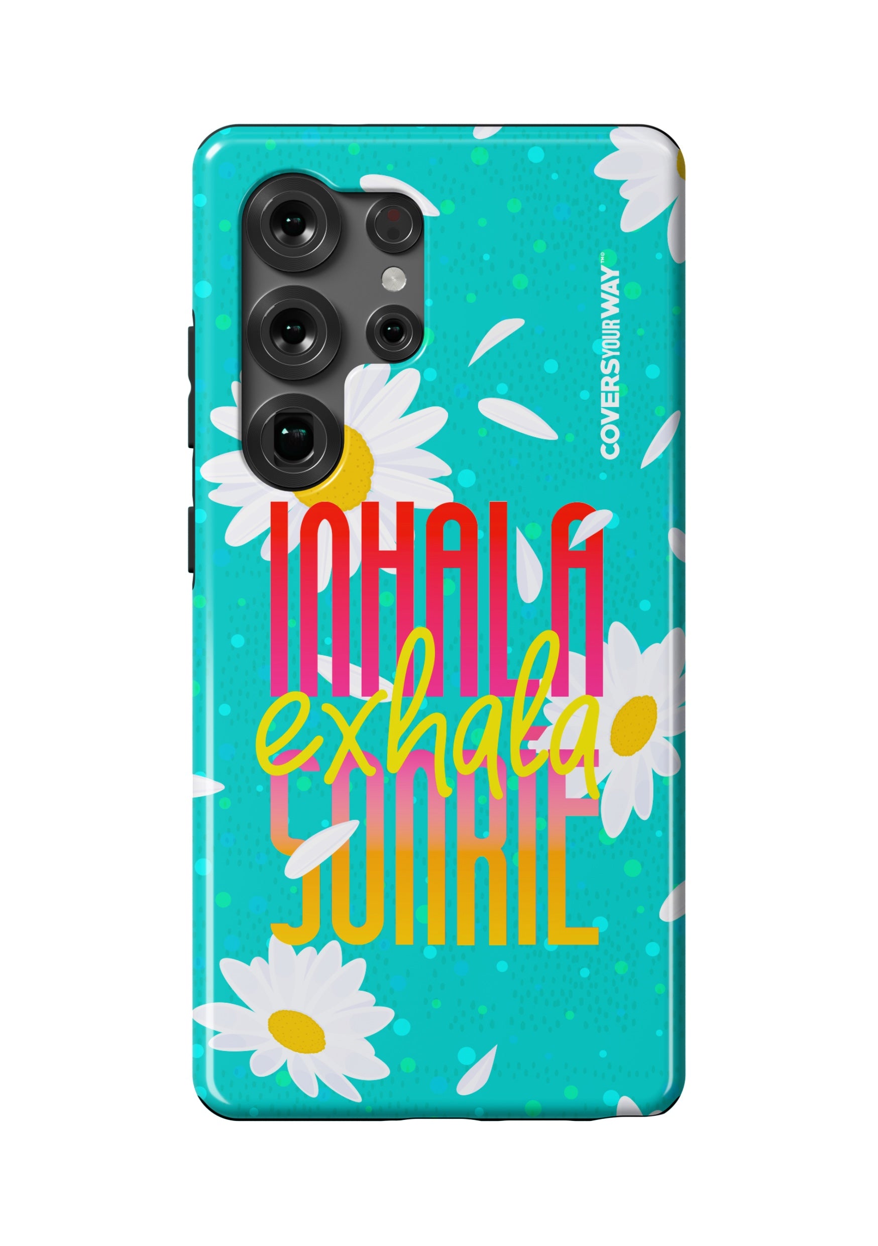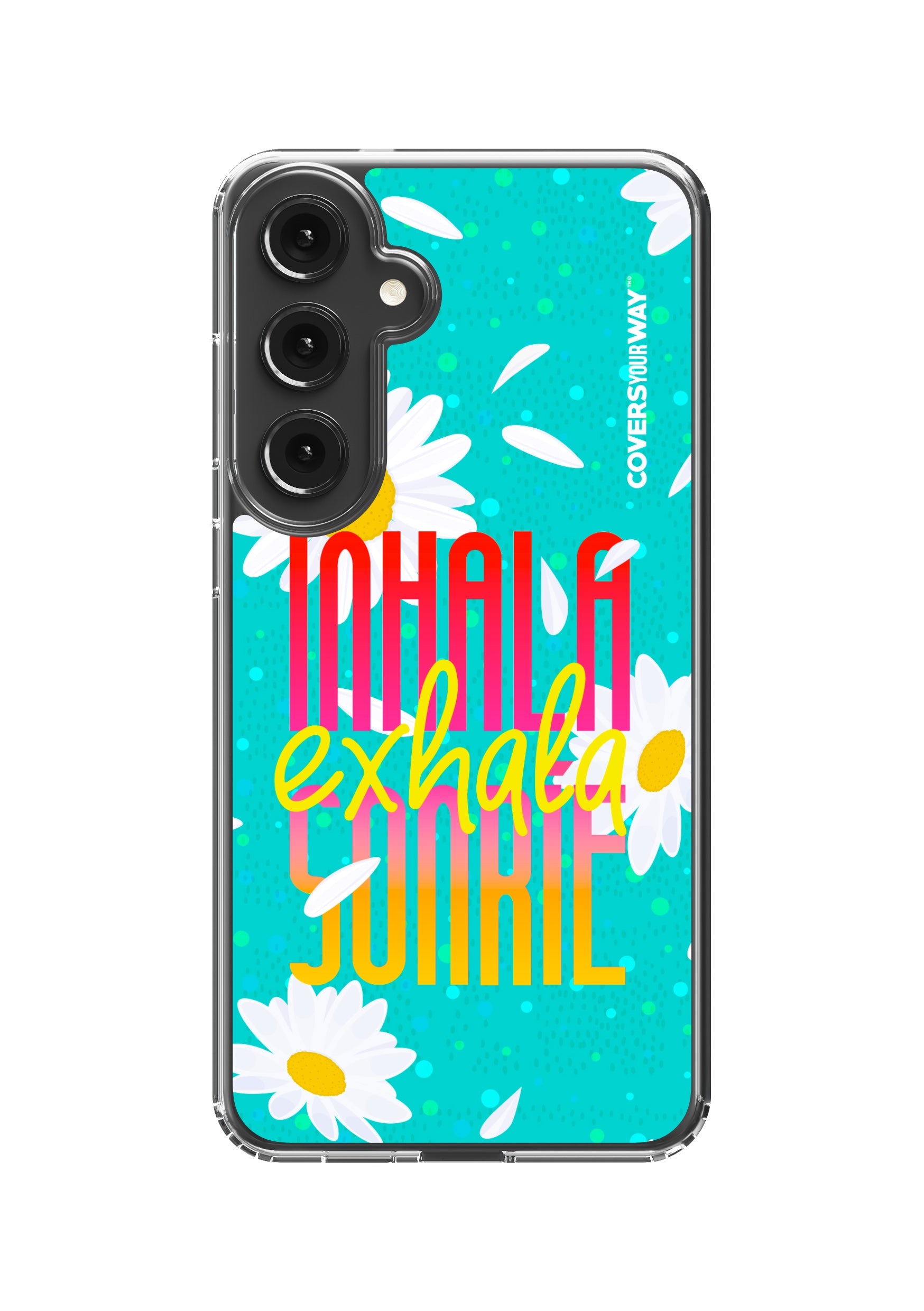 Protector de celular con diseño exclusivo que transmite calma y bienestar. Presenta la frase "Inhala Exhala Sonríe" en una tipografía suave, acompañada de un fondo relajante con tonos pastel. Ideal para quienes buscan equilibrio y serenidad en su día a día. Brinda protección confiable contra golpes y rayaduras.