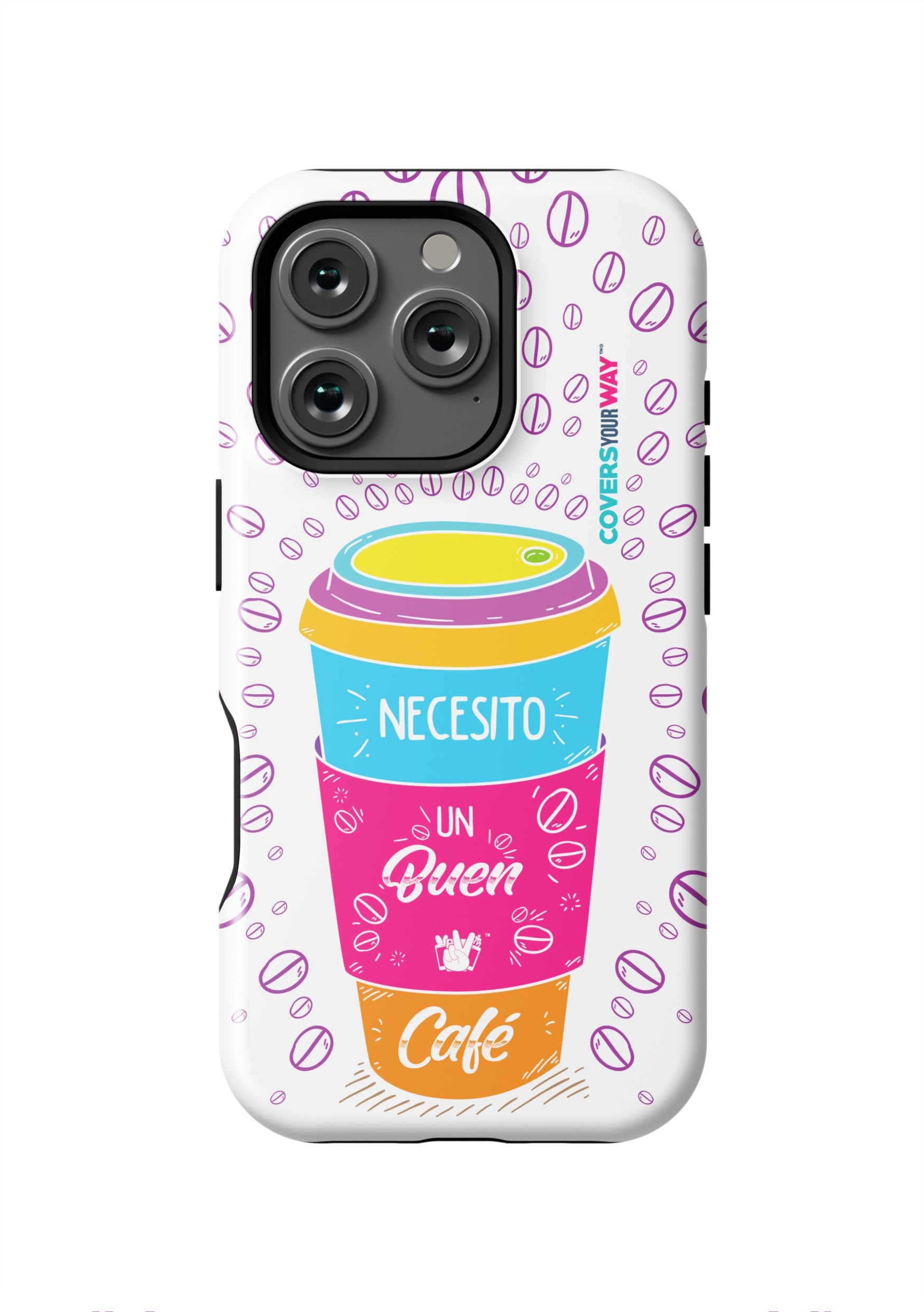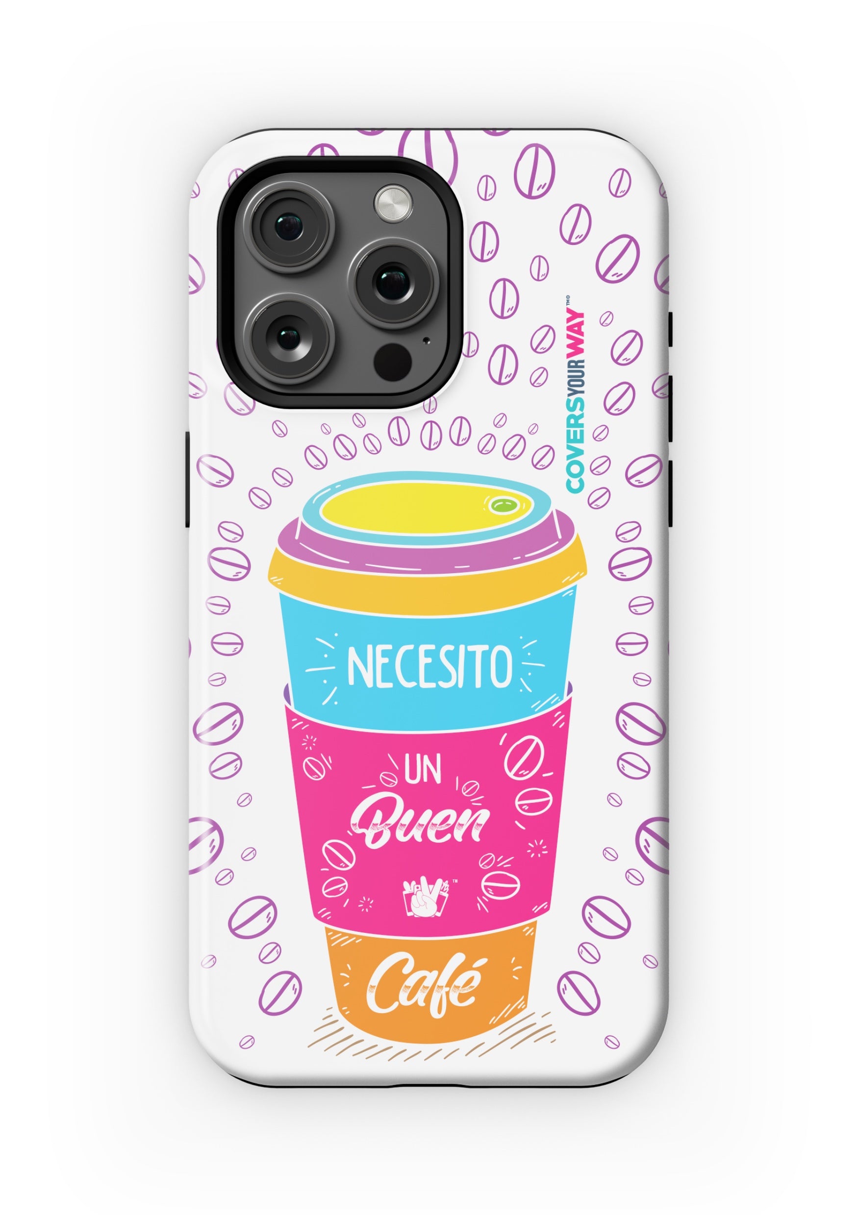 This phone case features an exclusive design with the phrase "Necesito un buen café" in a warm, inviting font, set against a colorful background that evokes the experience of enjoying coffee. Perfect for coffee lovers, it combines style and personality, made from durable materials that protect your device while expressing a daily passion.