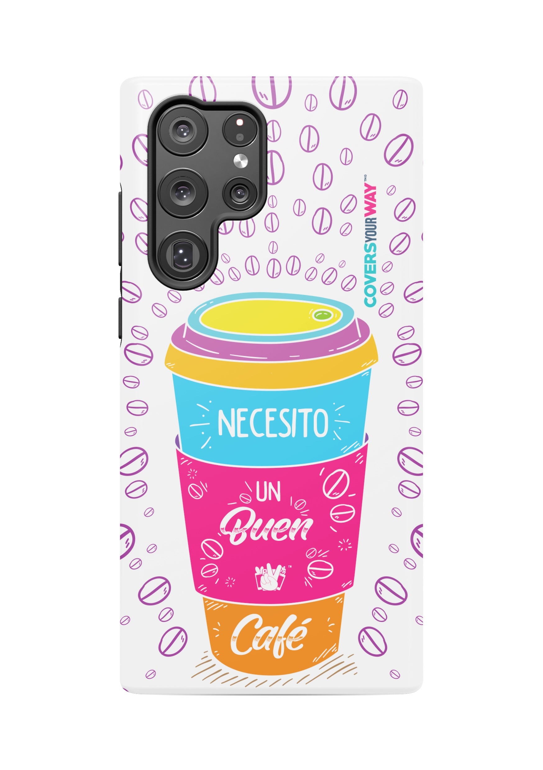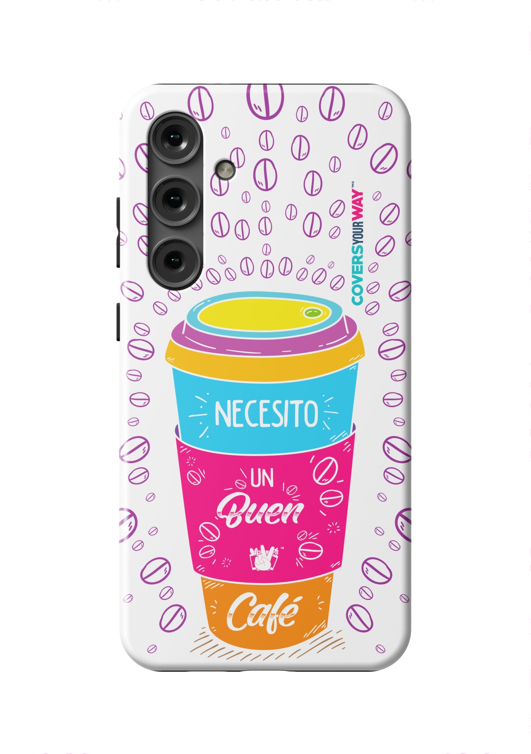 This phone case features an exclusive design with the phrase "Necesito un buen café" in a warm, inviting font, set against a colorful background that evokes the experience of enjoying coffee. Perfect for coffee lovers, it combines style and personality, made from durable materials that protect your device while expressing a daily passion.