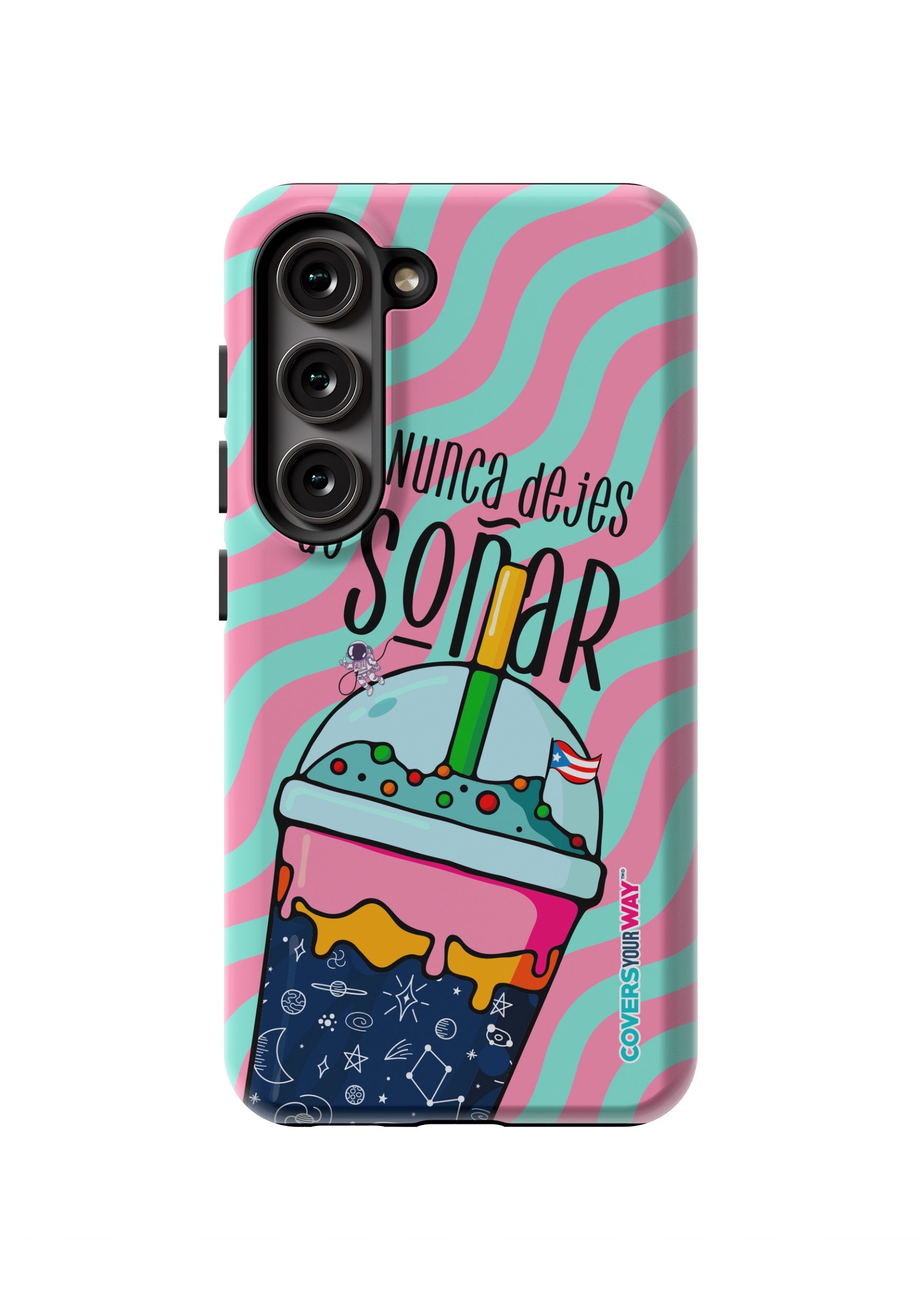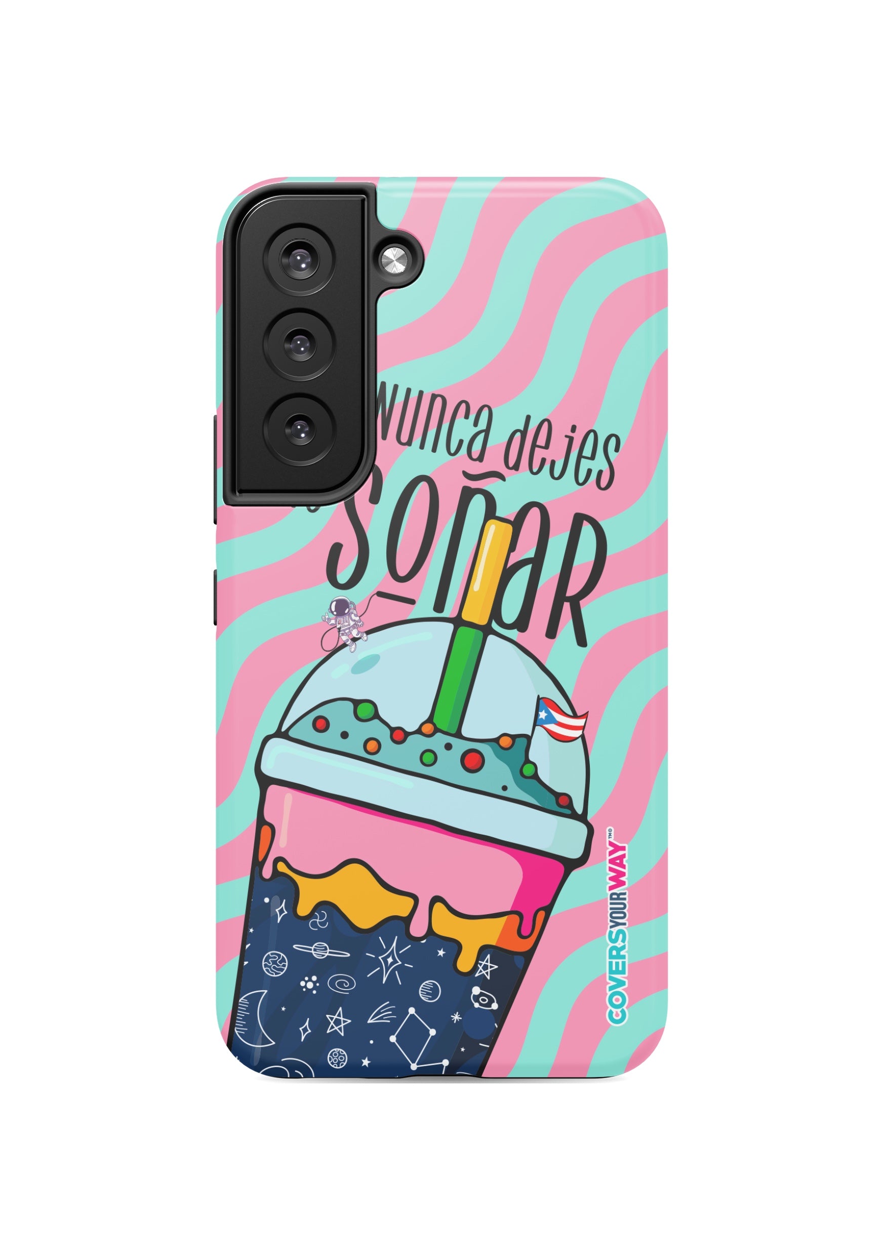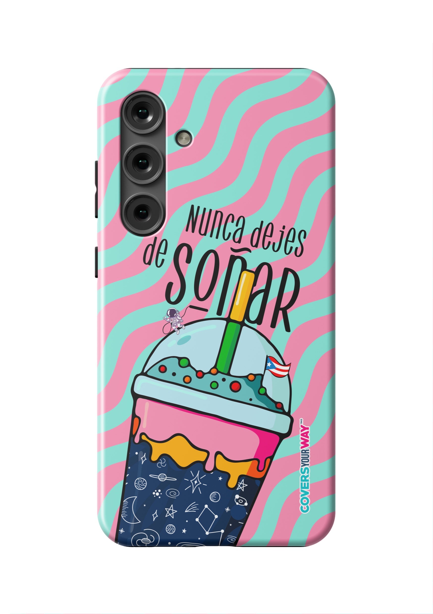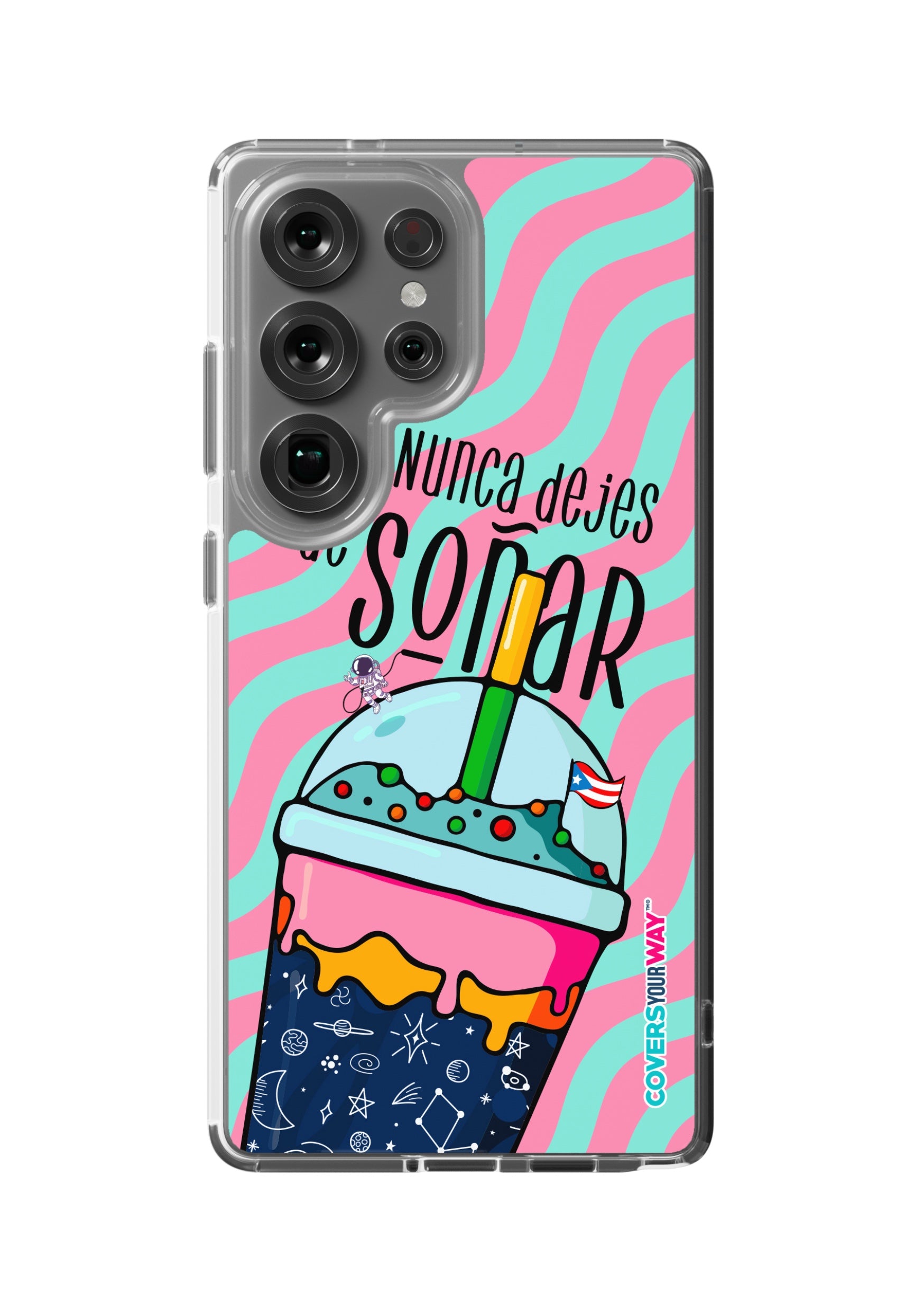 Exclusive phone case that inspires hope and creativity. It features the phrase "Nunca dejes de soñar" in delicate typography, accompanied by soft space-themed illustrations. Perfect for dreamers at heart. Provides reliable protection against bumps and scratches.