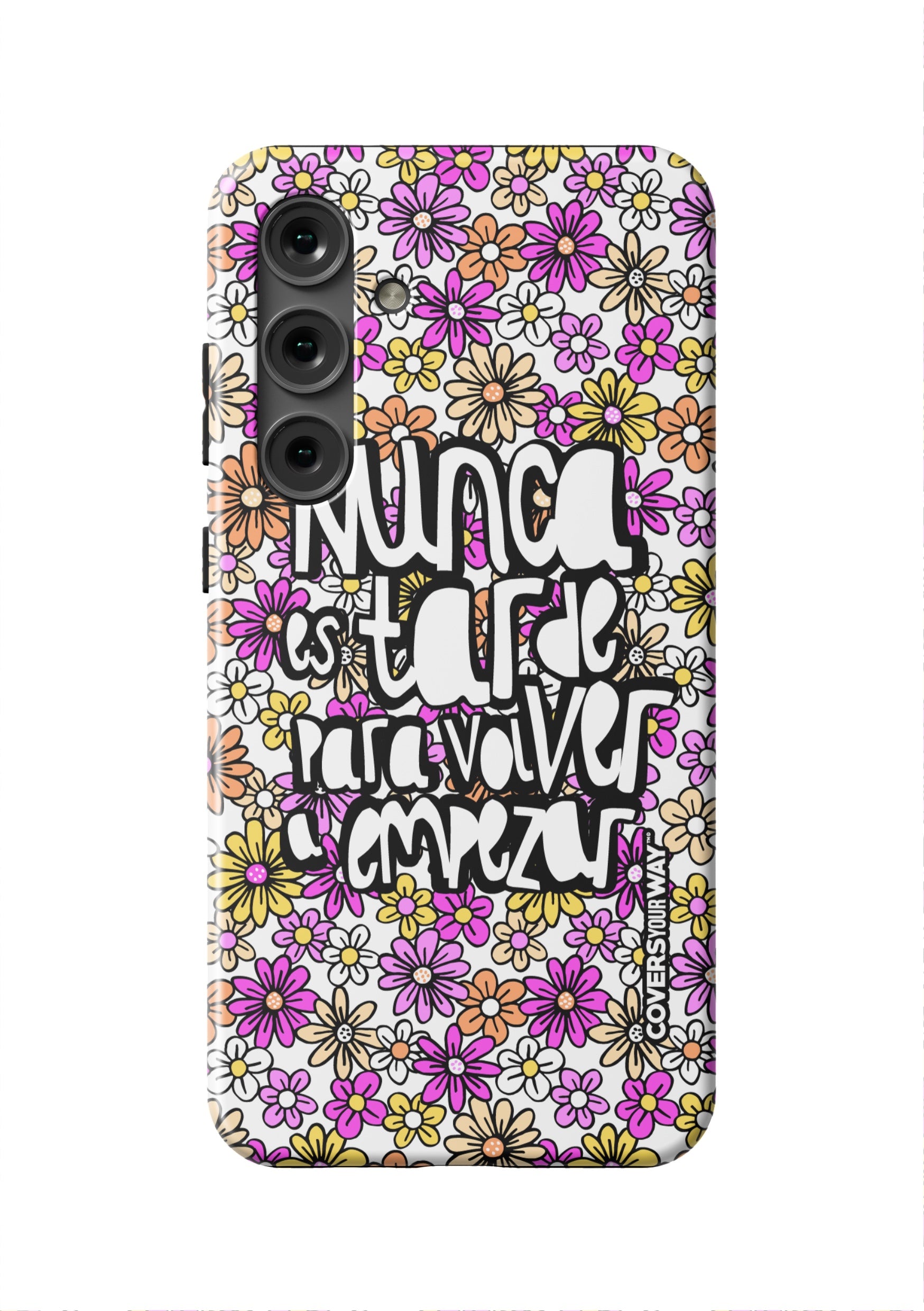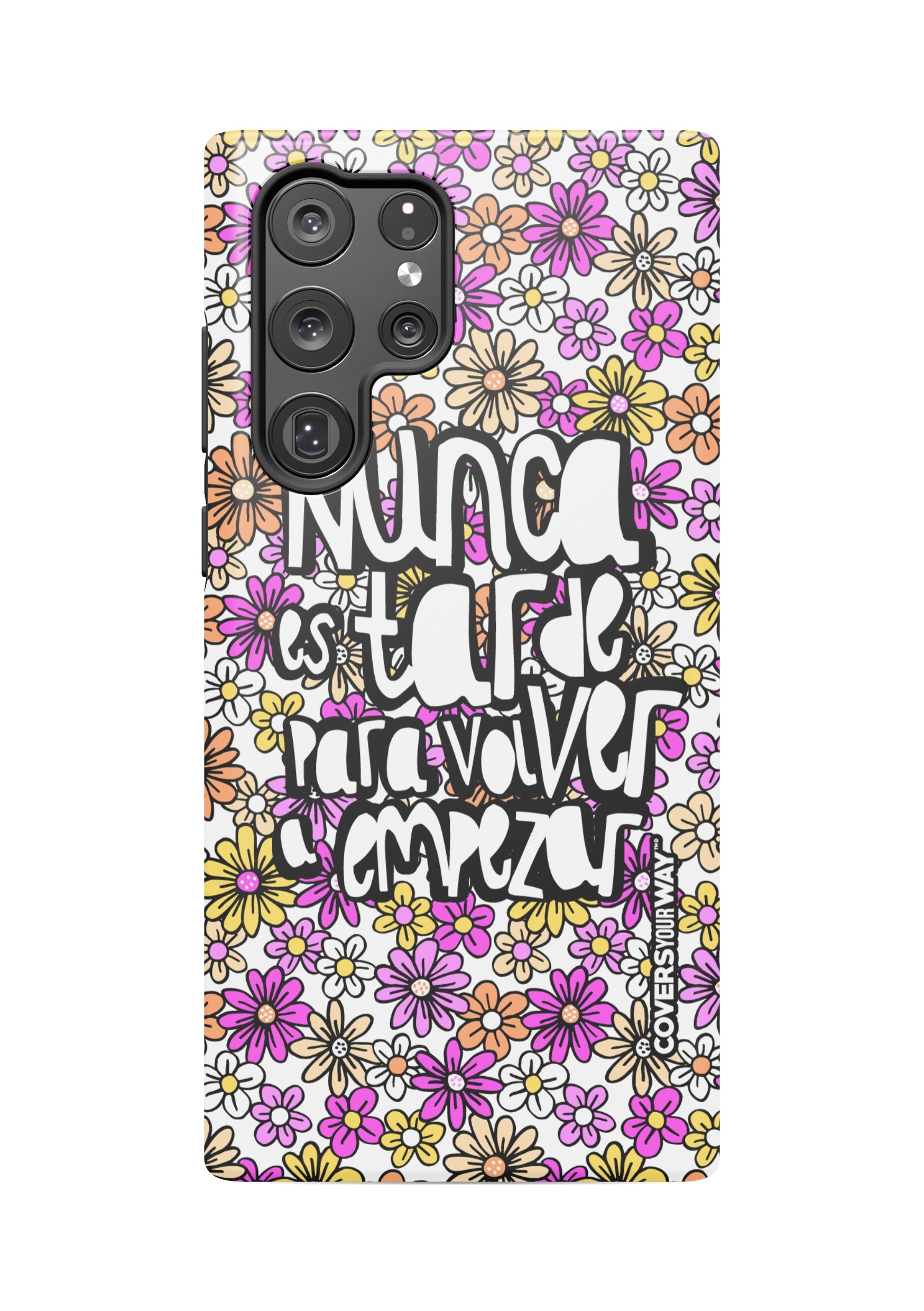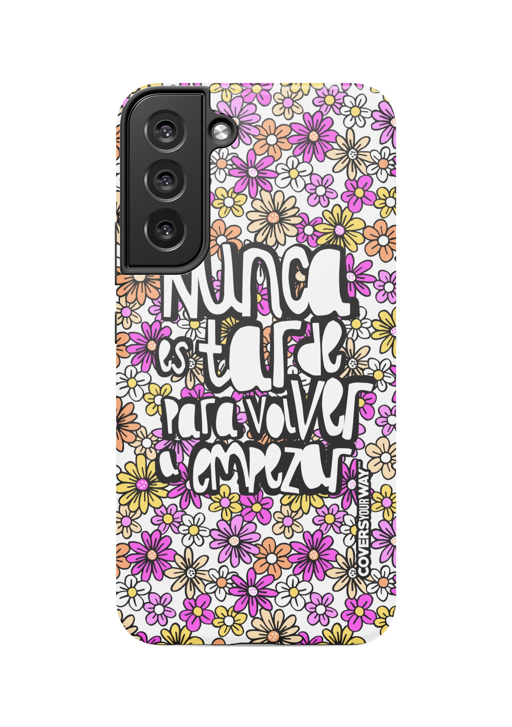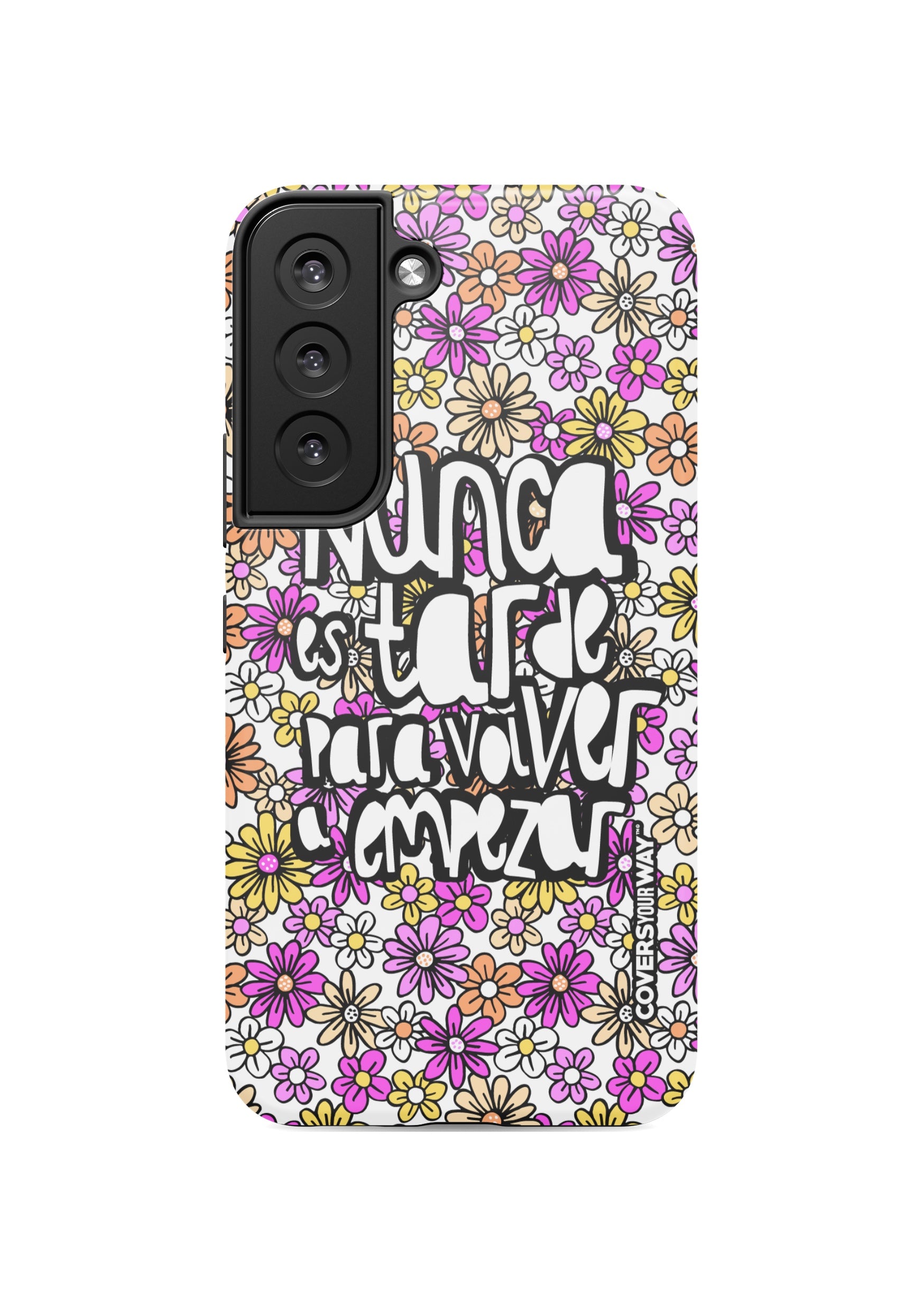 Refresh your style and energy with this durable phone case, designed with the phrase "Nunca Es Tarde Para Volver a Empezar". It protects your device from bumps and scratches while sharing a message of hope, second chances, and new beginnings.