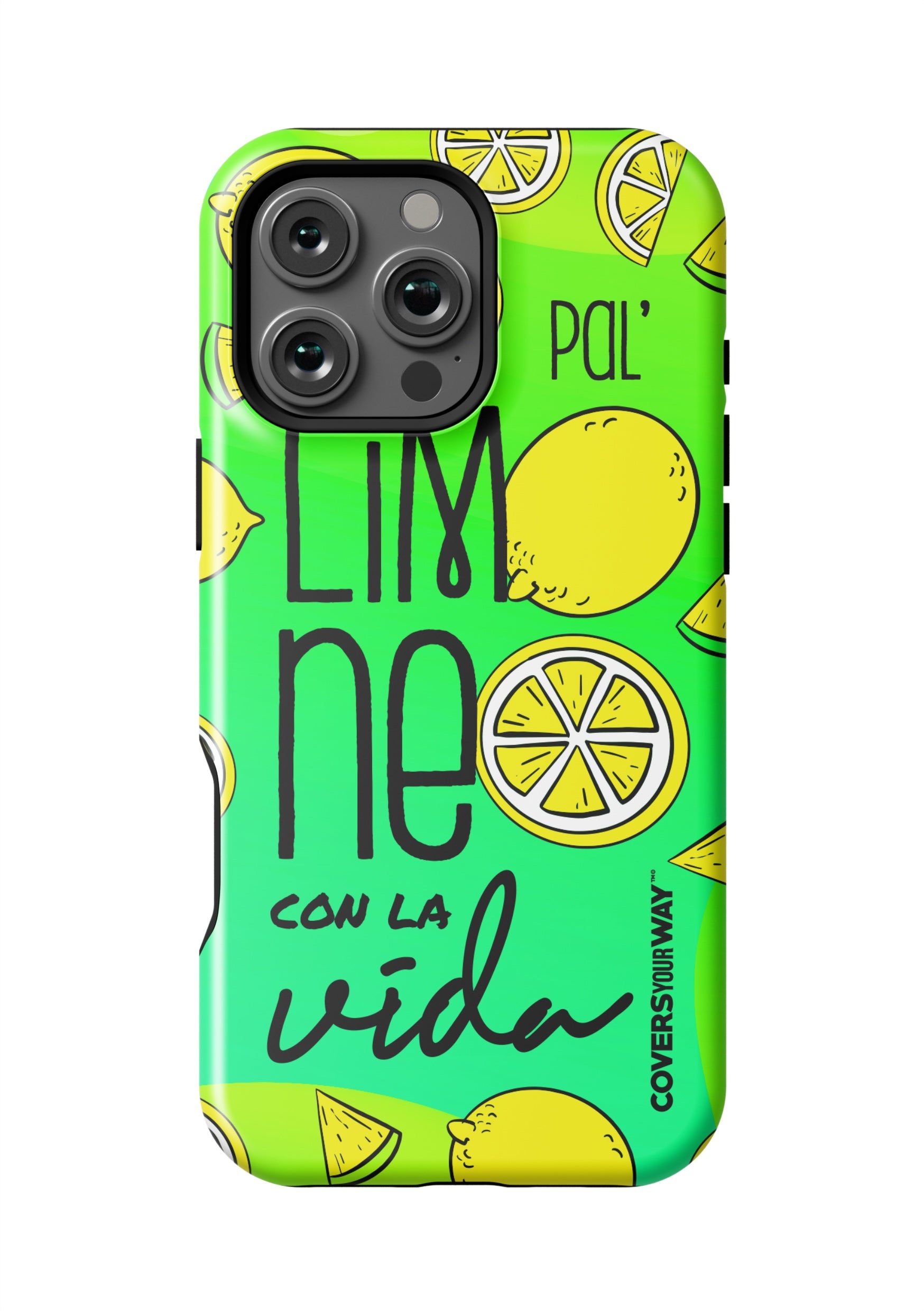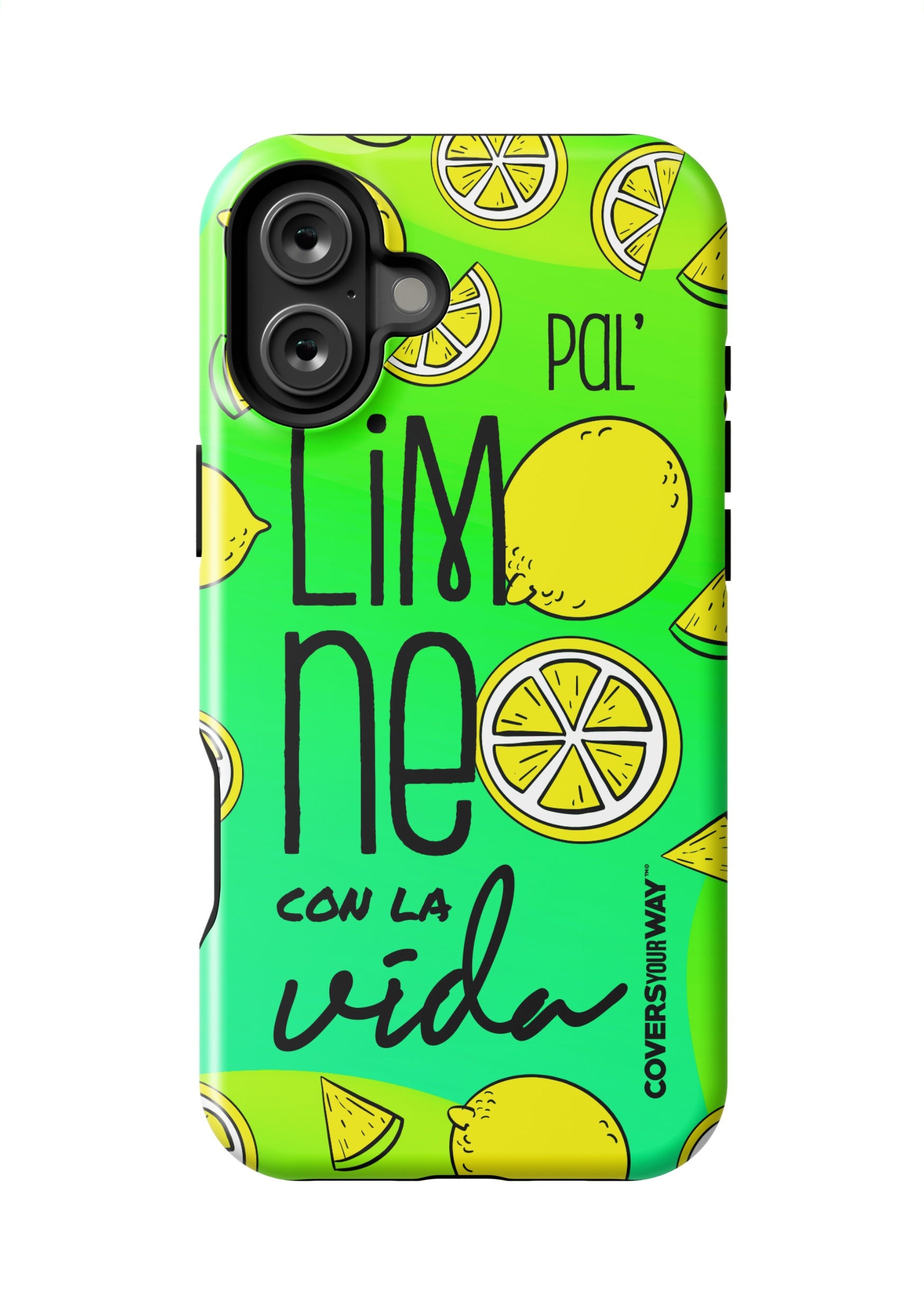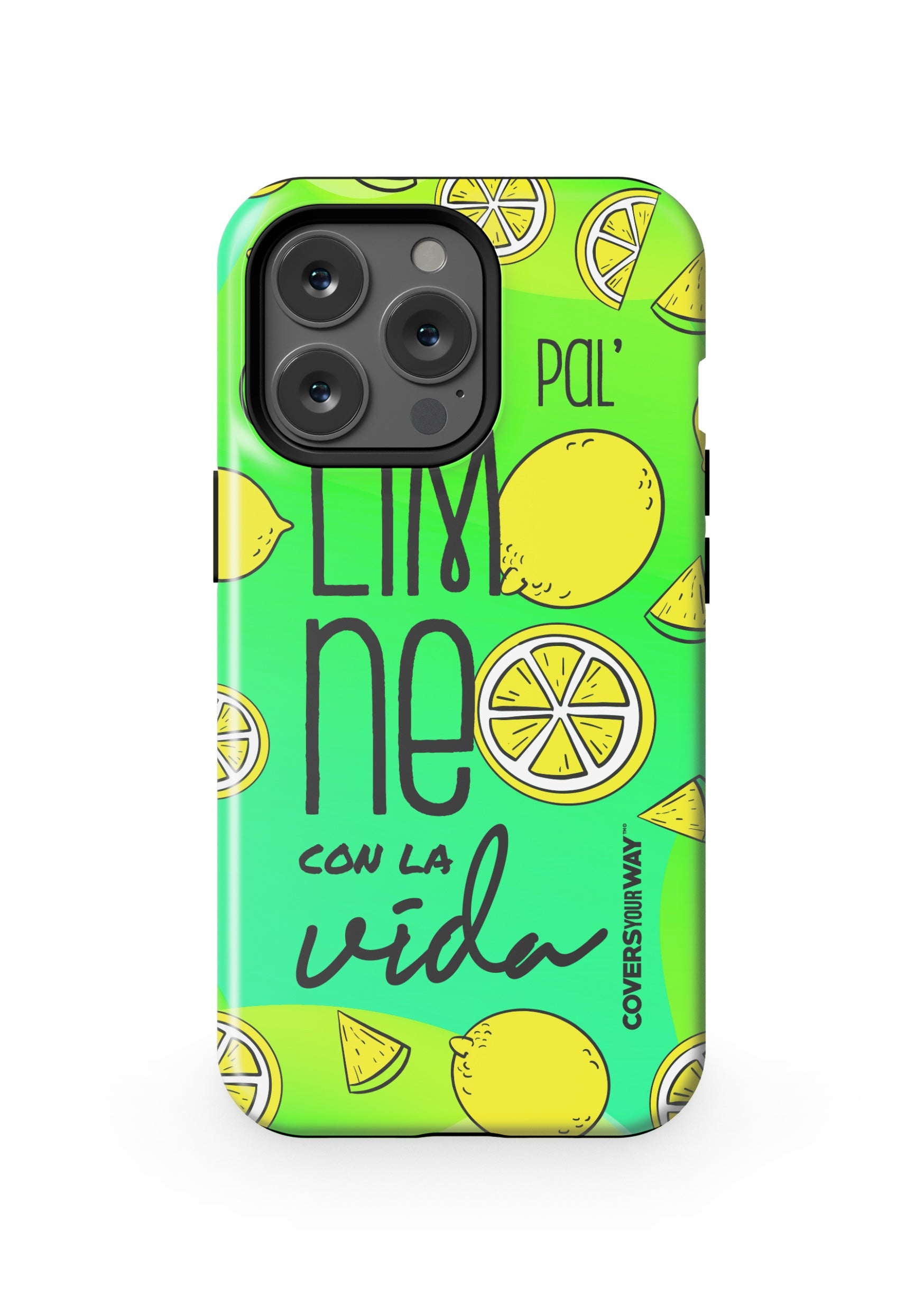 Exclusive phone case with a cheerful, tropical-inspired design. It features the phrase "Pal' limoneo con la vida" in playful typography, paired with vibrant lemon-themed illustrations. Perfect for those who enjoy life with freshness and good humor. Provides reliable protection against bumps and scratches.