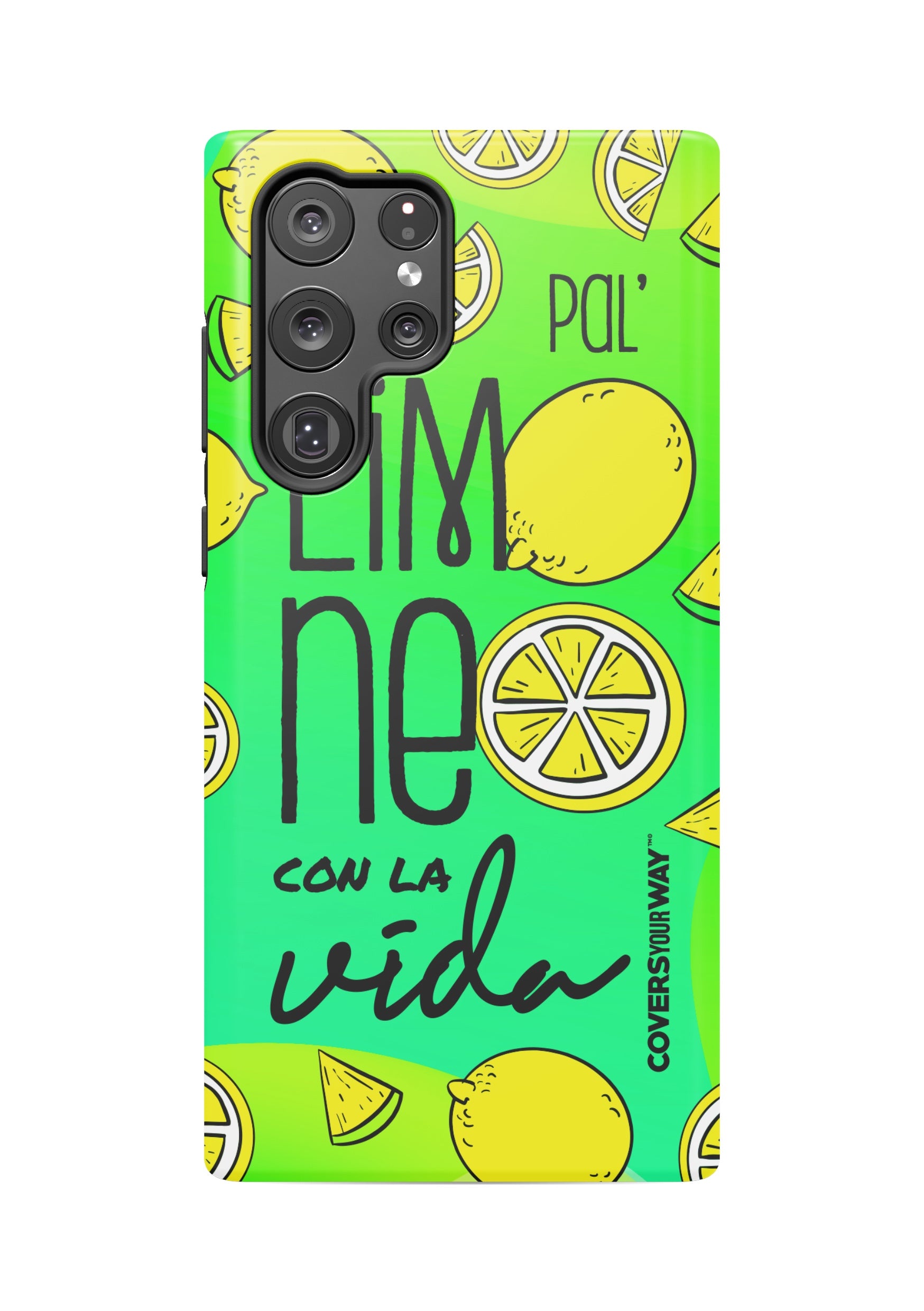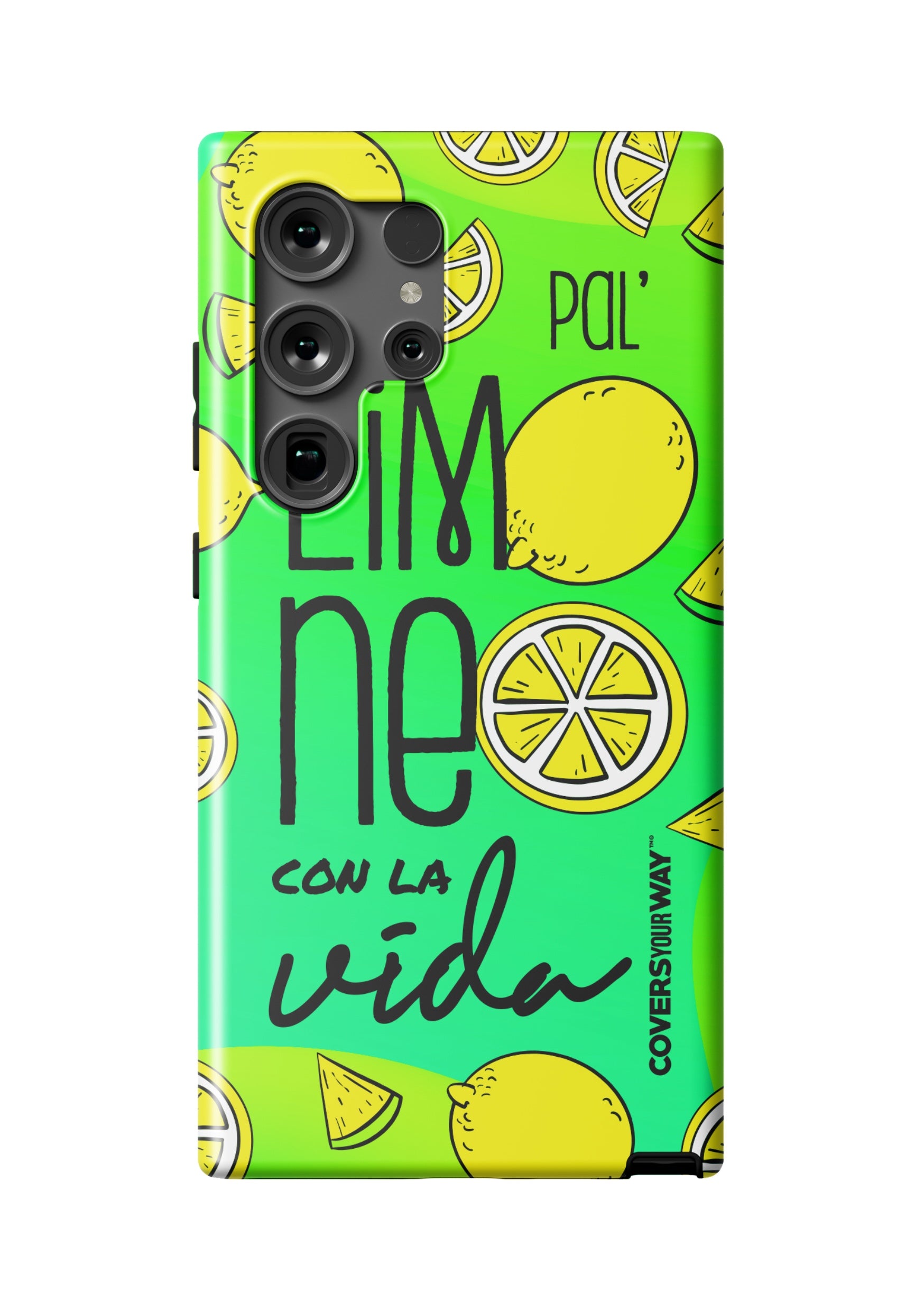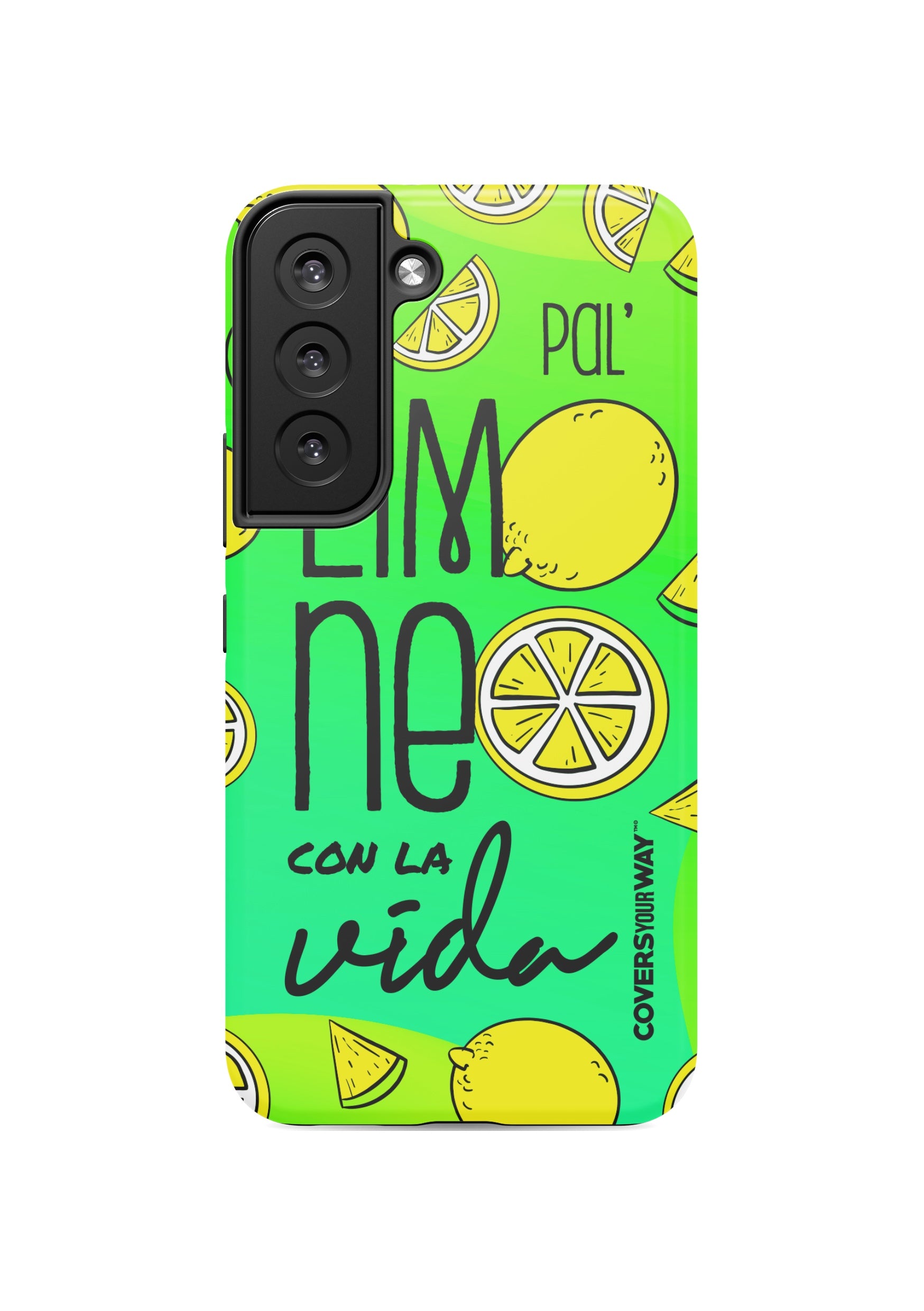 Exclusive phone case with a cheerful, tropical-inspired design. It features the phrase "Pal' limoneo con la vida" in playful typography, paired with vibrant lemon-themed illustrations. Perfect for those who enjoy life with freshness and good humor. Provides reliable protection against bumps and scratches.