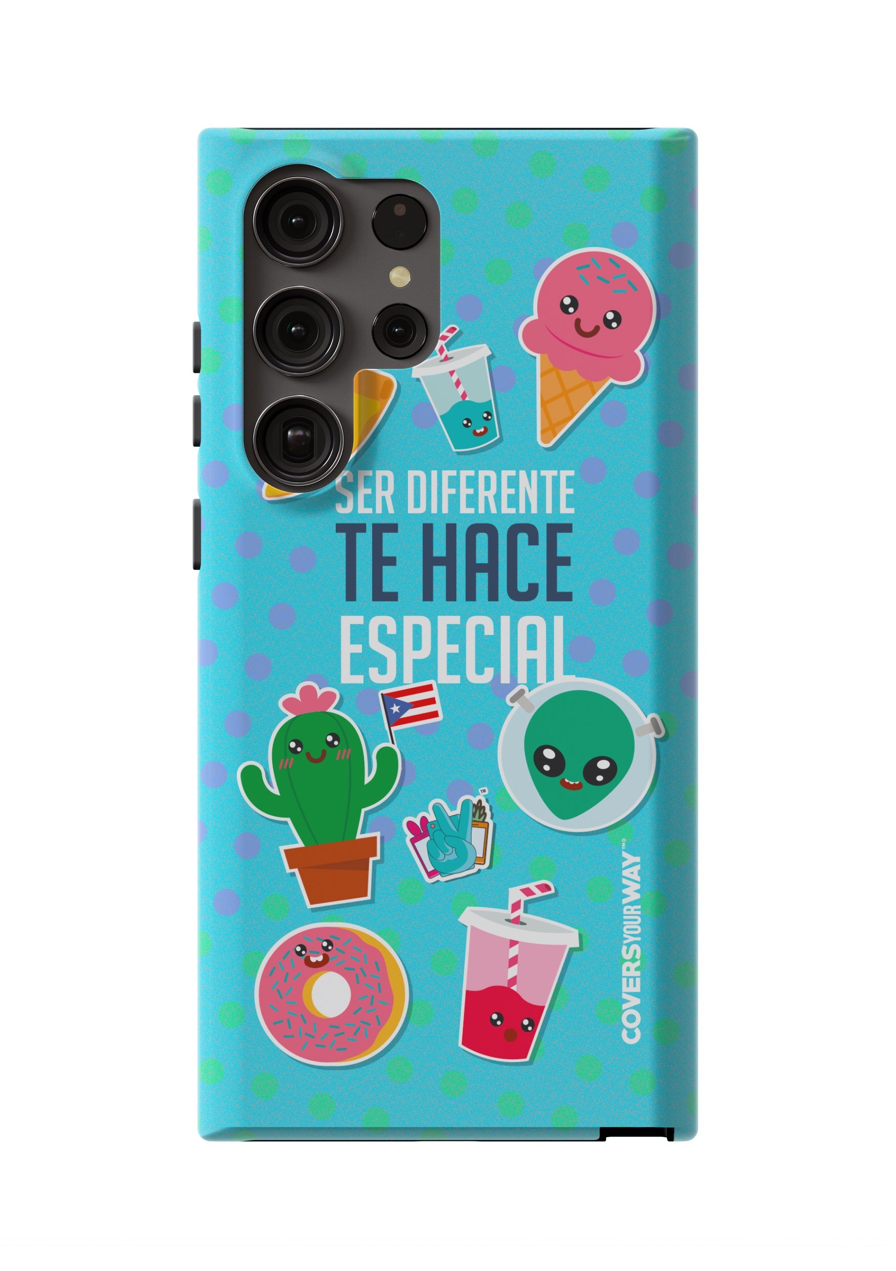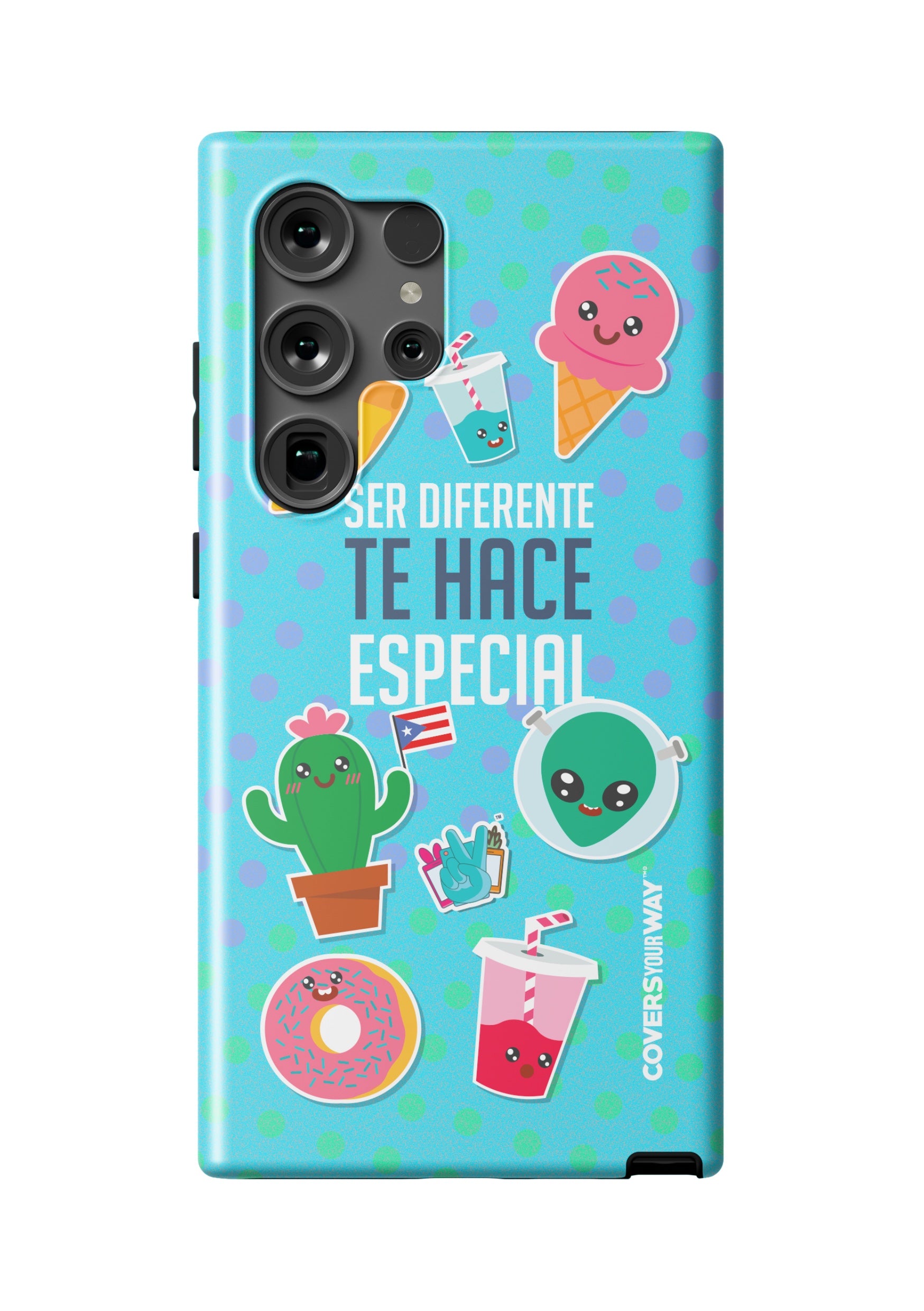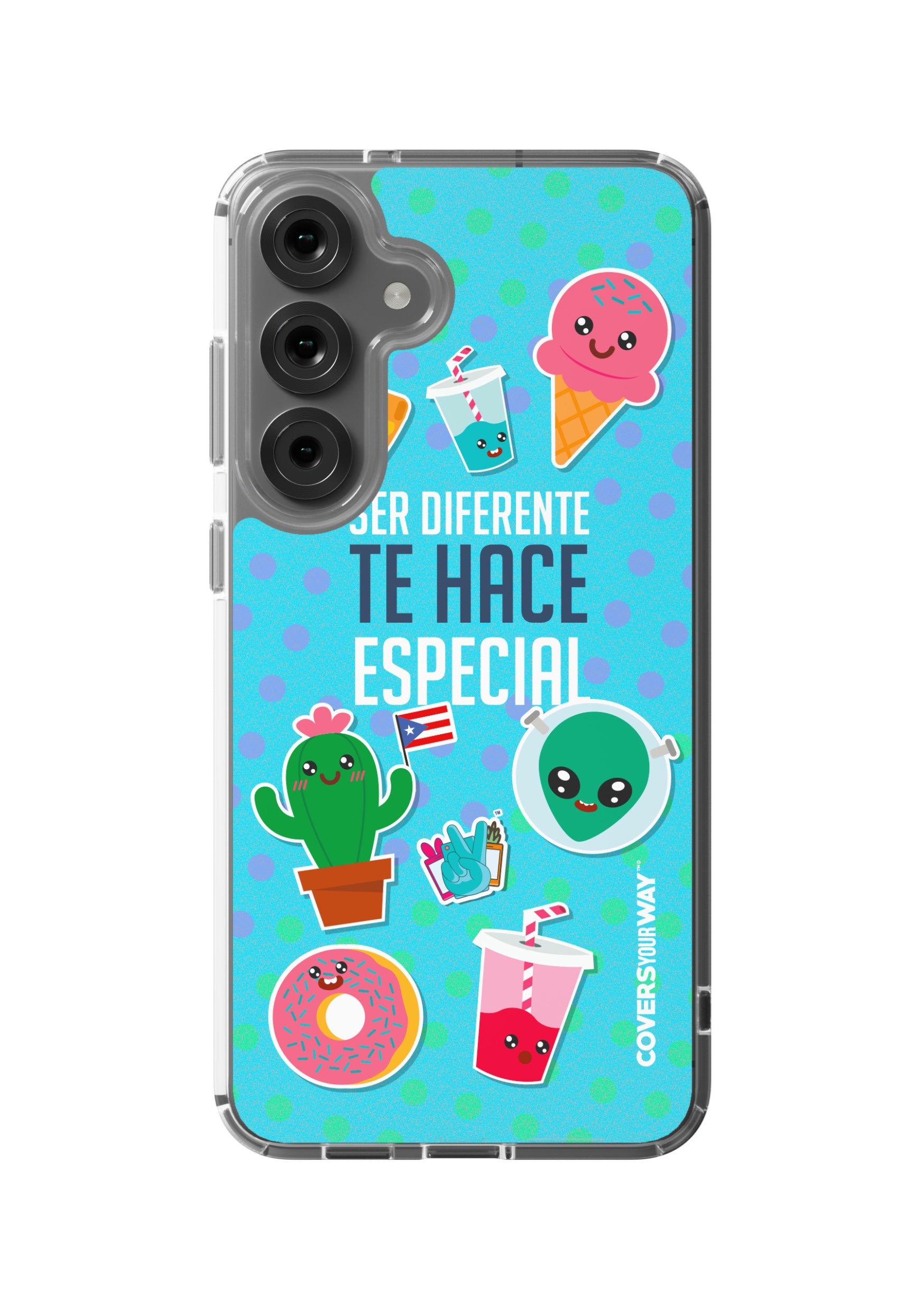 Protector de celular con diseño exclusivo que celebra la autenticidad. Luce un fondo colorido y la frase "Ser diferente te hace especial" en una tipografía llamativa, ideal para quienes se atreven a destacar. Ofrece protección resistente contra golpes y rayaduras.