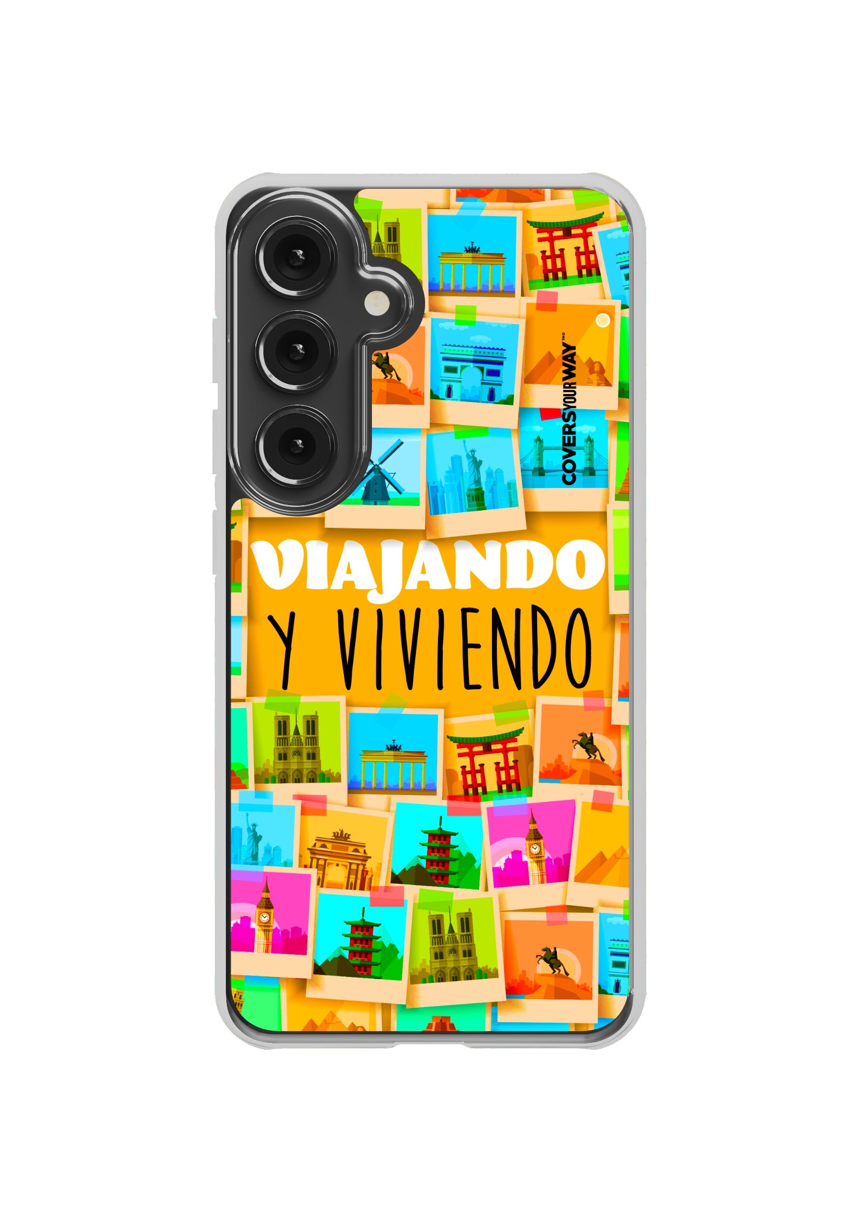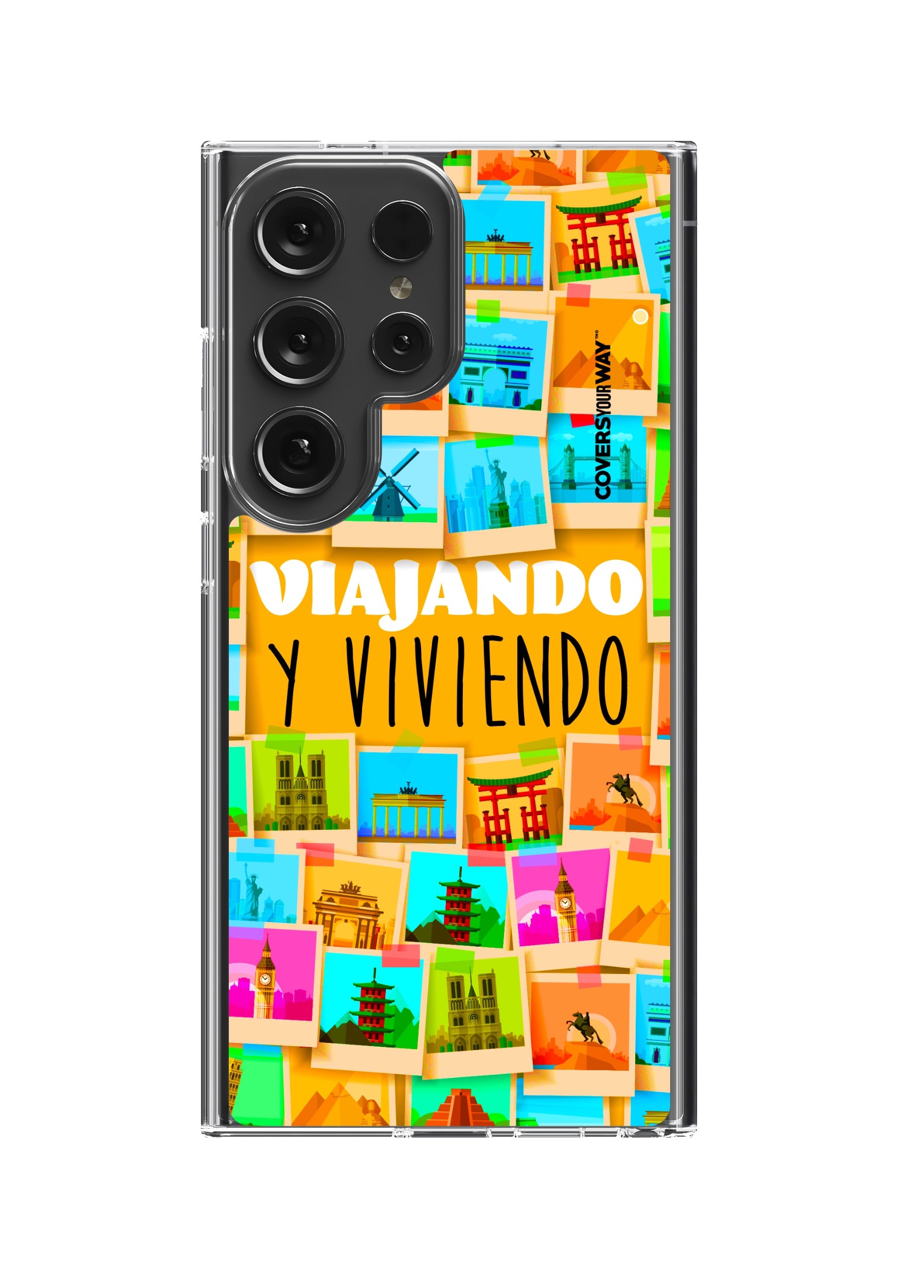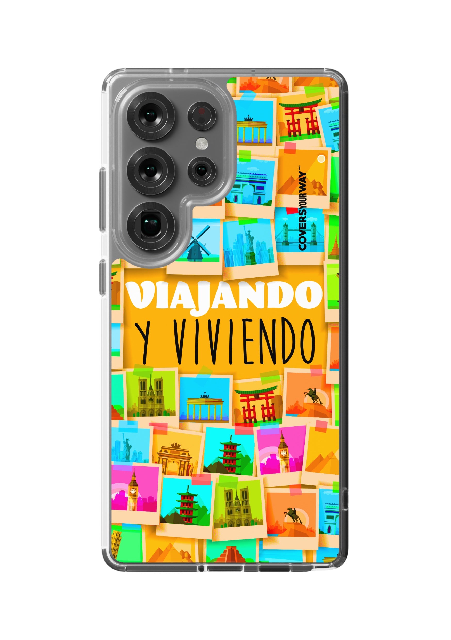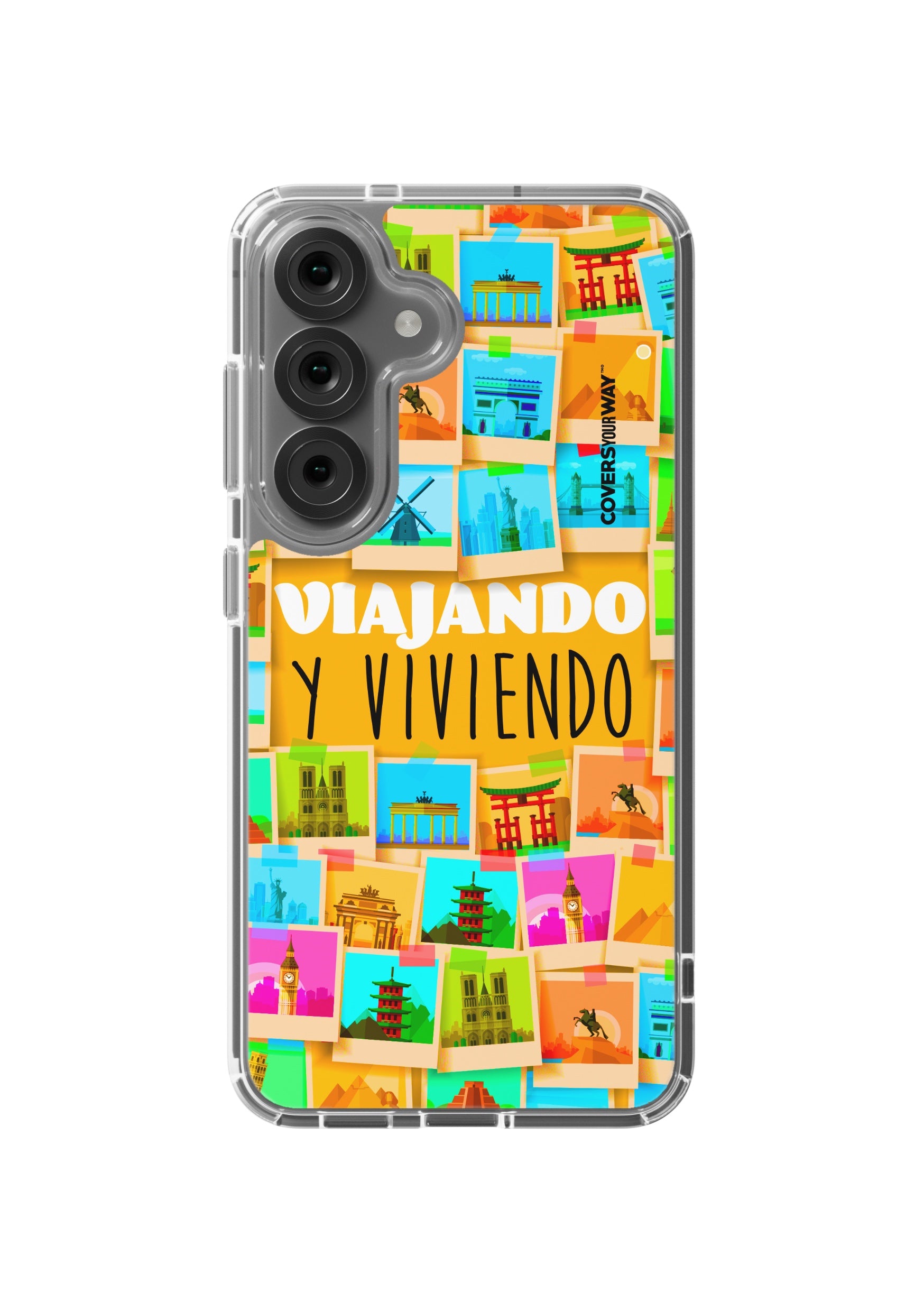 Este protector para celular presenta un diseño exclusivo con la frase "Viajando y viviendo" en una tipografía moderna y fluida, destacada sobre un fondo que evoca paisajes, mapas o elementos de viaje como maletas, aviones o caminos. Con una paleta de colores cálidos y aventureros, transmite libertad, movimiento y pasión por explorar. Fabricado con materiales resistentes, combina estilo, protección y el espíritu de quienes viven descubriendo el mundo.