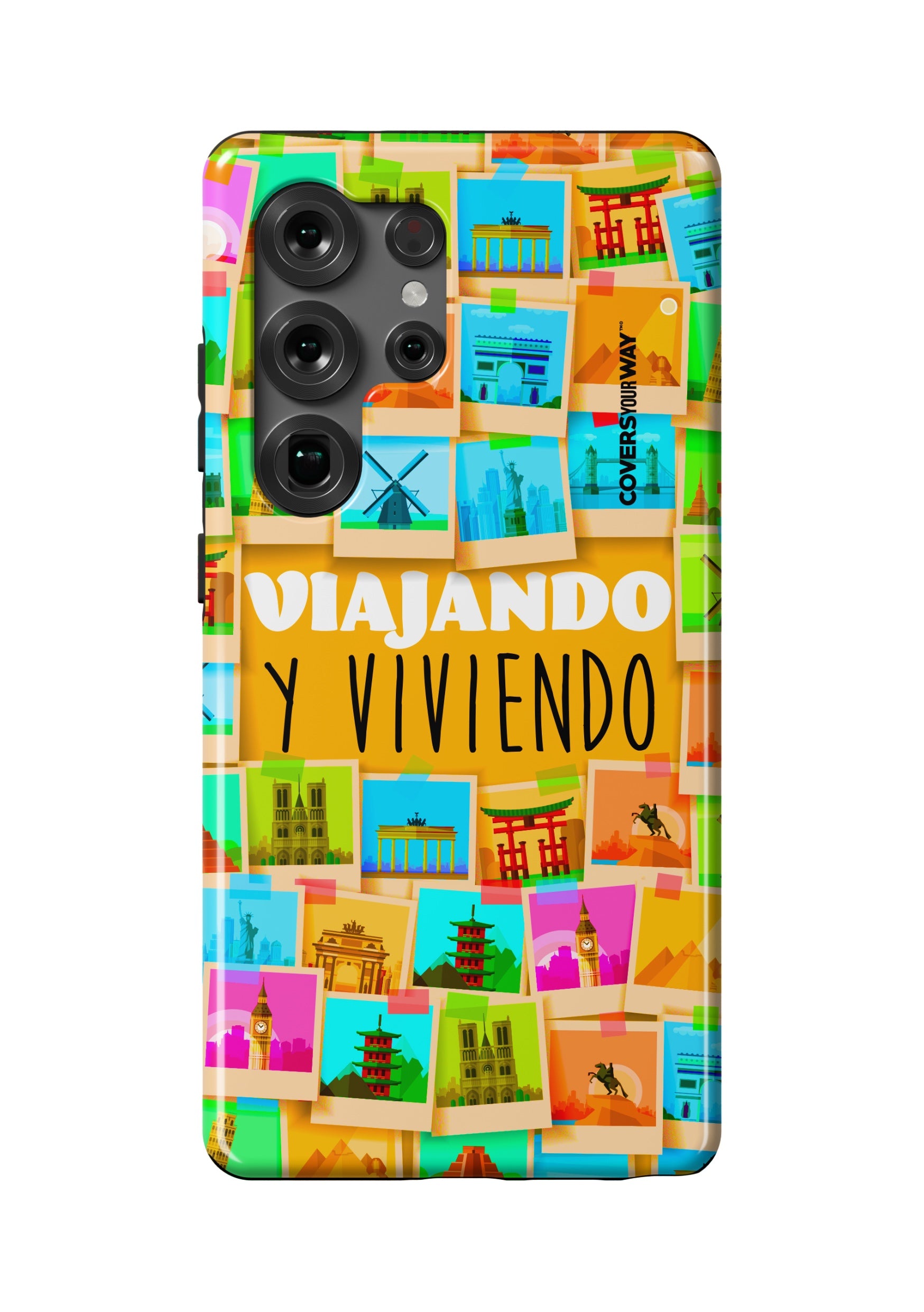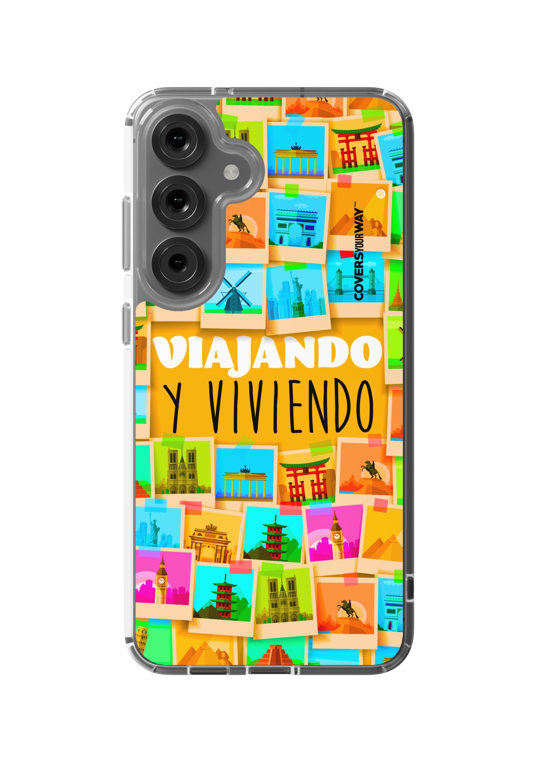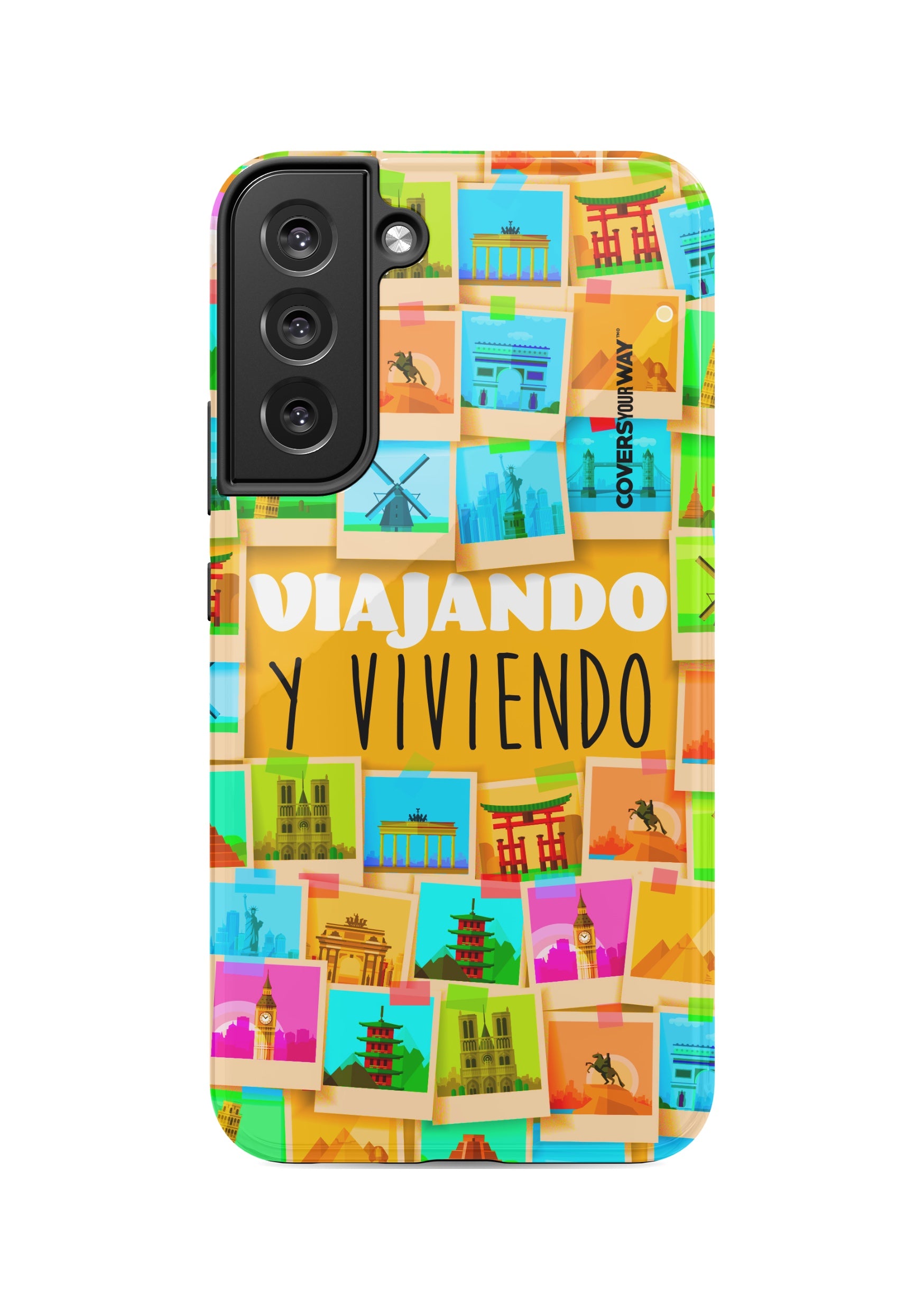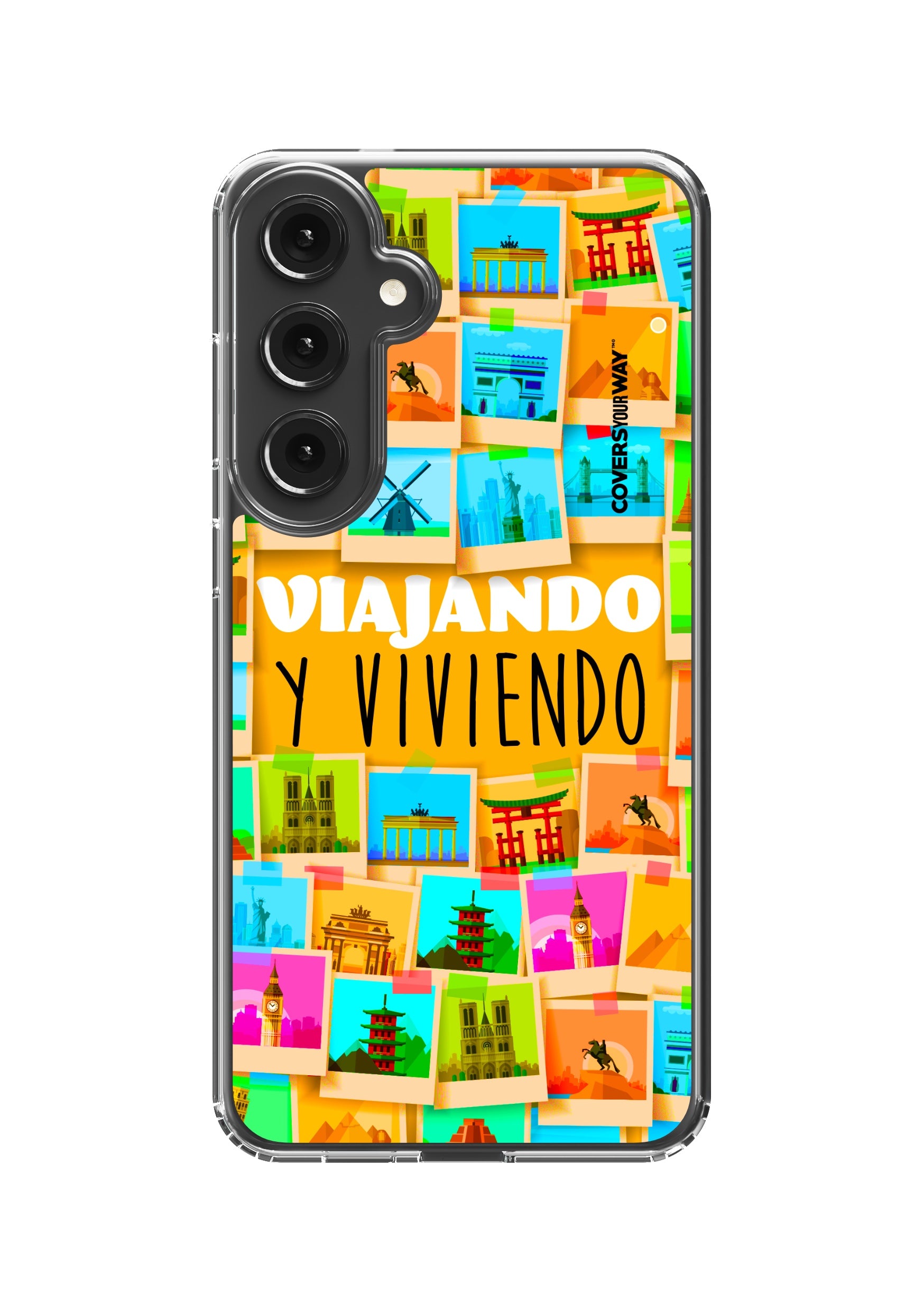 Este protector para celular presenta un diseño exclusivo con la frase "Viajando y viviendo" en una tipografía moderna y fluida, destacada sobre un fondo que evoca paisajes, mapas o elementos de viaje como maletas, aviones o caminos. Con una paleta de colores cálidos y aventureros, transmite libertad, movimiento y pasión por explorar. Fabricado con materiales resistentes, combina estilo, protección y el espíritu de quienes viven descubriendo el mundo.