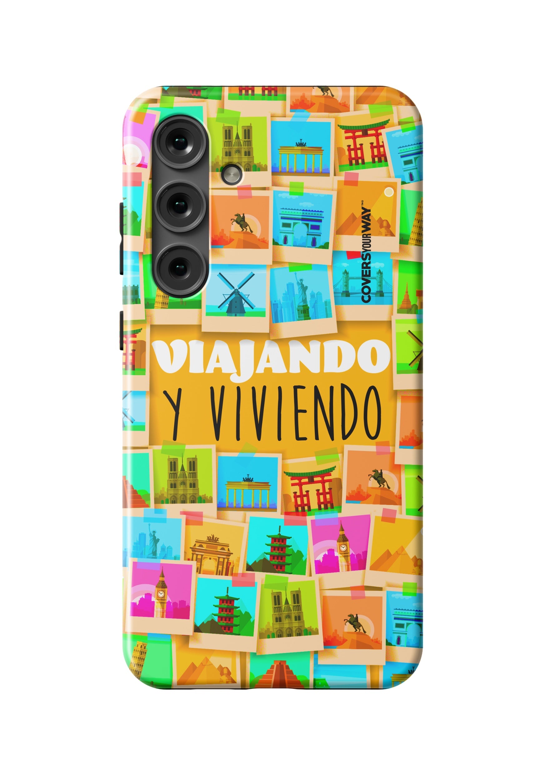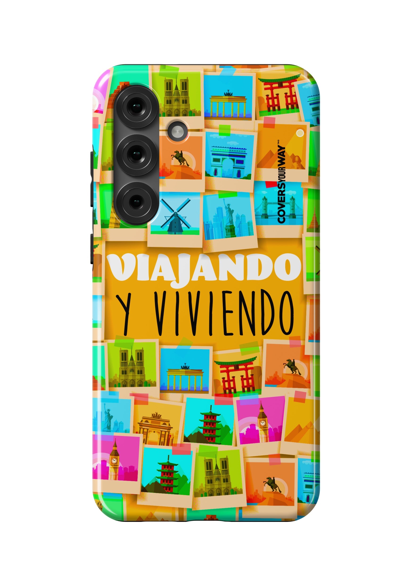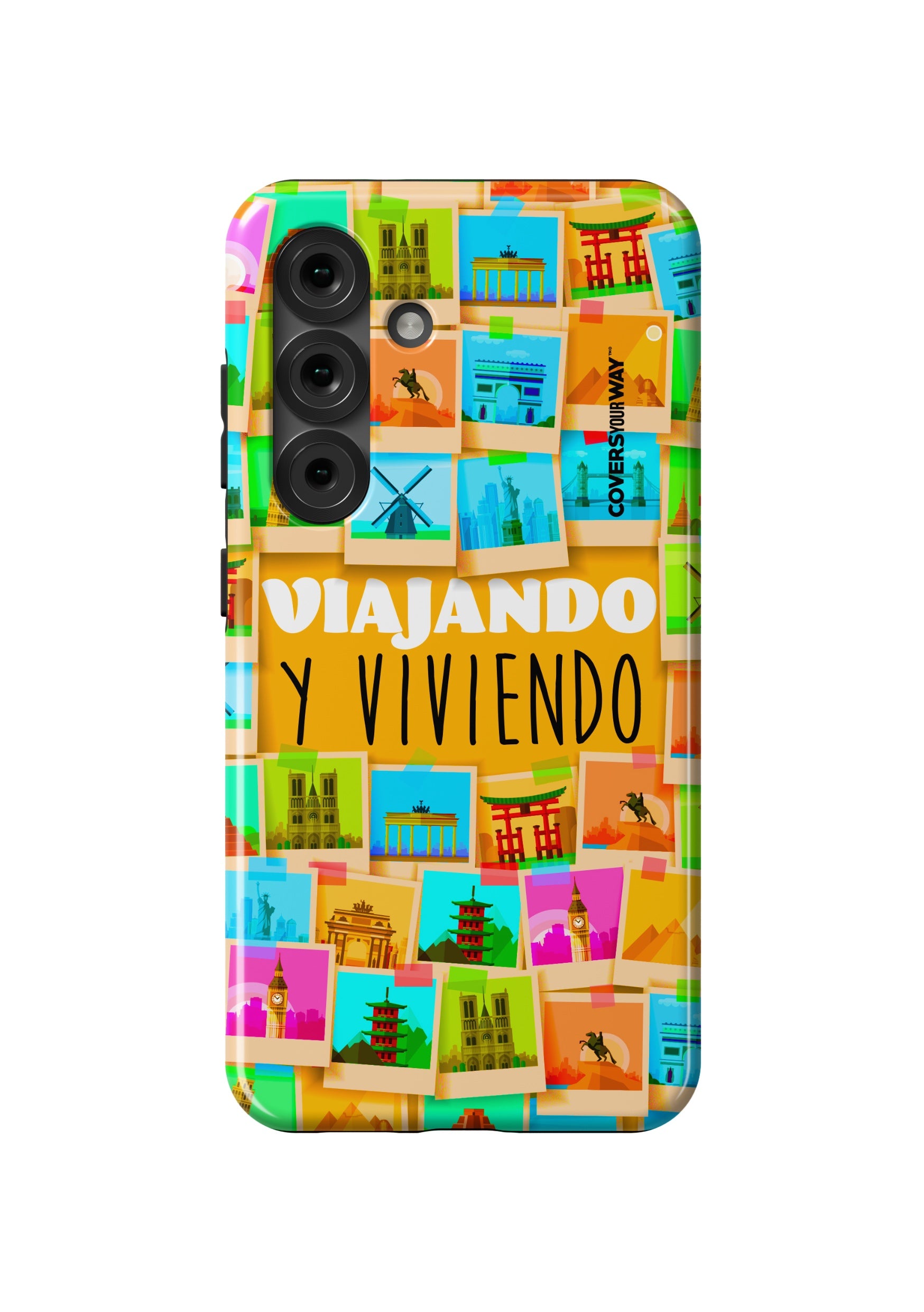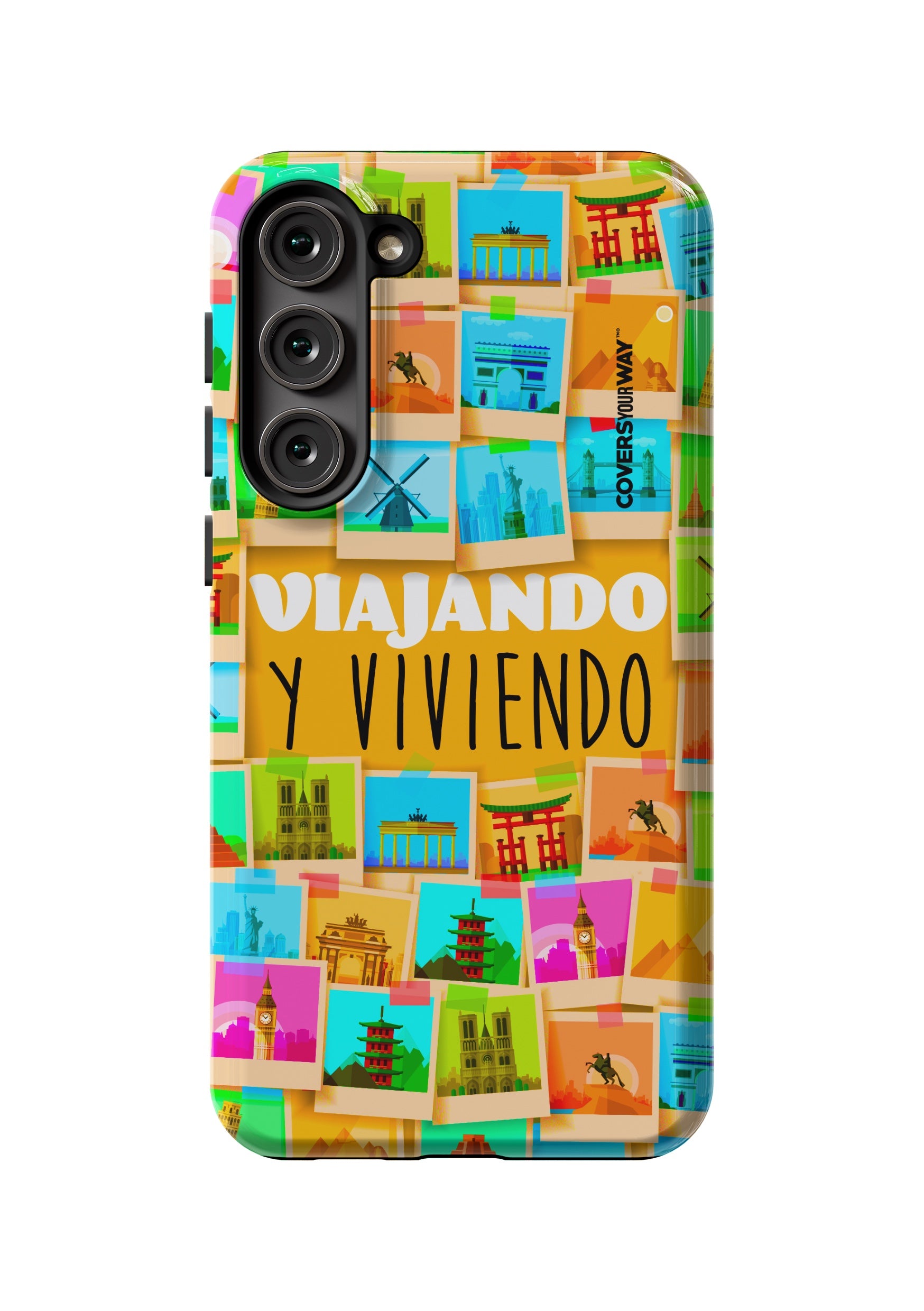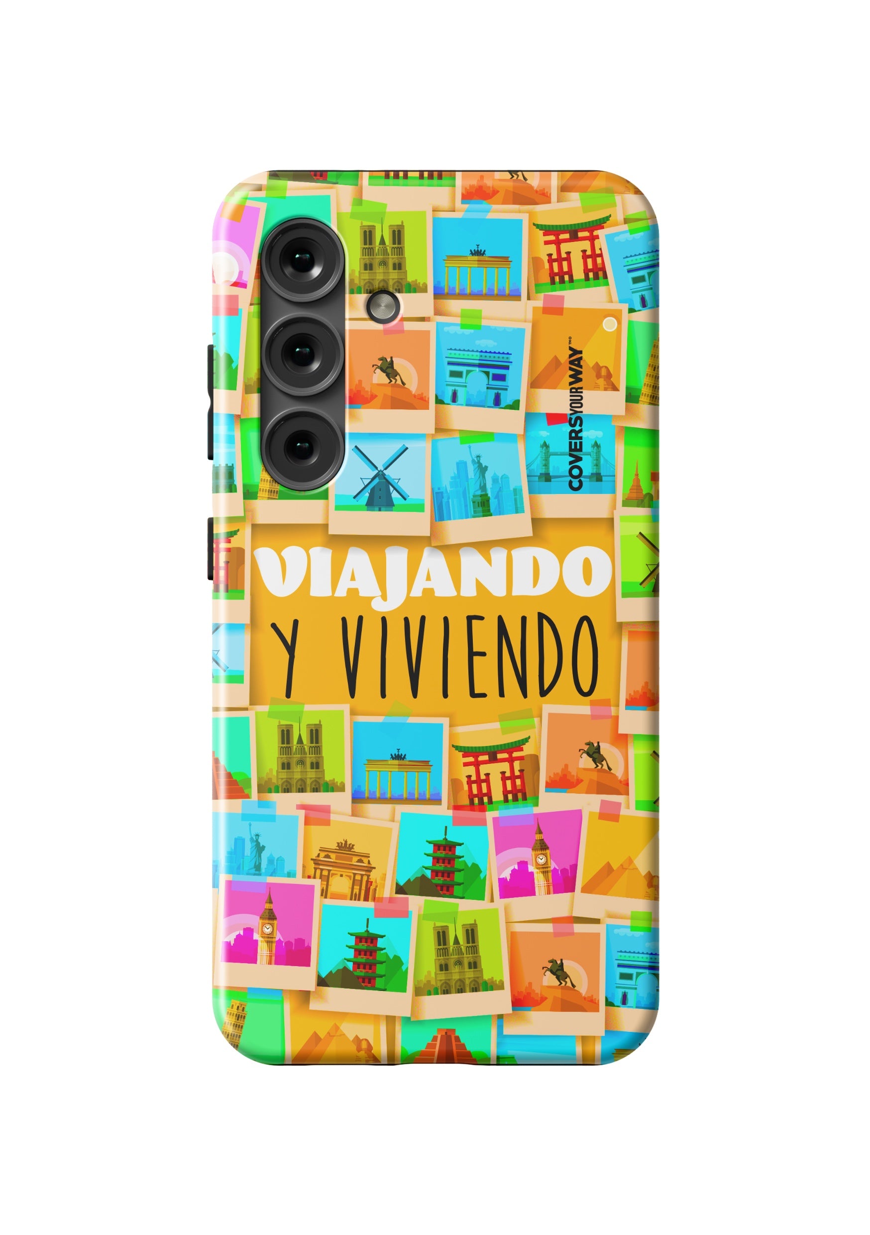 Este protector para celular presenta un diseño exclusivo con la frase "Viajando y viviendo" en una tipografía moderna y fluida, destacada sobre un fondo que evoca paisajes, mapas o elementos de viaje como maletas, aviones o caminos. Con una paleta de colores cálidos y aventureros, transmite libertad, movimiento y pasión por explorar. Fabricado con materiales resistentes, combina estilo, protección y el espíritu de quienes viven descubriendo el mundo.
