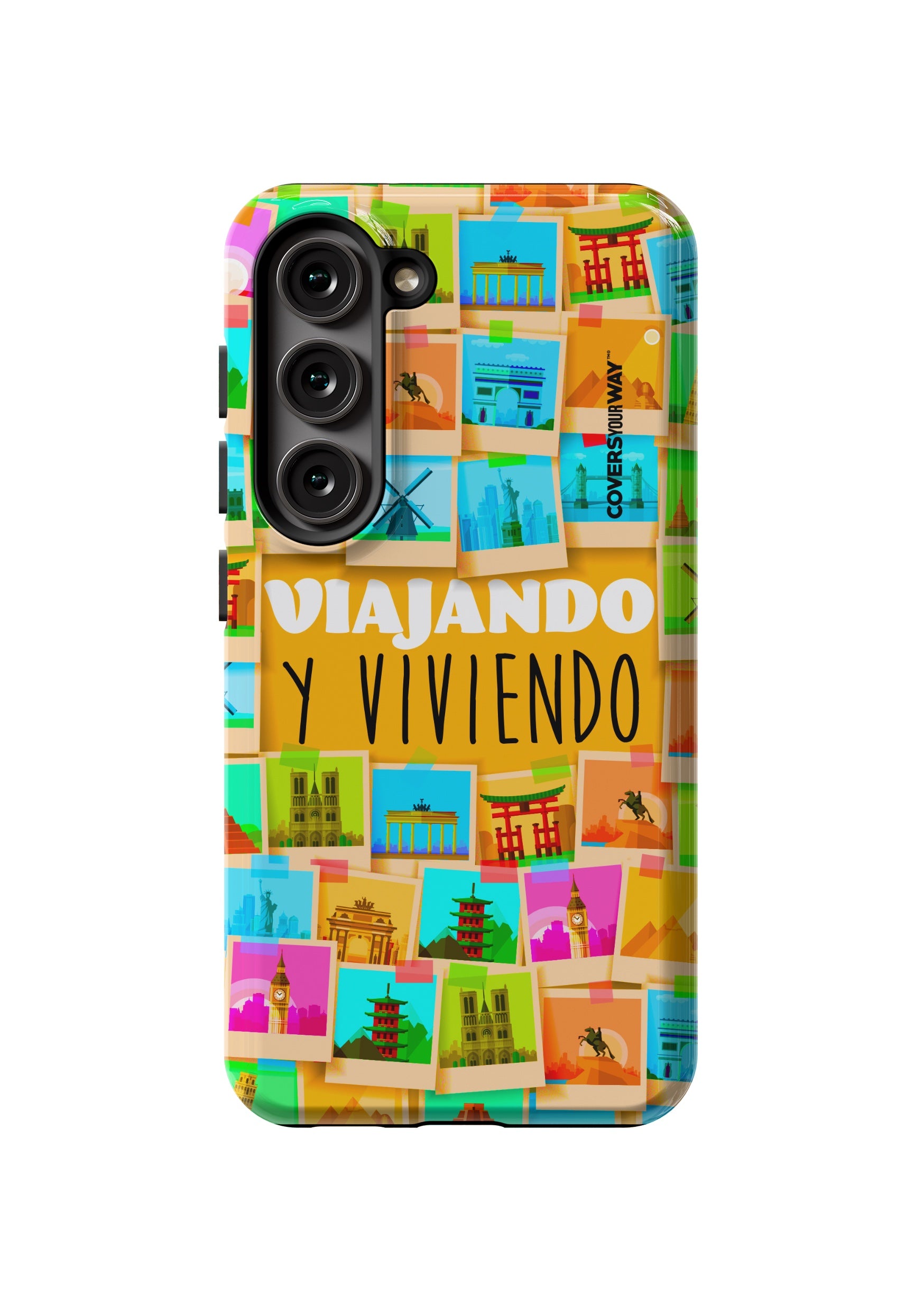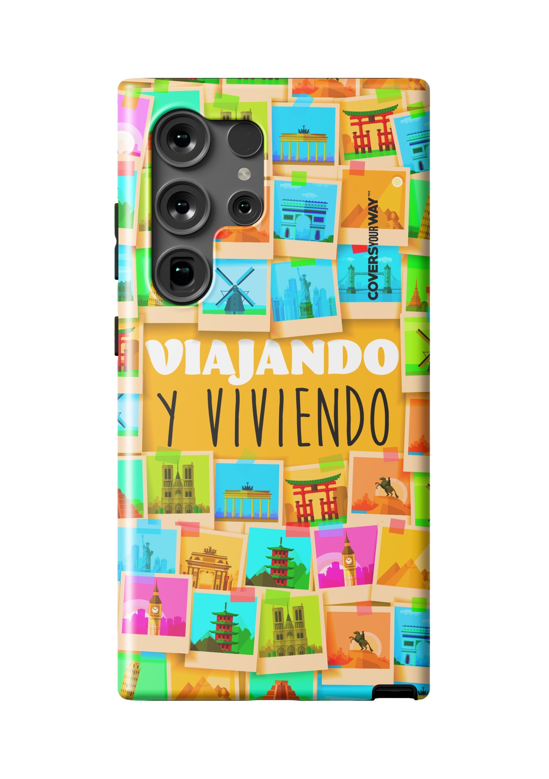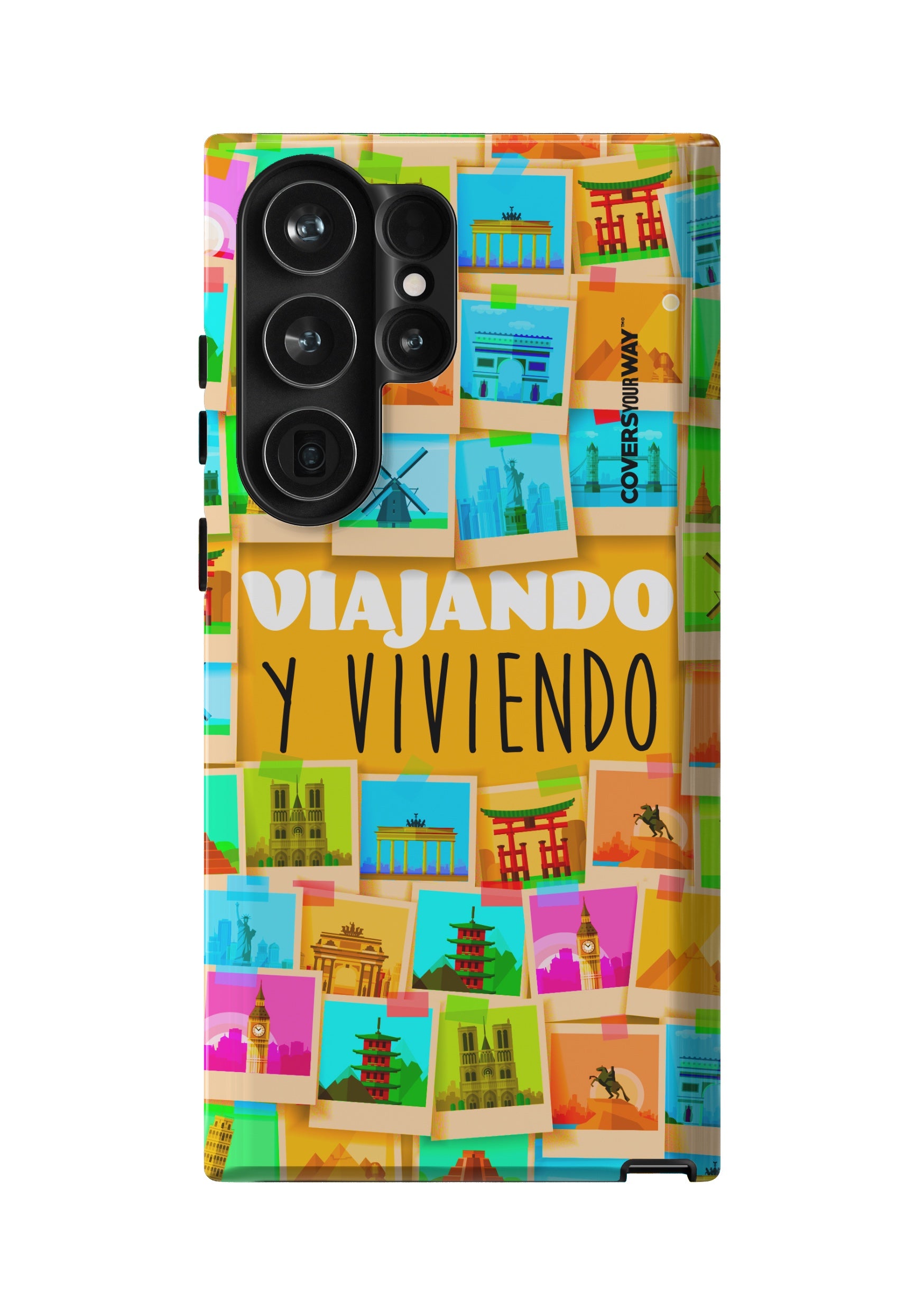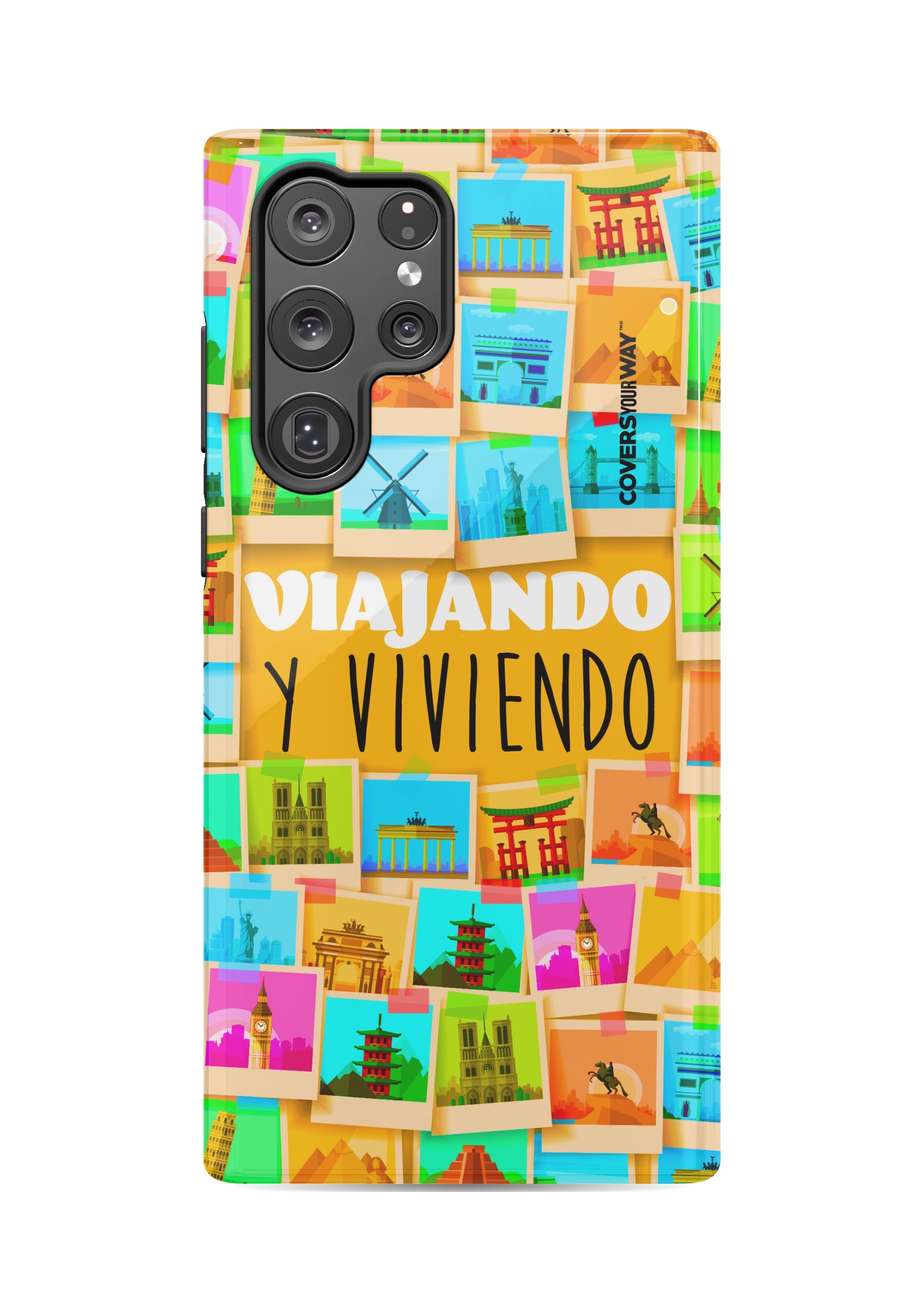 Este protector para celular presenta un diseño exclusivo con la frase "Viajando y viviendo" en una tipografía moderna y fluida, destacada sobre un fondo que evoca paisajes, mapas o elementos de viaje como maletas, aviones o caminos. Con una paleta de colores cálidos y aventureros, transmite libertad, movimiento y pasión por explorar. Fabricado con materiales resistentes, combina estilo, protección y el espíritu de quienes viven descubriendo el mundo.