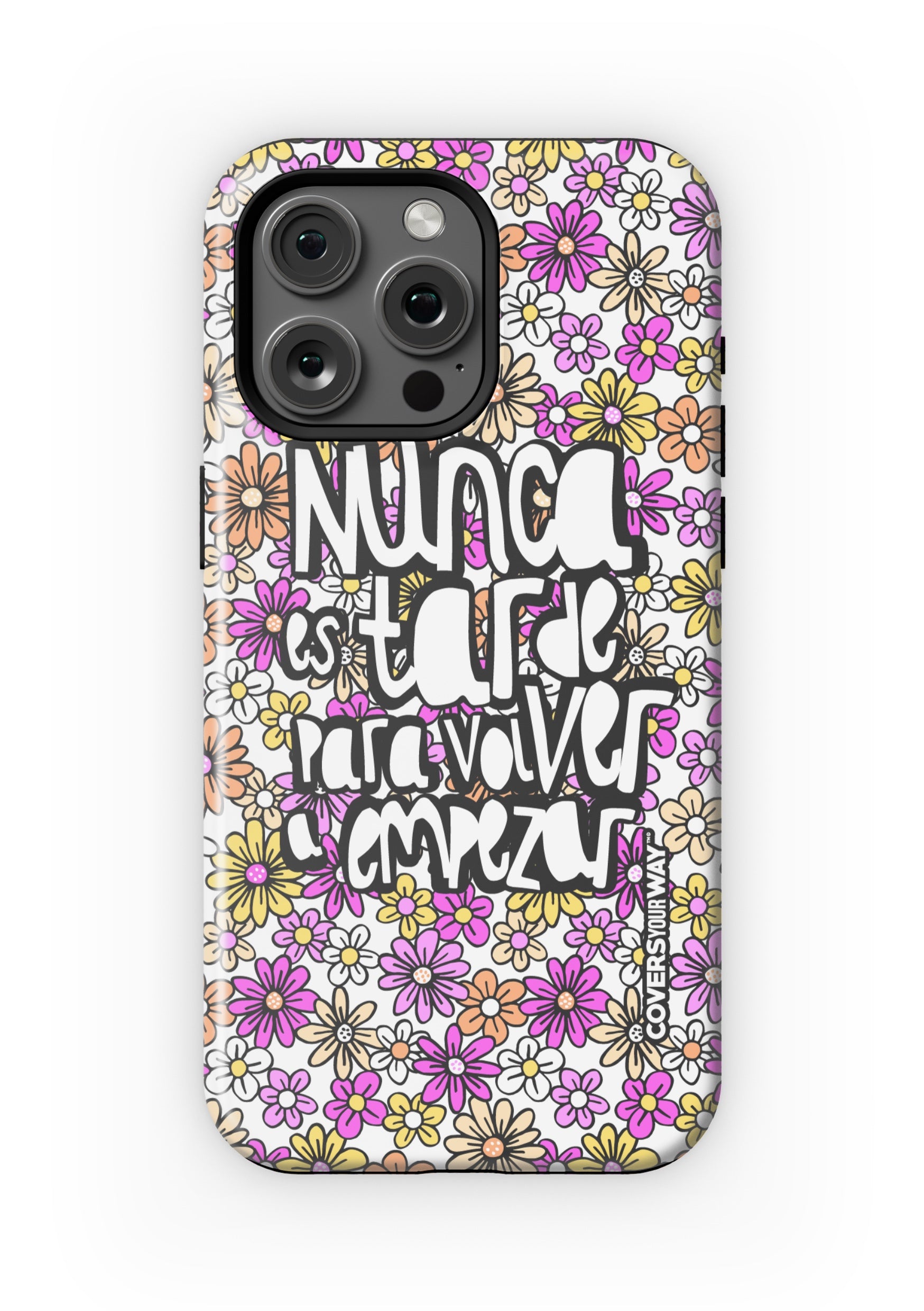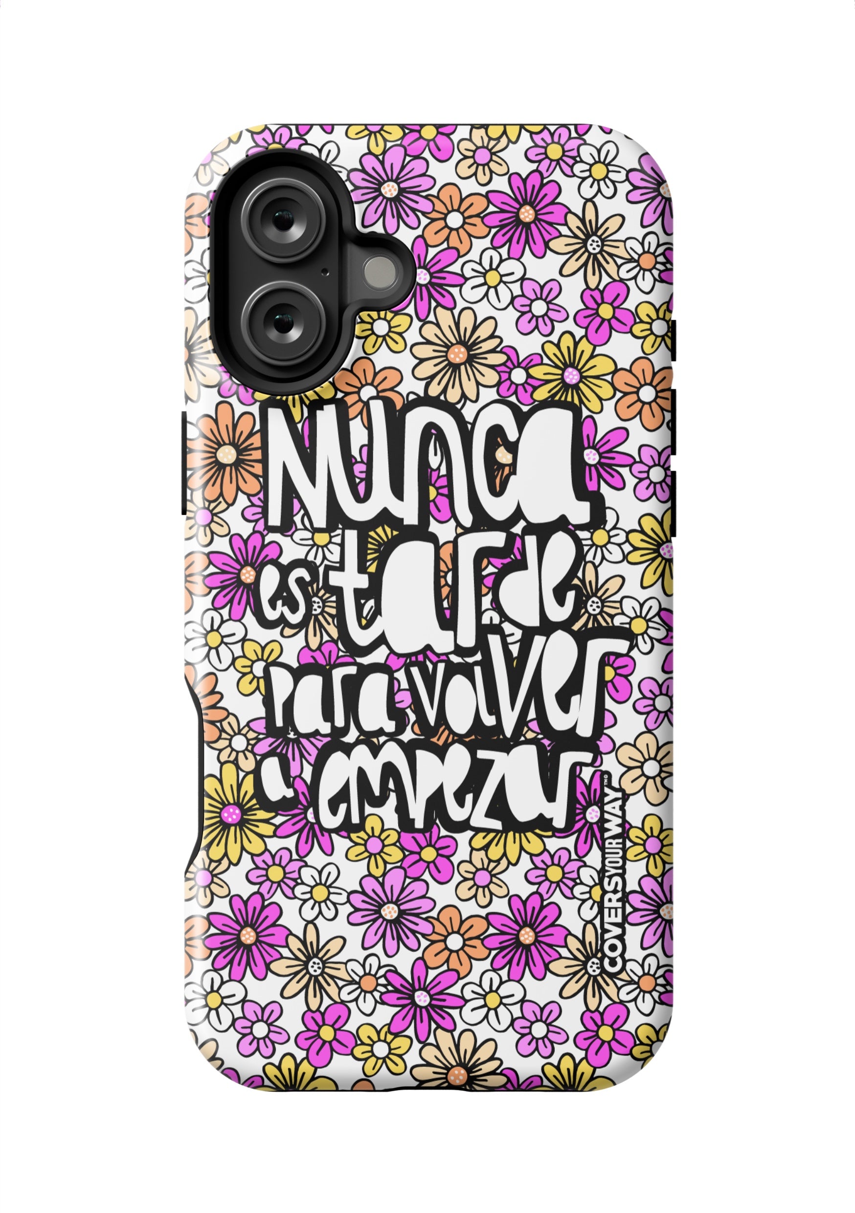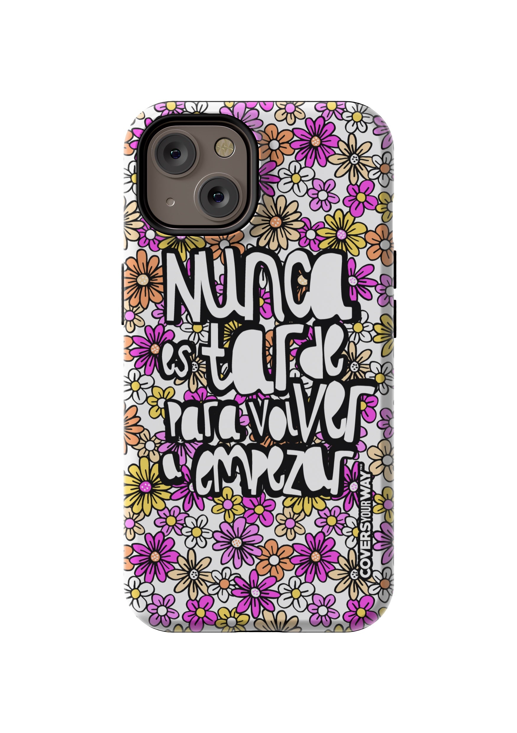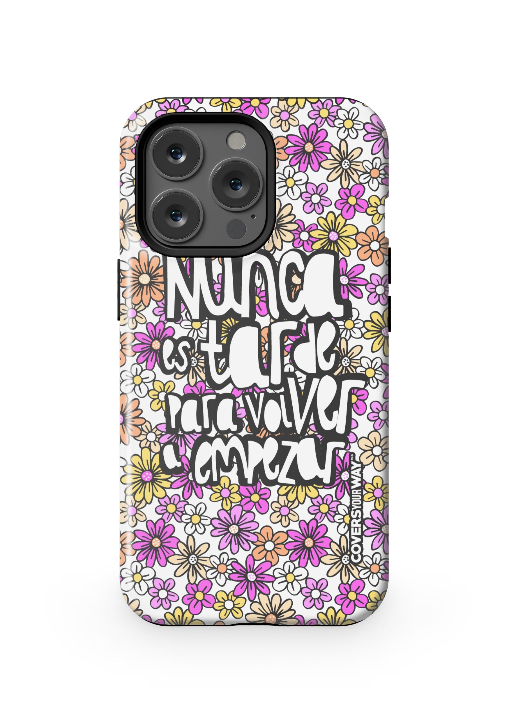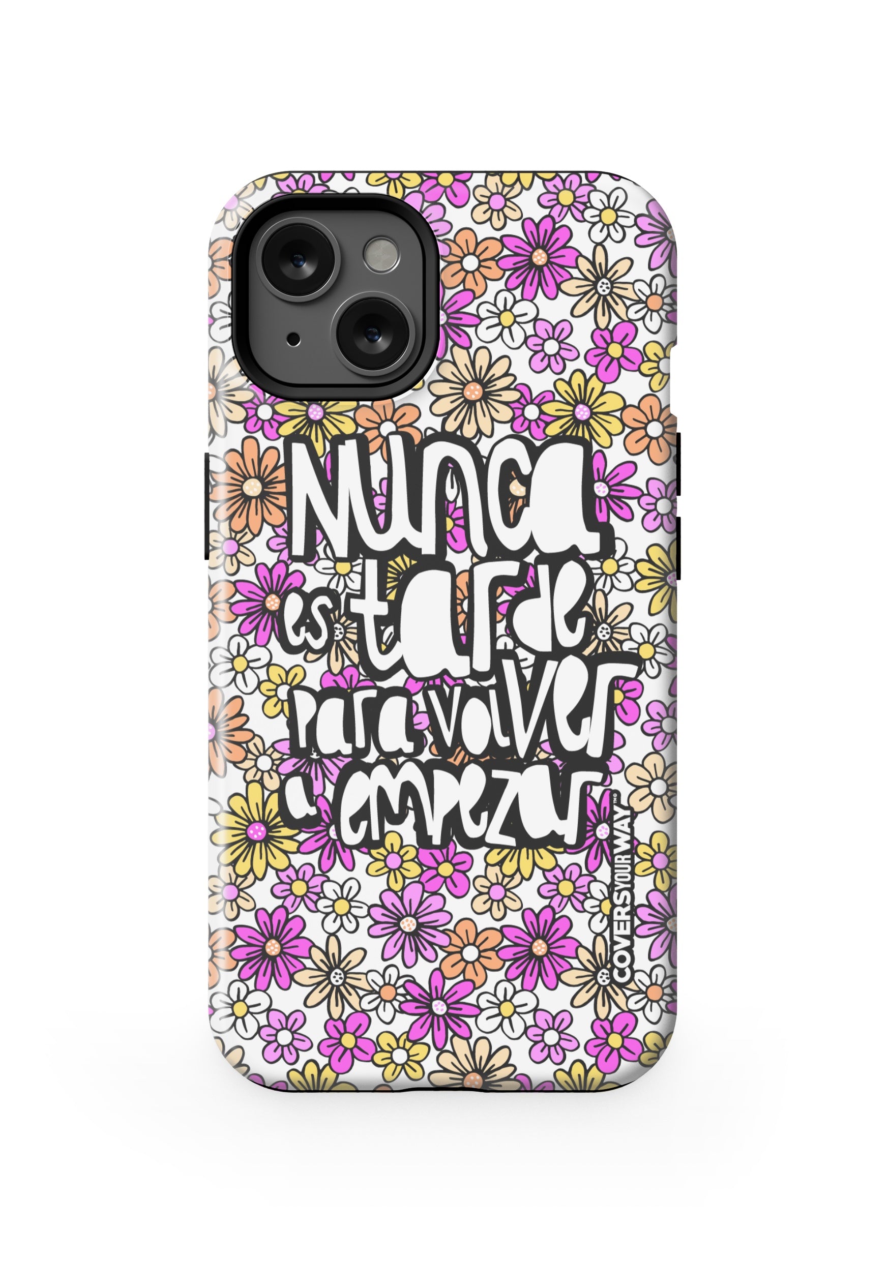 Refresh your style and energy with this durable phone case, designed with the phrase "Nunca Es Tarde Para Volver a Empezar". It protects your device from bumps and scratches while sharing a message of hope, second chances, and new beginnings.