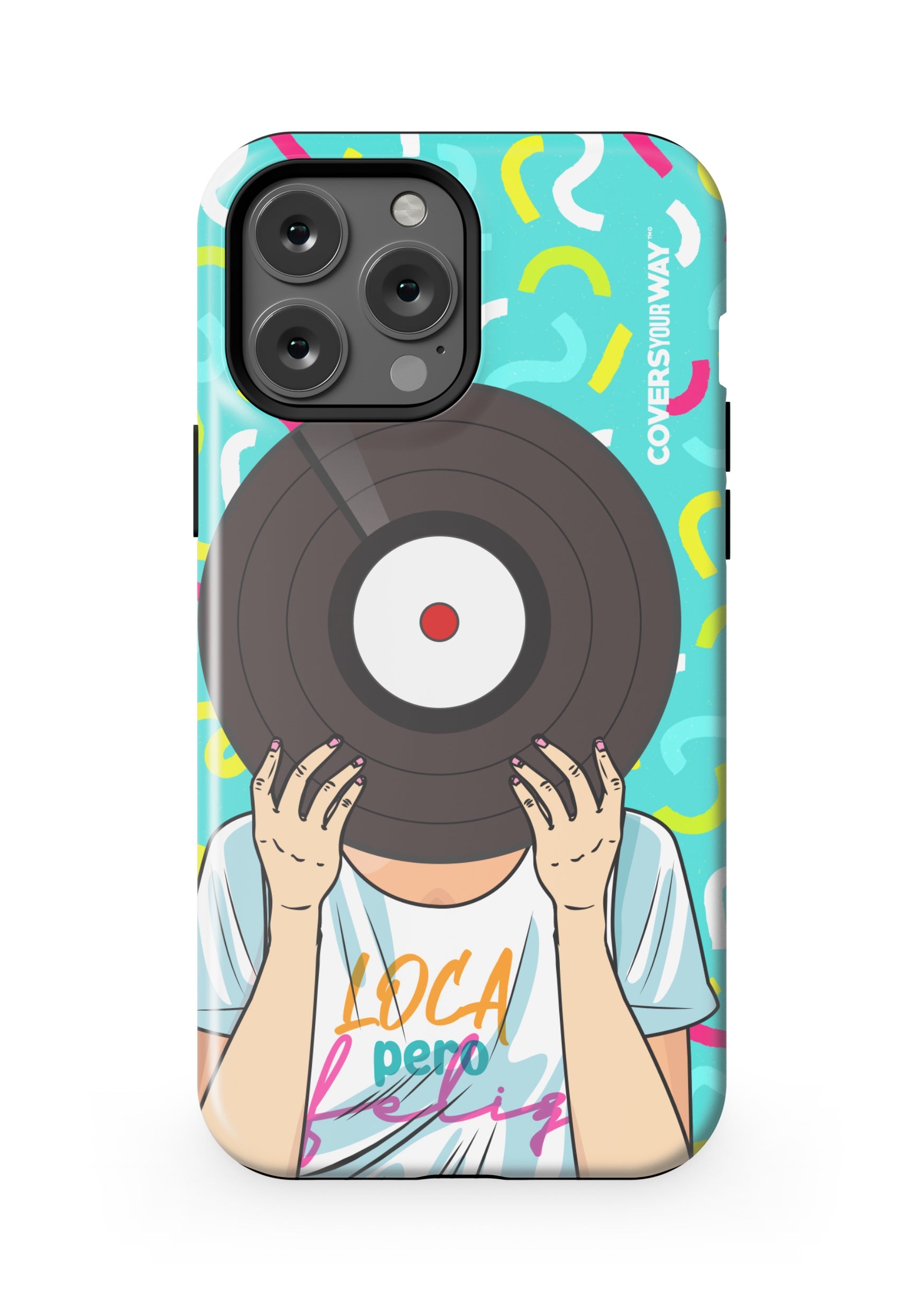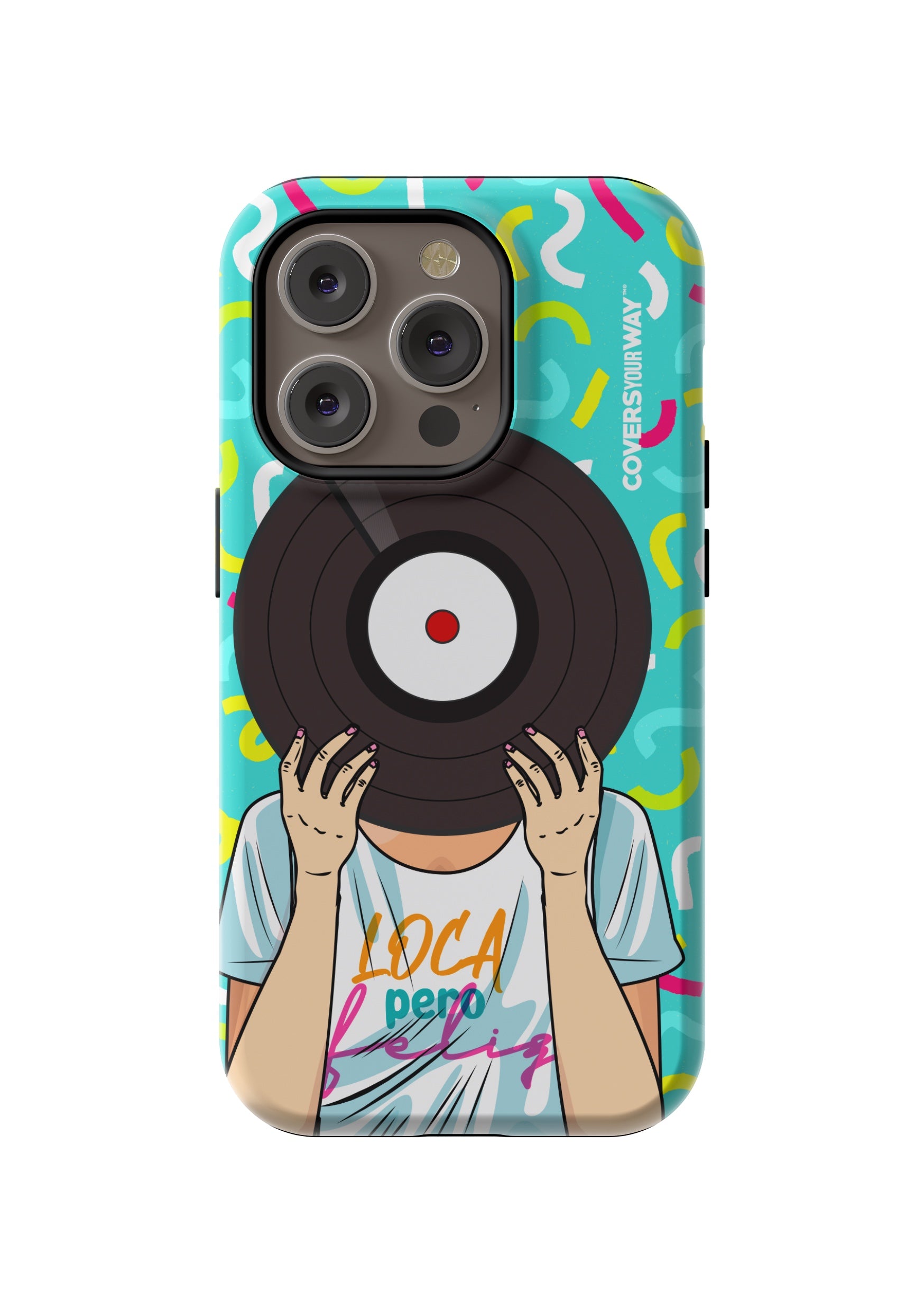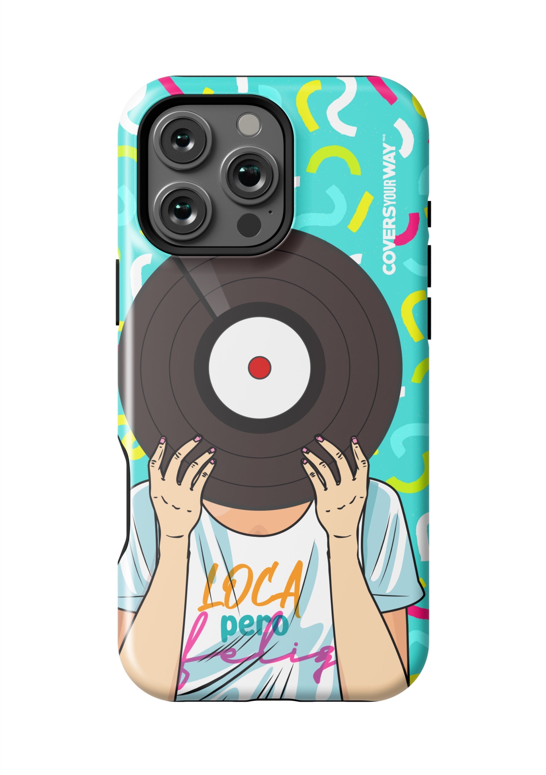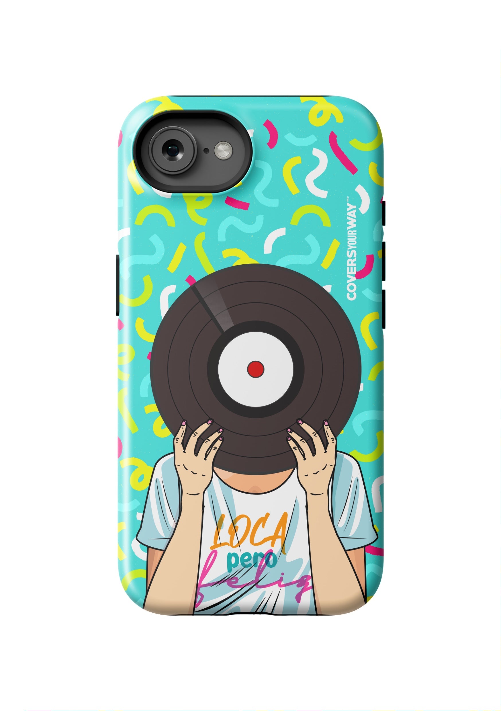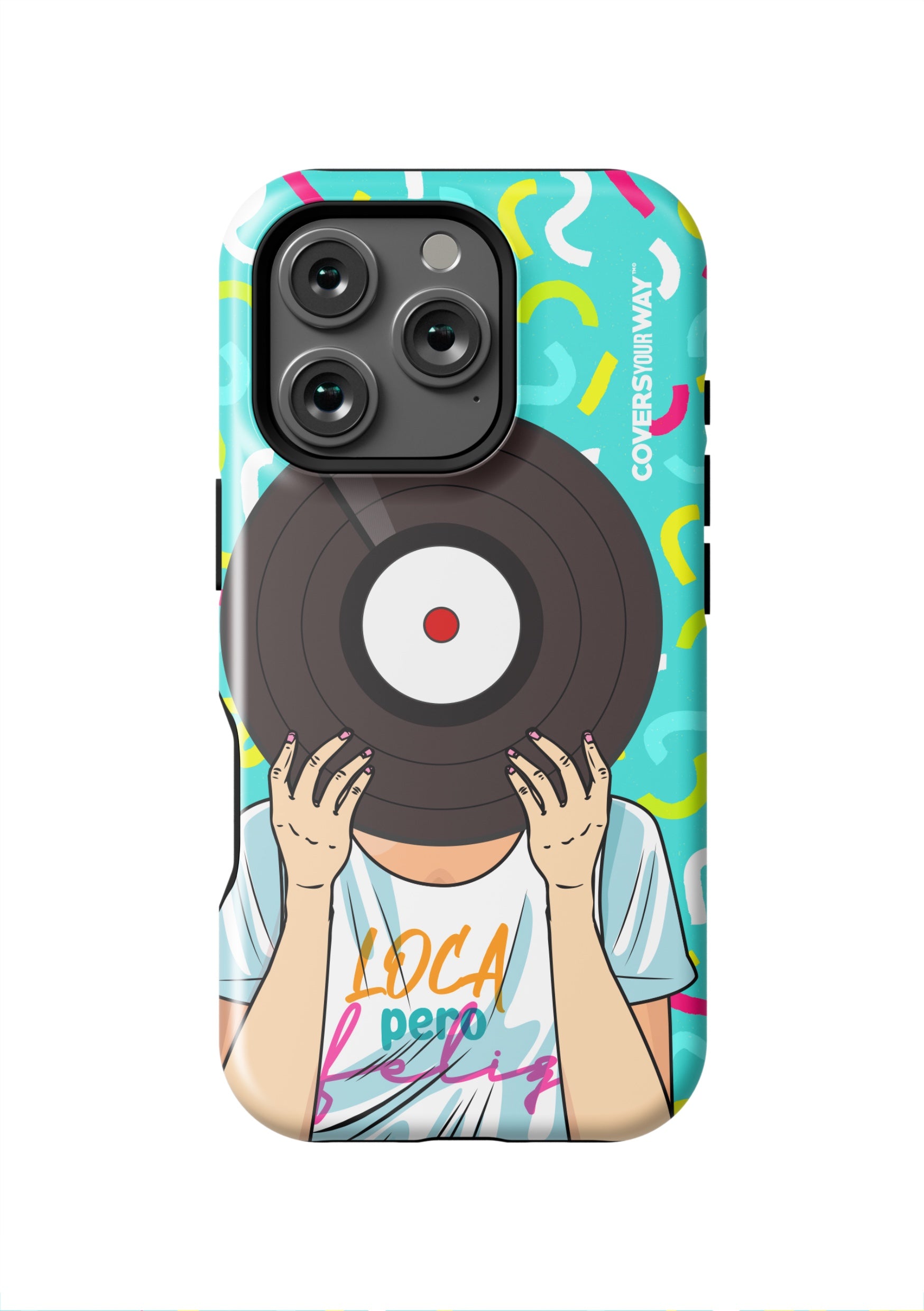Exclusive phone case full of personality and vibrant style. It features the phrase "Loca pero feliz" in fun typography over a colorful, eye-catching background—perfect for those who live joyfully and unapologetically. Provides reliable protection against bumps and scratches.