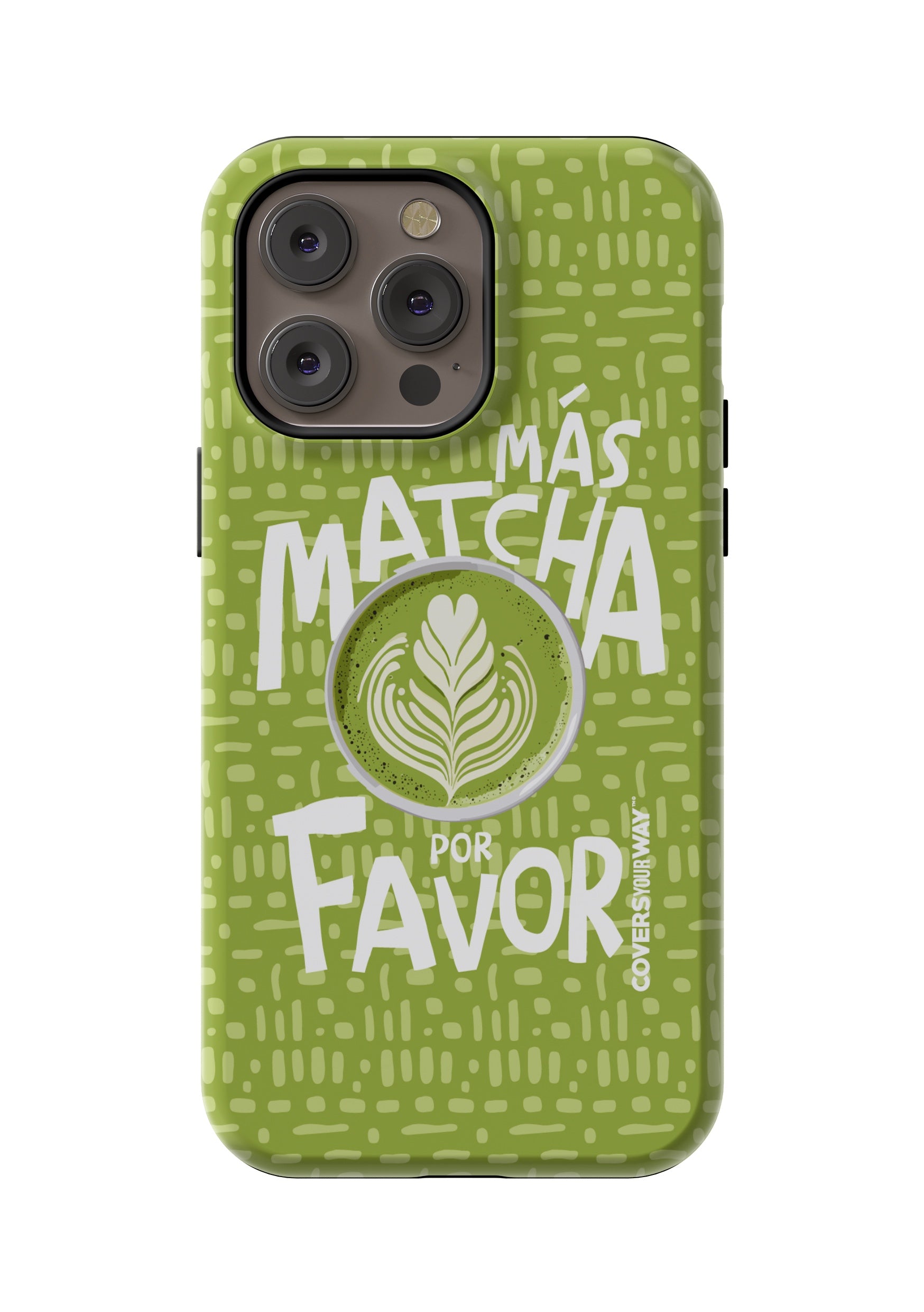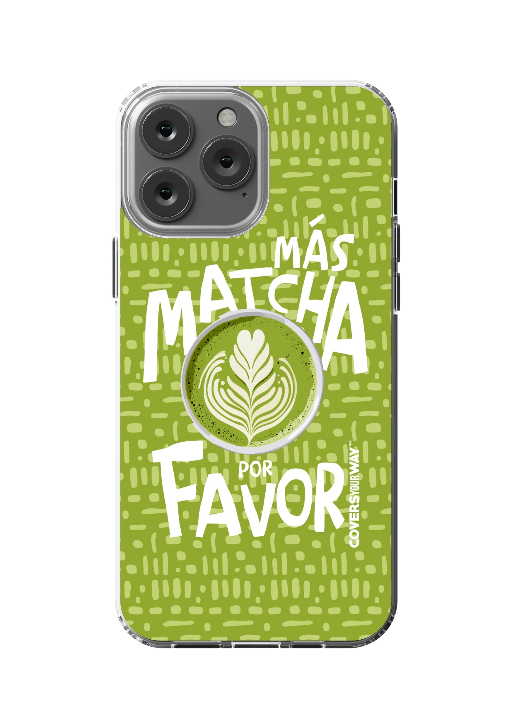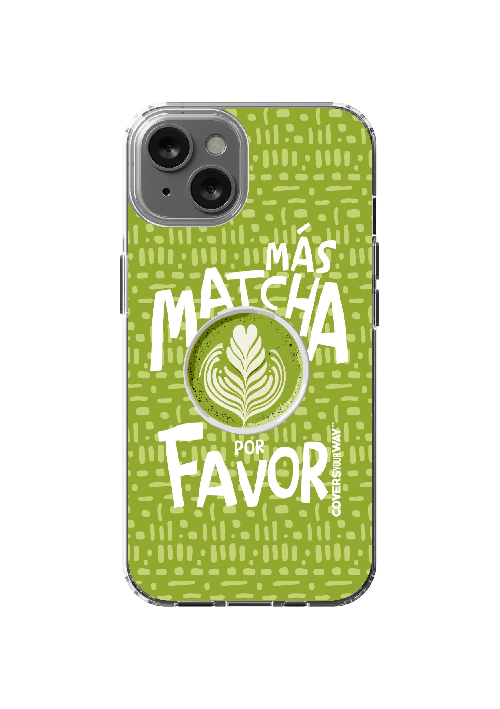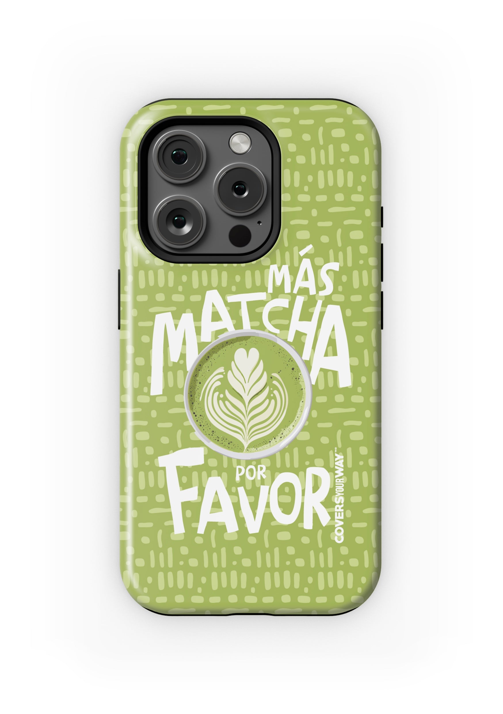 A phone case with an exclusive design featuring the phrase "Más MATCHA por favor" combines style and personality. It’s made from impact-resistant materials like silicone or polycarbonate, and showcases a soft green background with textures that evoke tea leaves. The phrase is written in a modern, friendly font and highlighted in white, adding an elegant yet playful touch. Perfect for matcha lovers and anyone who enjoys accessories with a fresh and original vibe.
