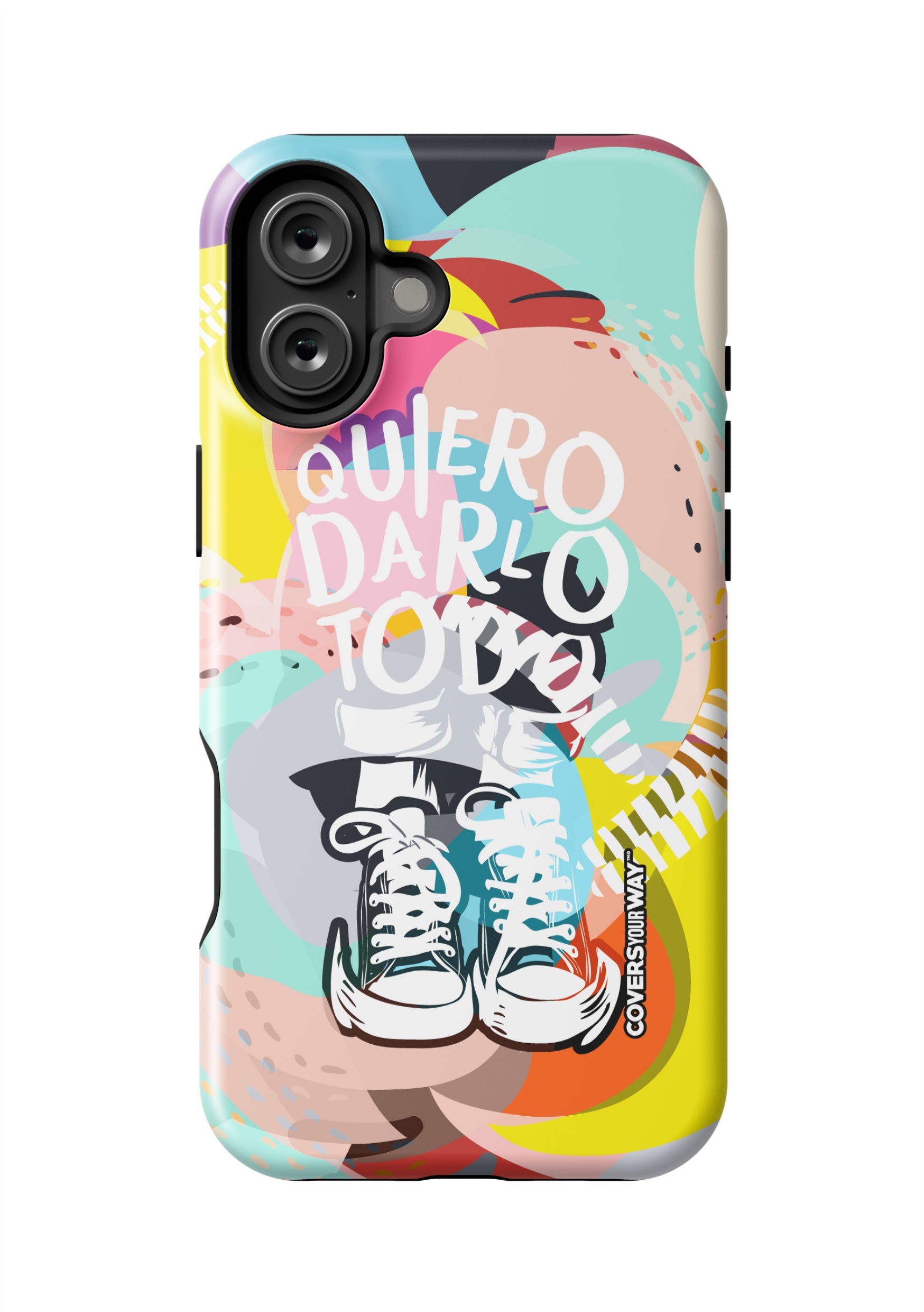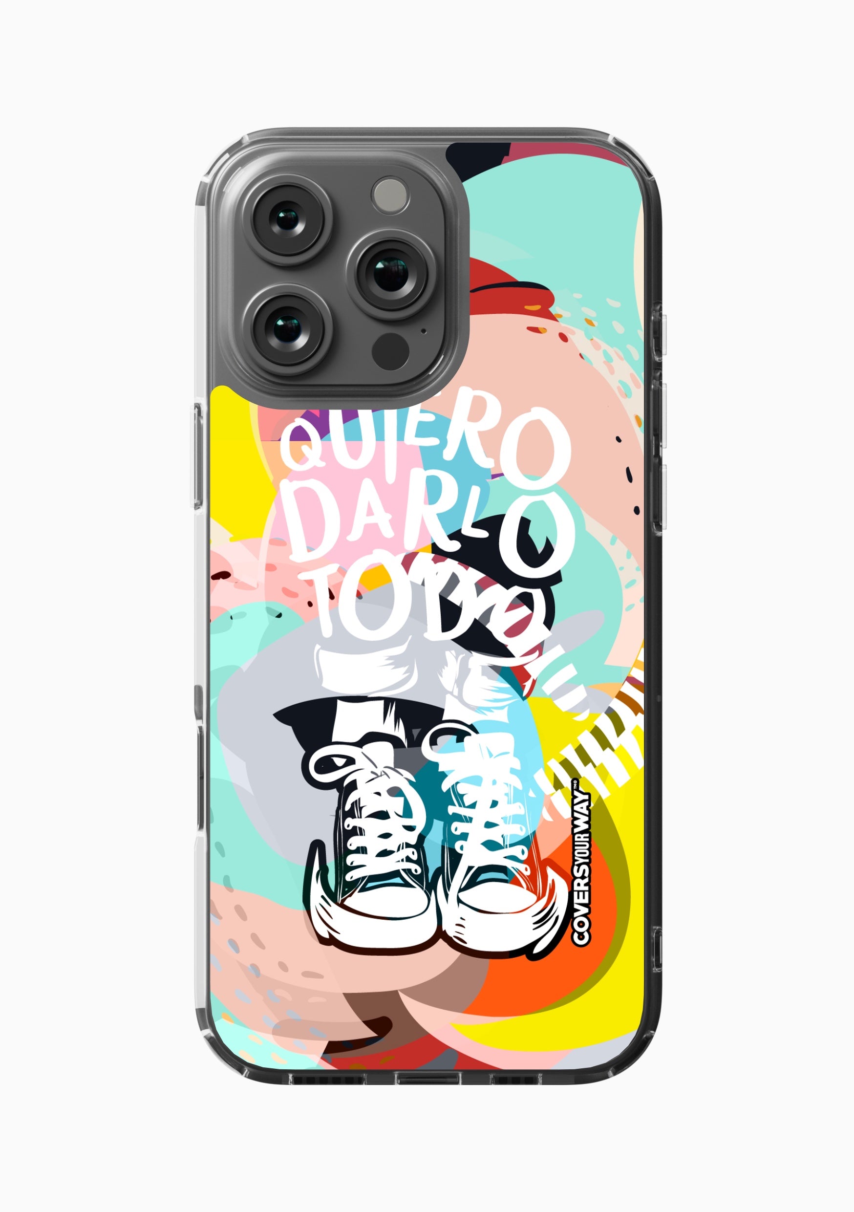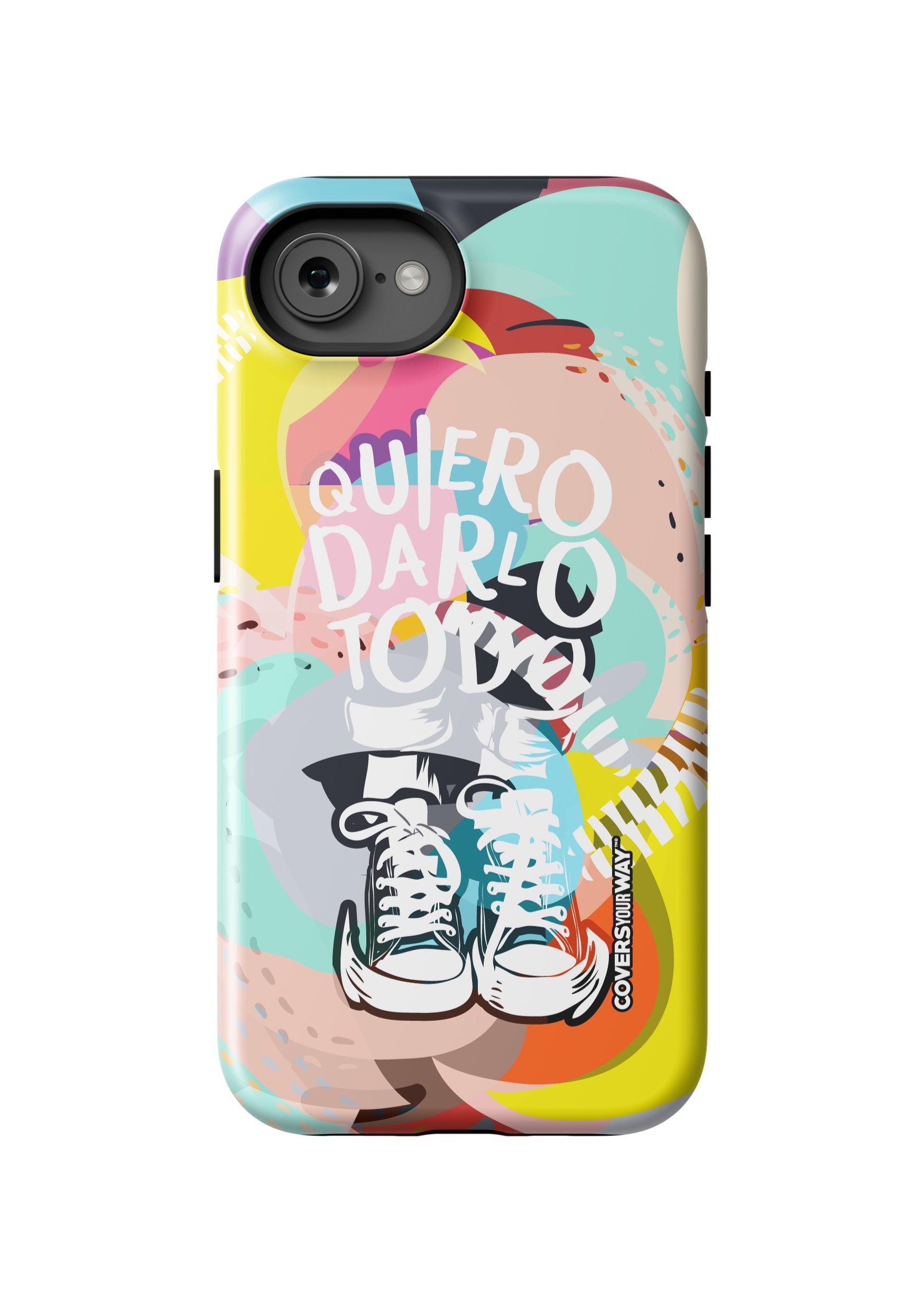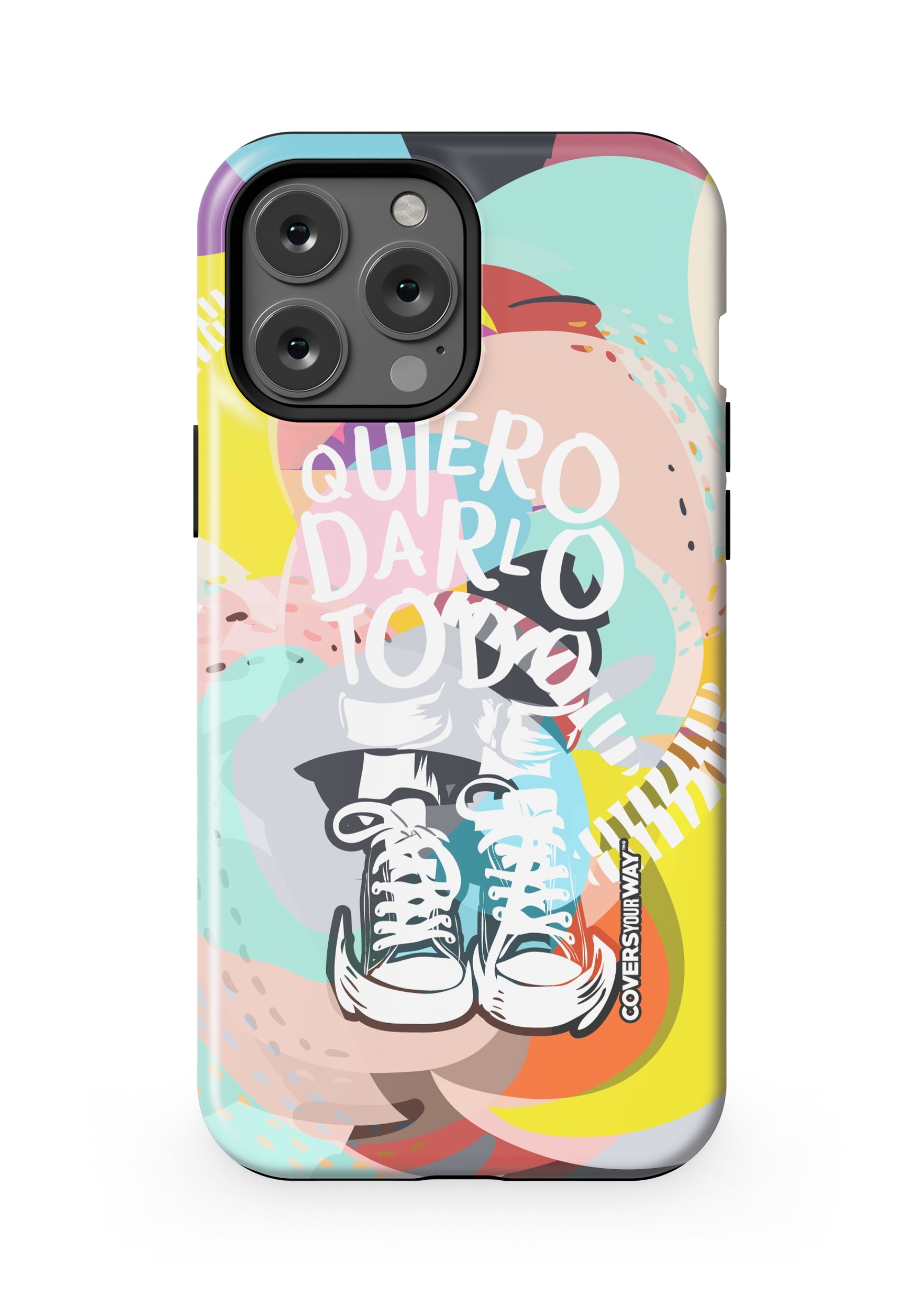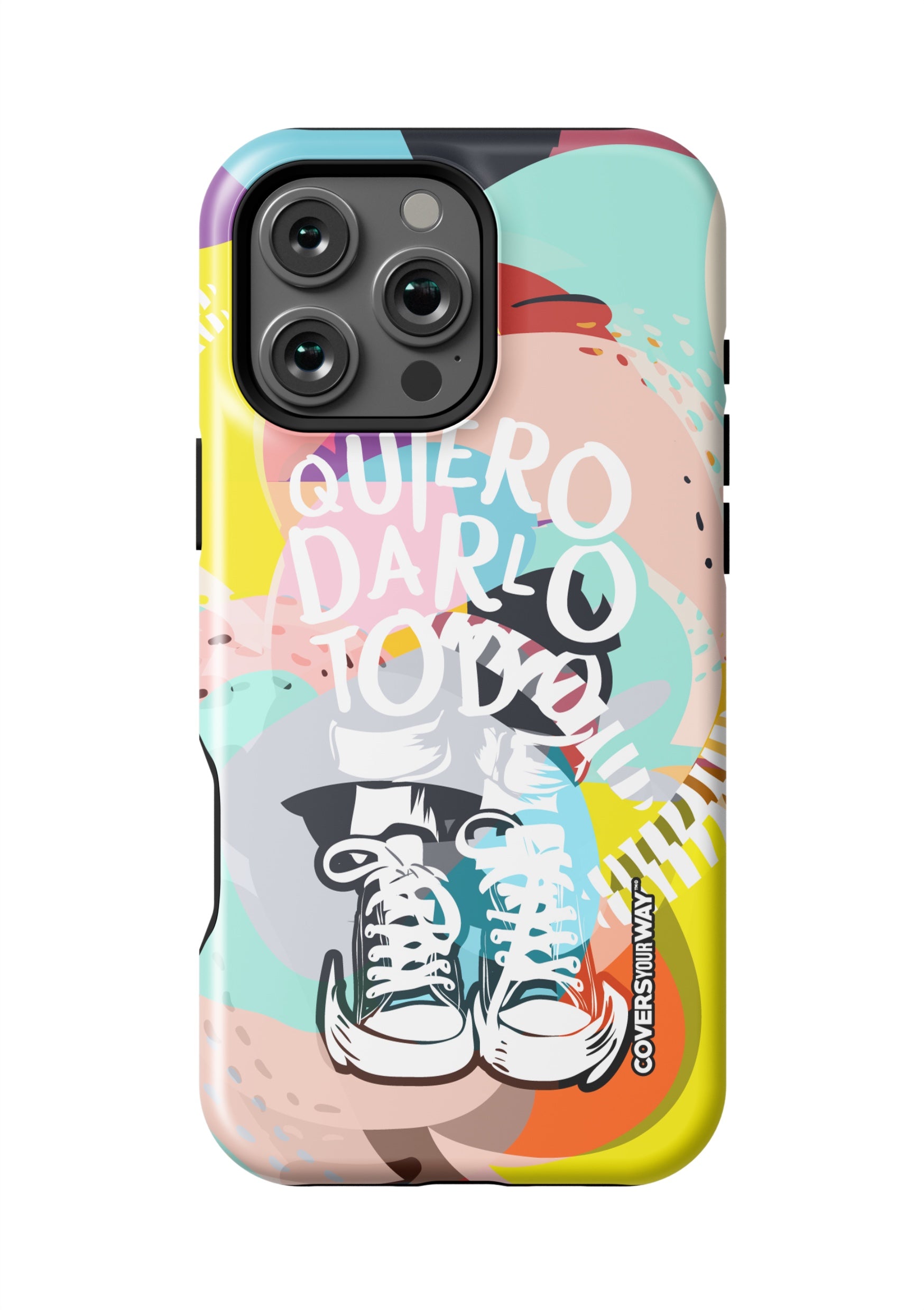 A phone case with the exclusive design featuring the phrase "Quiero darlo TODO" radiates energy, determination, and passion. Made from durable materials like silicone or polycarbonate, it features a dynamic design that reflects strength and movement. The phrase, in a modern and expressive font, takes center stage—serving as a reminder to give your all in every moment. It's the perfect accessory for bold, passionate individuals with an unstoppable attitude.