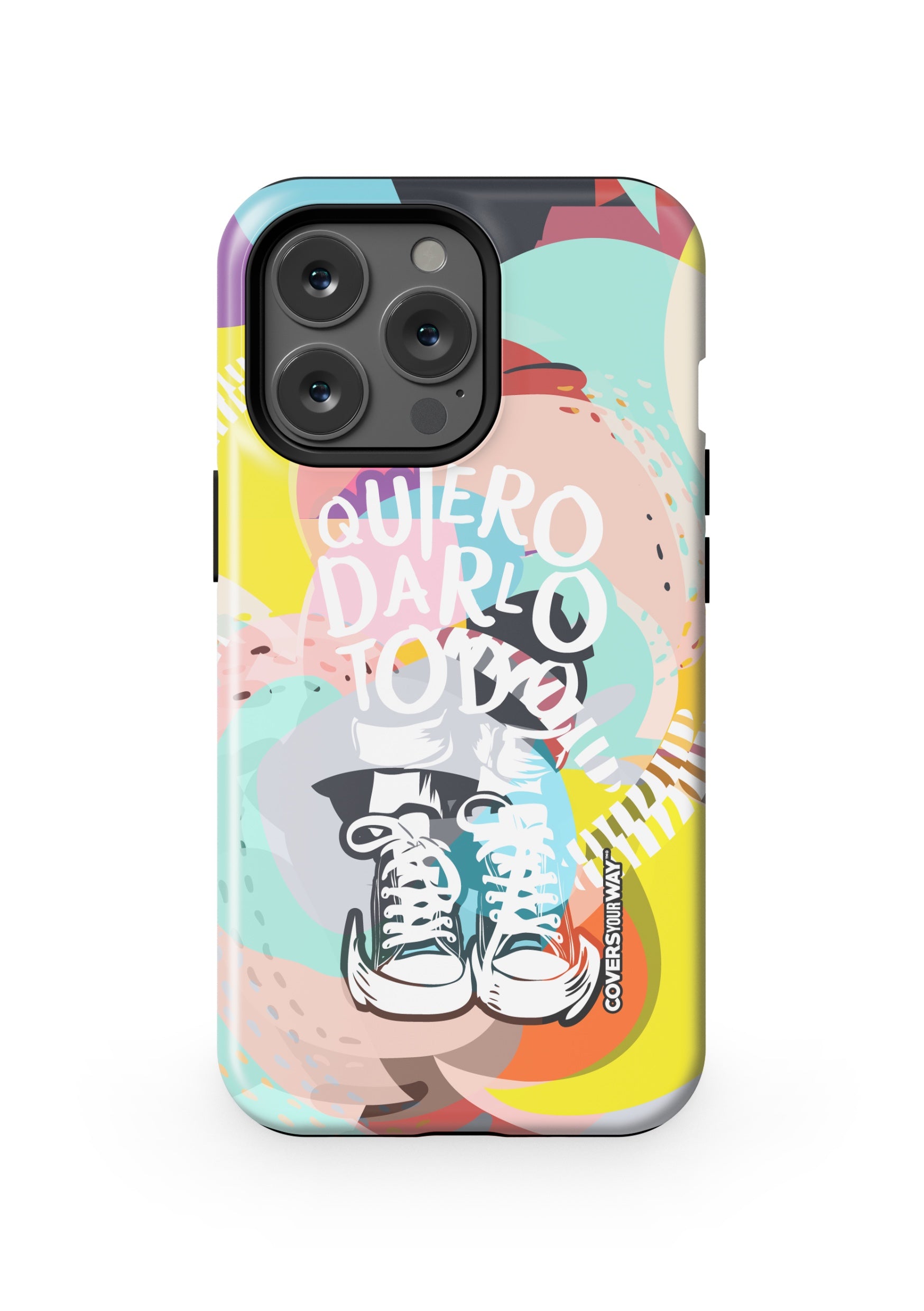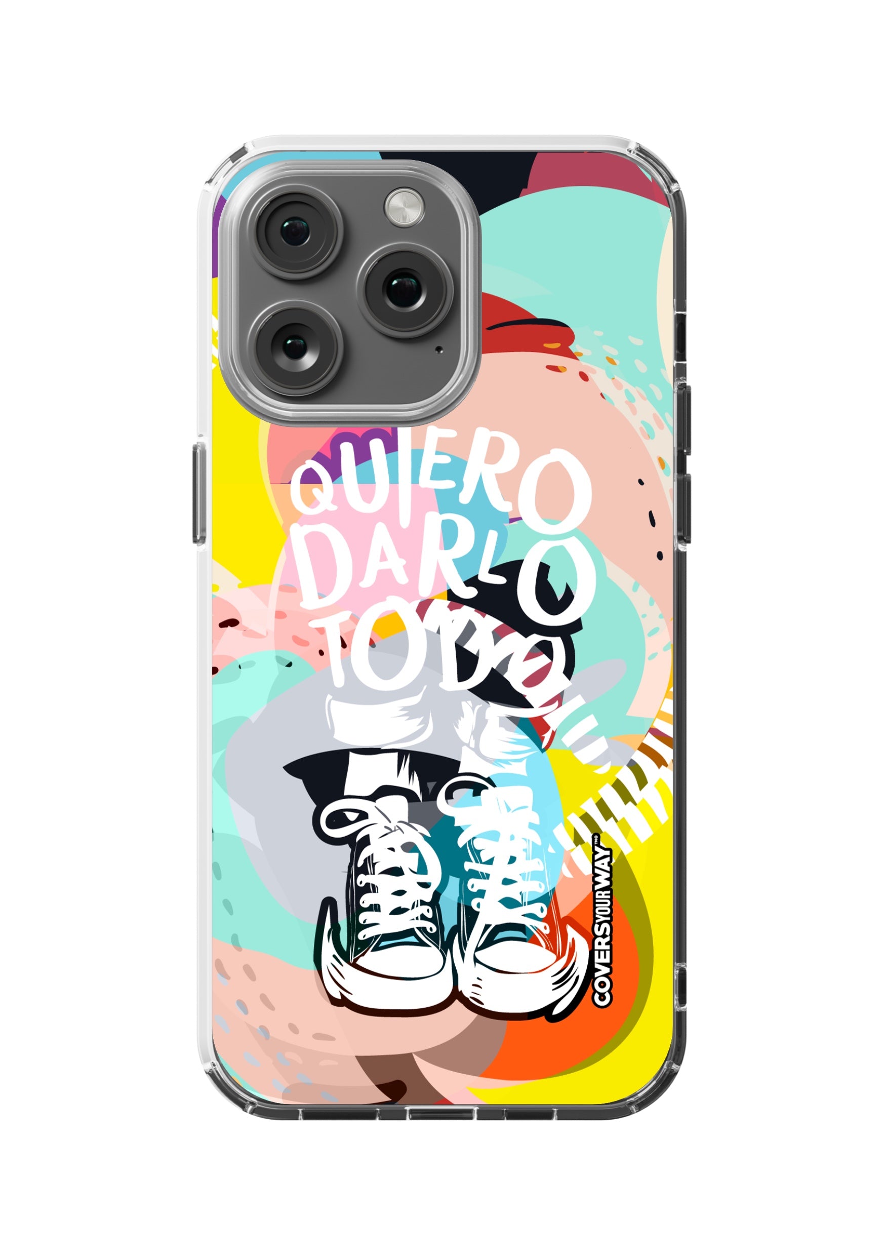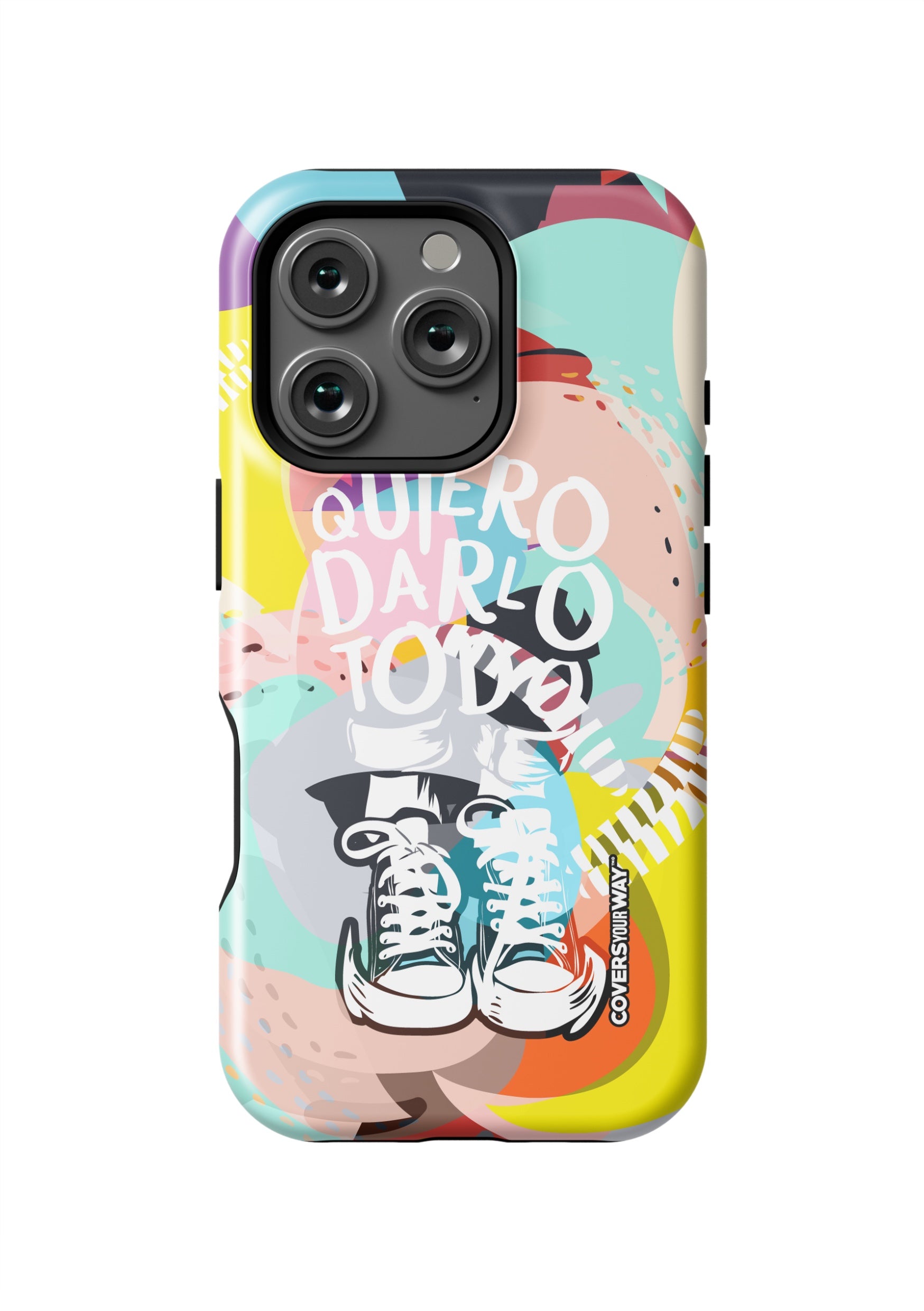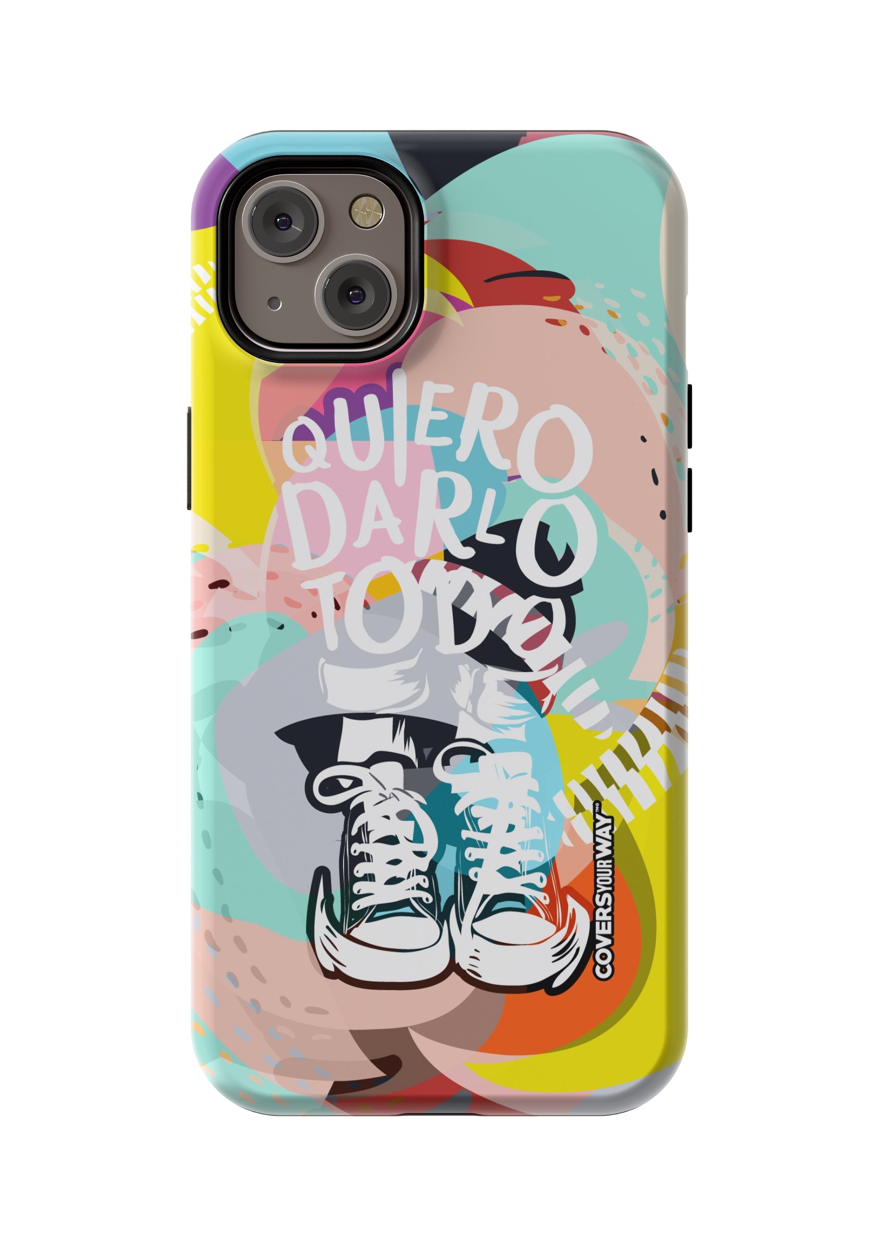 A phone case with the exclusive design featuring the phrase "Quiero darlo TODO" radiates energy, determination, and passion. Made from durable materials like silicone or polycarbonate, it features a dynamic design that reflects strength and movement. The phrase, in a modern and expressive font, takes center stage—serving as a reminder to give your all in every moment. It's the perfect accessory for bold, passionate individuals with an unstoppable attitude.