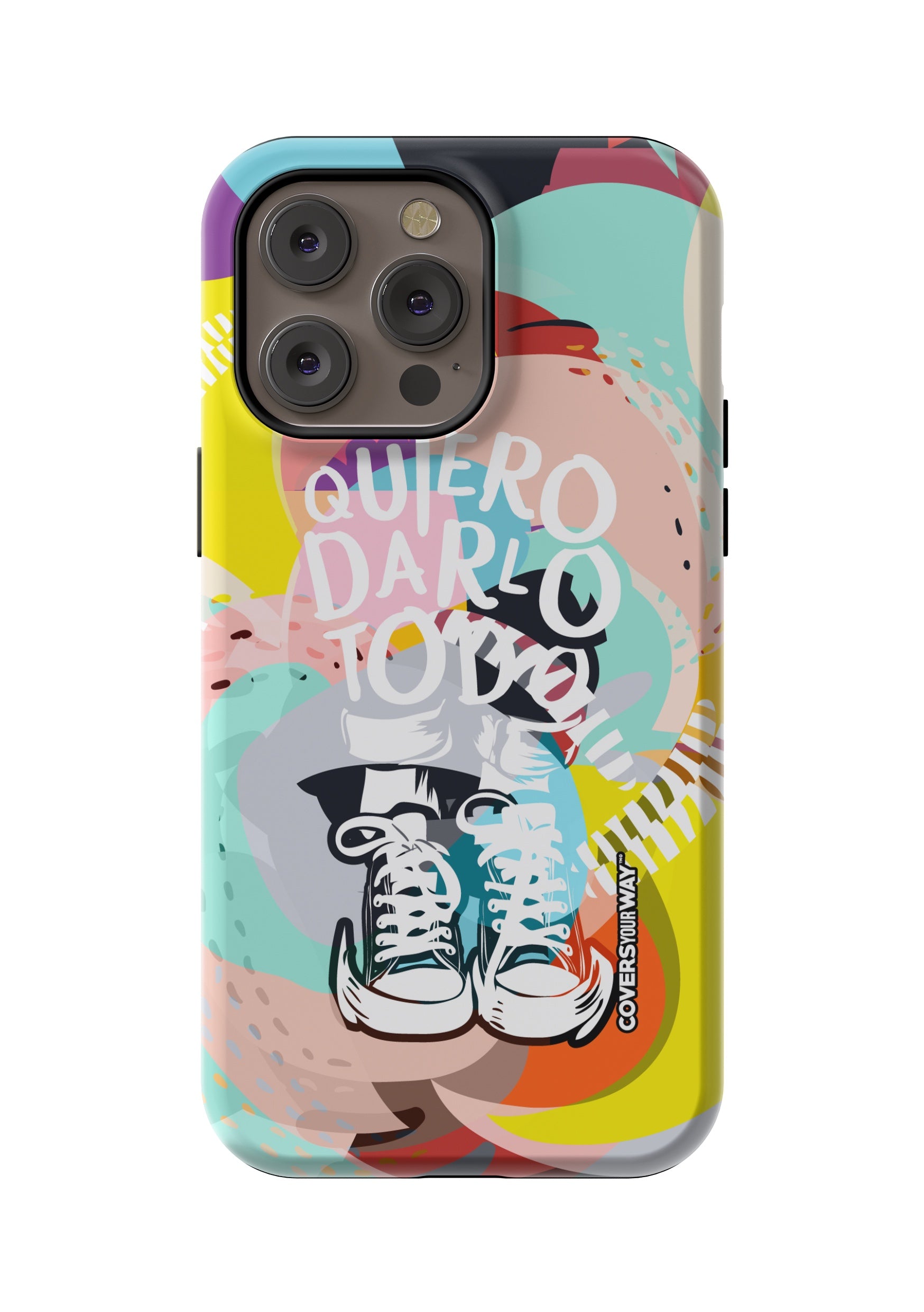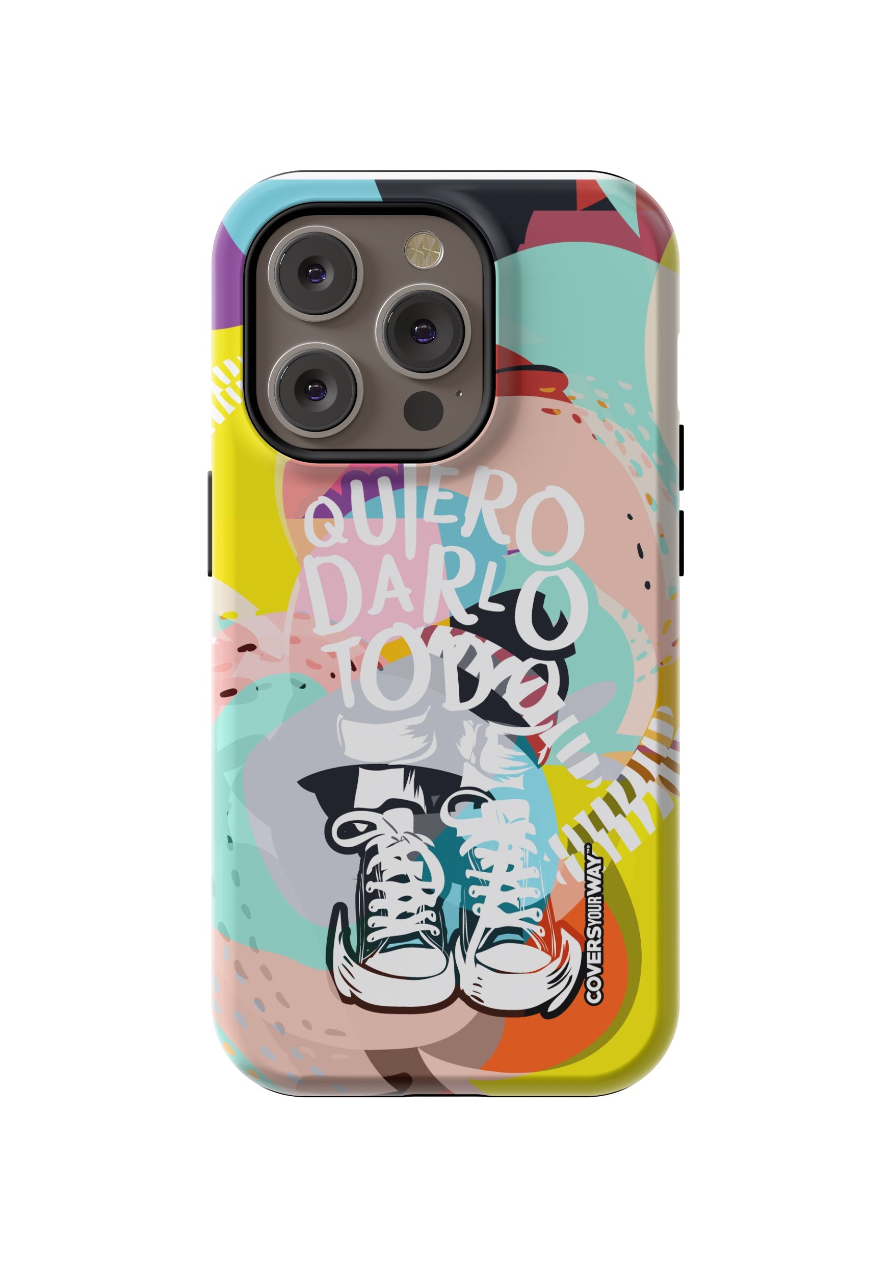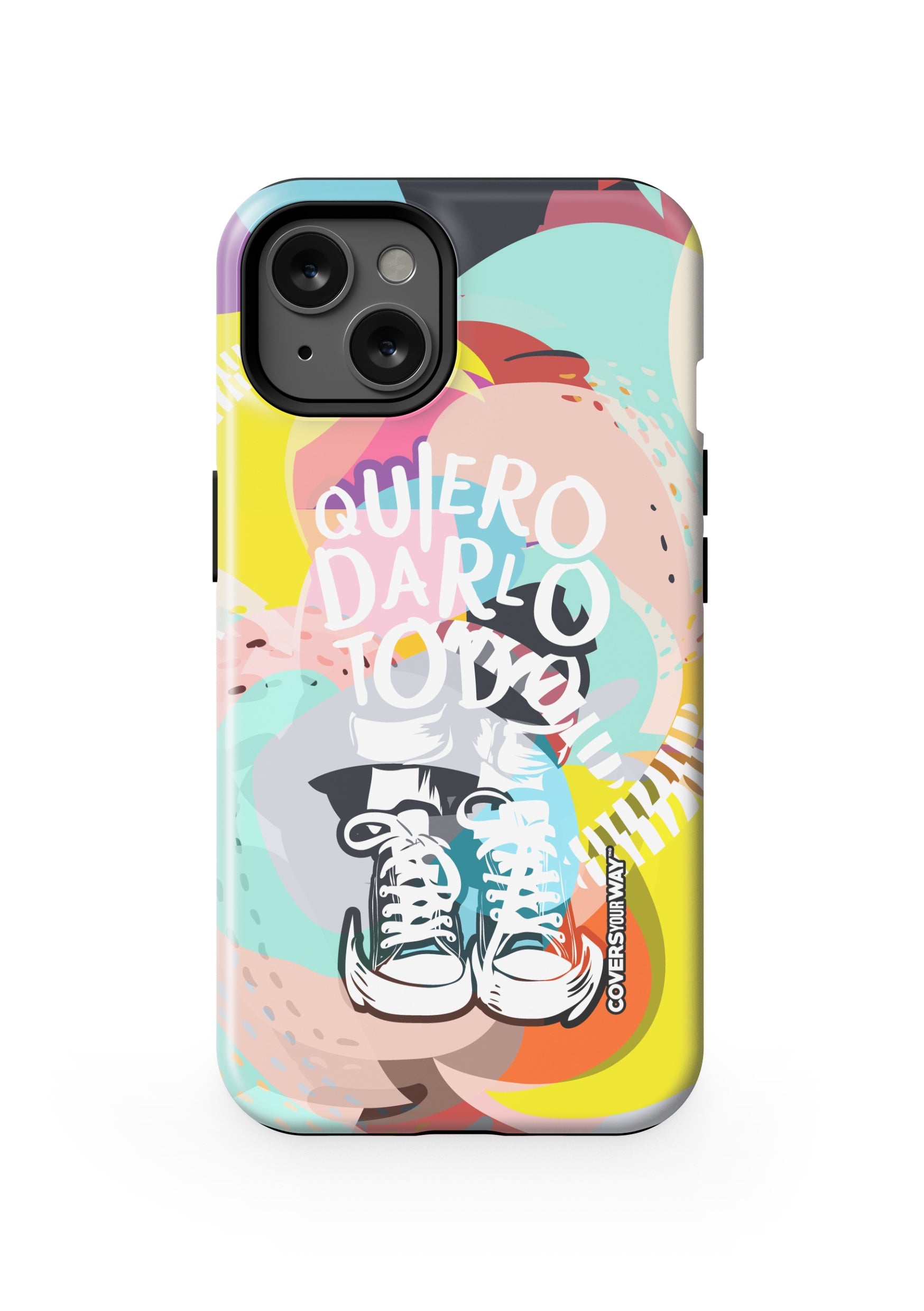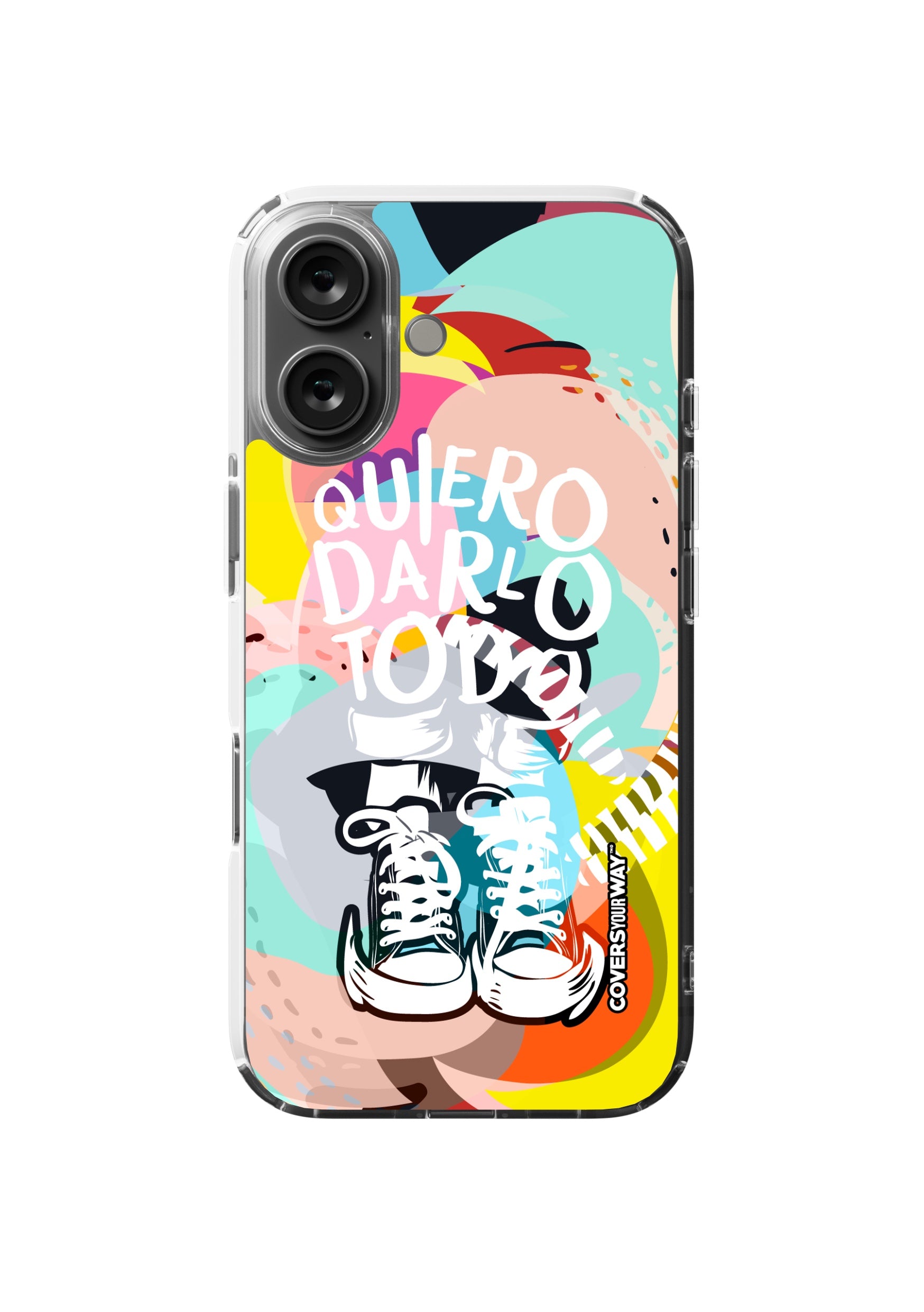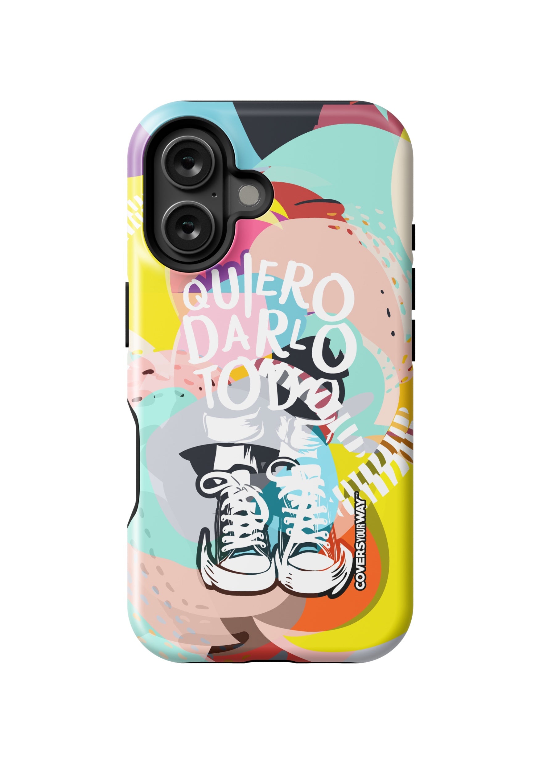 A phone case with the exclusive design featuring the phrase "Quiero darlo TODO" radiates energy, determination, and passion. Made from durable materials like silicone or polycarbonate, it features a dynamic design that reflects strength and movement. The phrase, in a modern and expressive font, takes center stage—serving as a reminder to give your all in every moment. It's the perfect accessory for bold, passionate individuals with an unstoppable attitude.