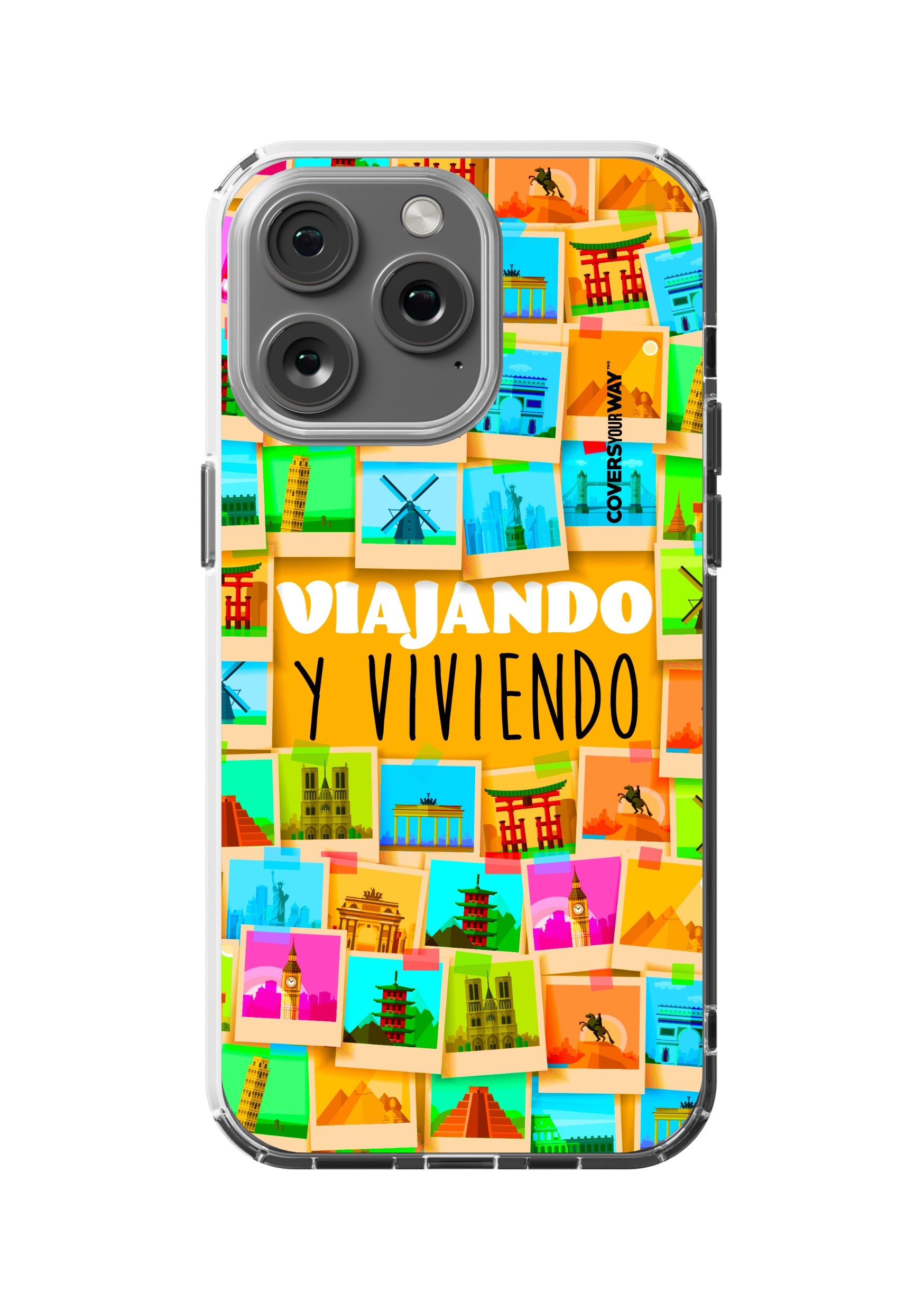 Este protector para celular presenta un diseño exclusivo con la frase "Viajando y viviendo" en una tipografía moderna y fluida, destacada sobre un fondo que evoca paisajes, mapas o elementos de viaje como maletas, aviones o caminos. Con una paleta de colores cálidos y aventureros, transmite libertad, movimiento y pasión por explorar. Fabricado con materiales resistentes, combina estilo, protección y el espíritu de quienes viven descubriendo el mundo.