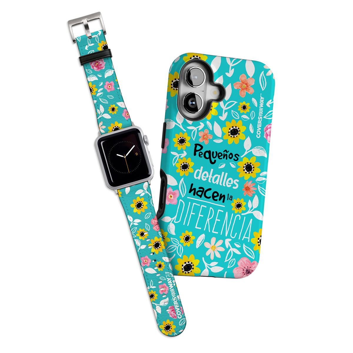 Highlight the small moments that make a difference with this exclusive combo, which includes a durable and comfortable Apple Watch strap and a long-lasting phone case, both featuring the elegant design and inspiring phrase "Pequeños Detalles Hacen la Diferencia". This set not only protects your devices but also reminds you that every detail matters on the path to greatness.