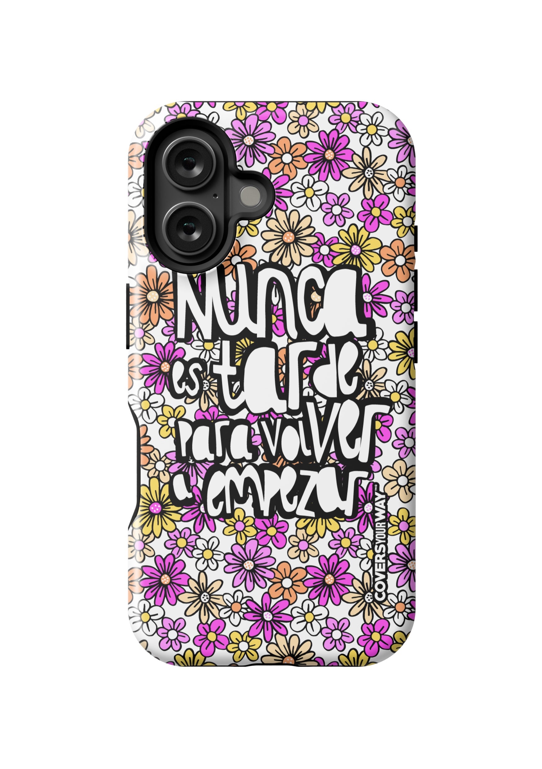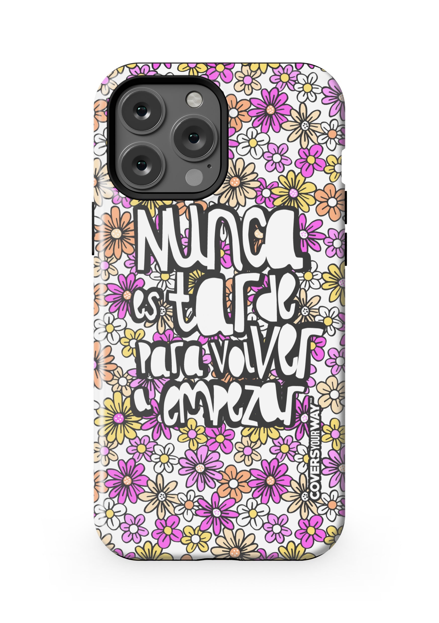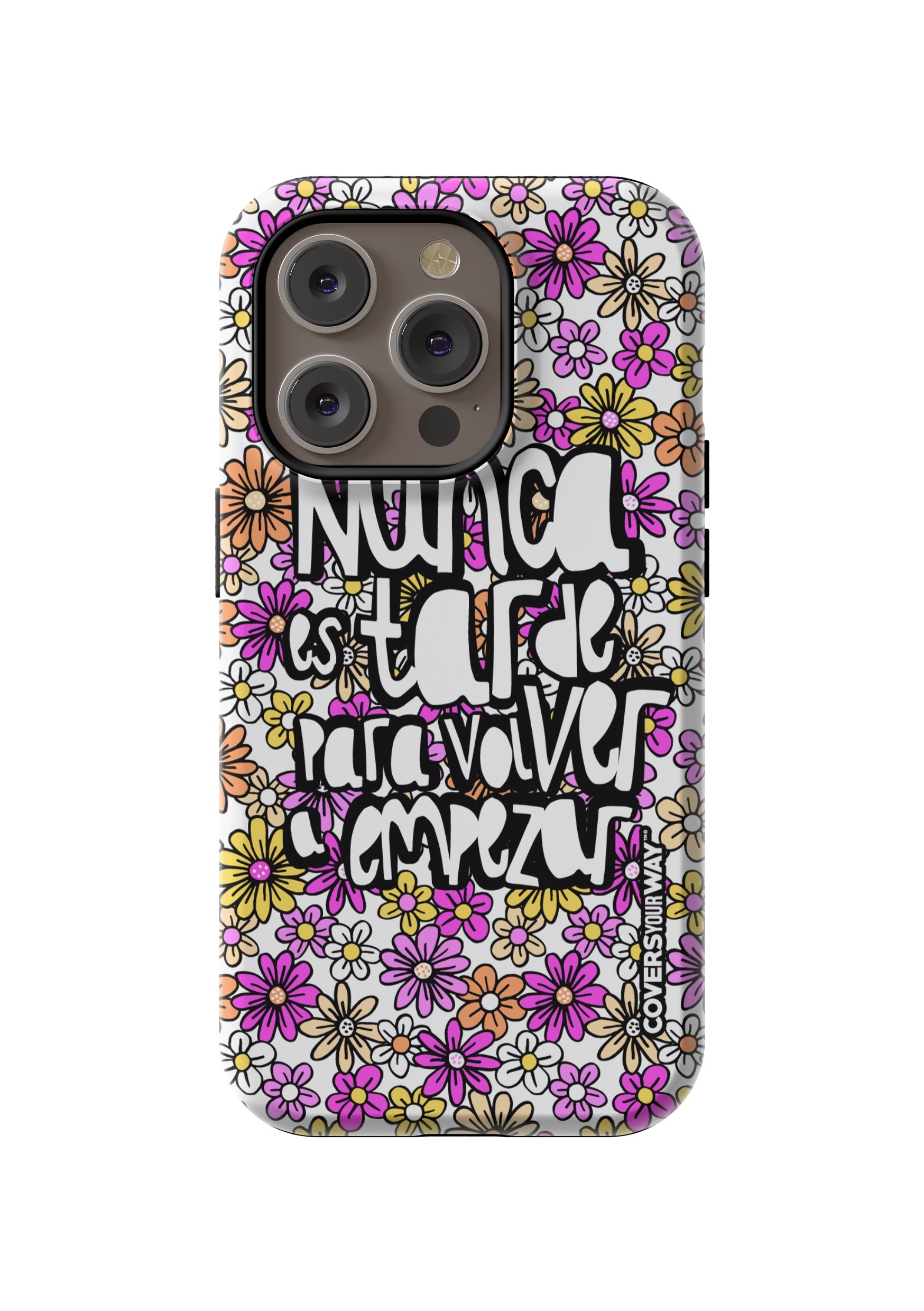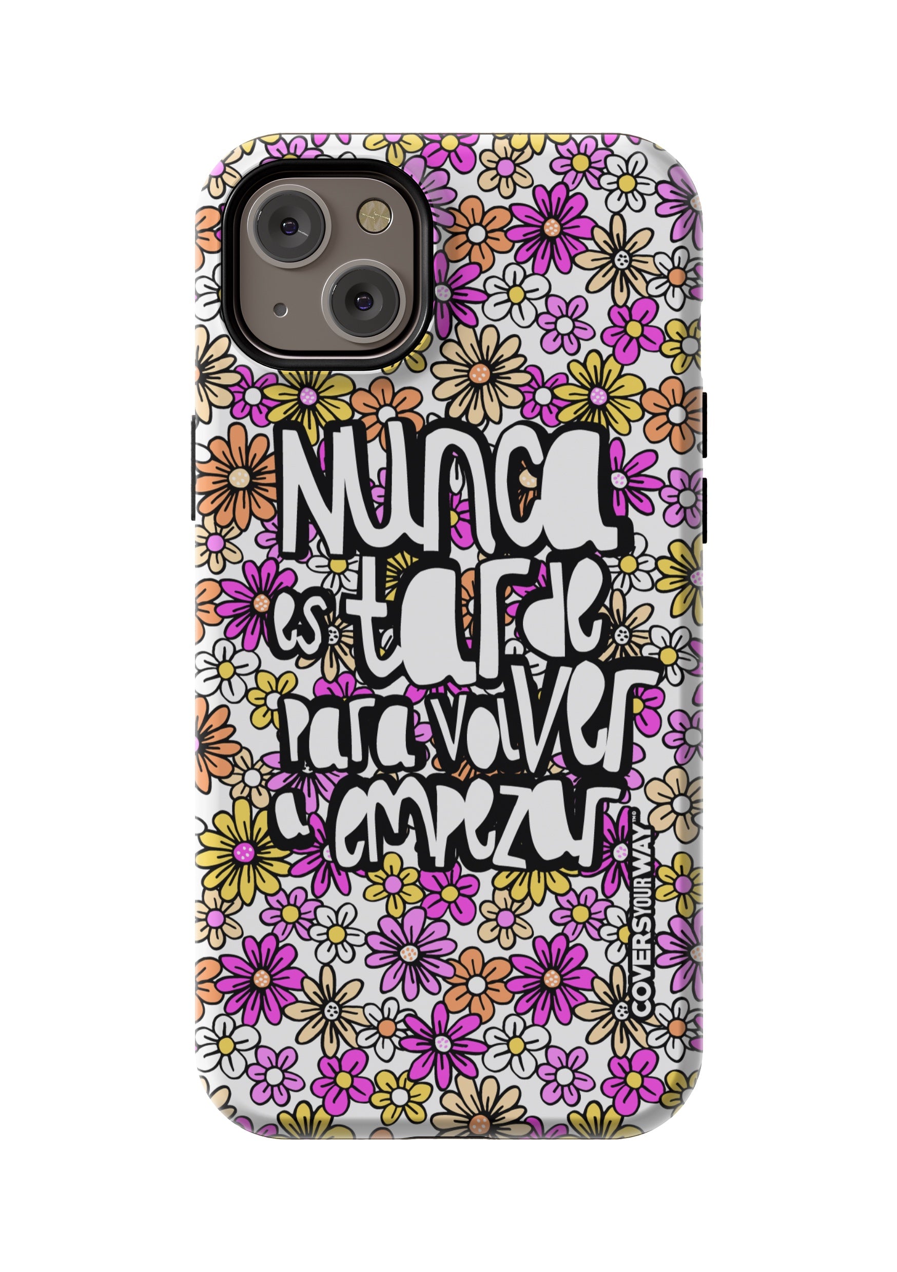 Refresh your style and energy with this durable phone case, designed with the phrase "Nunca Es Tarde Para Volver a Empezar". It protects your device from bumps and scratches while sharing a message of hope, second chances, and new beginnings.