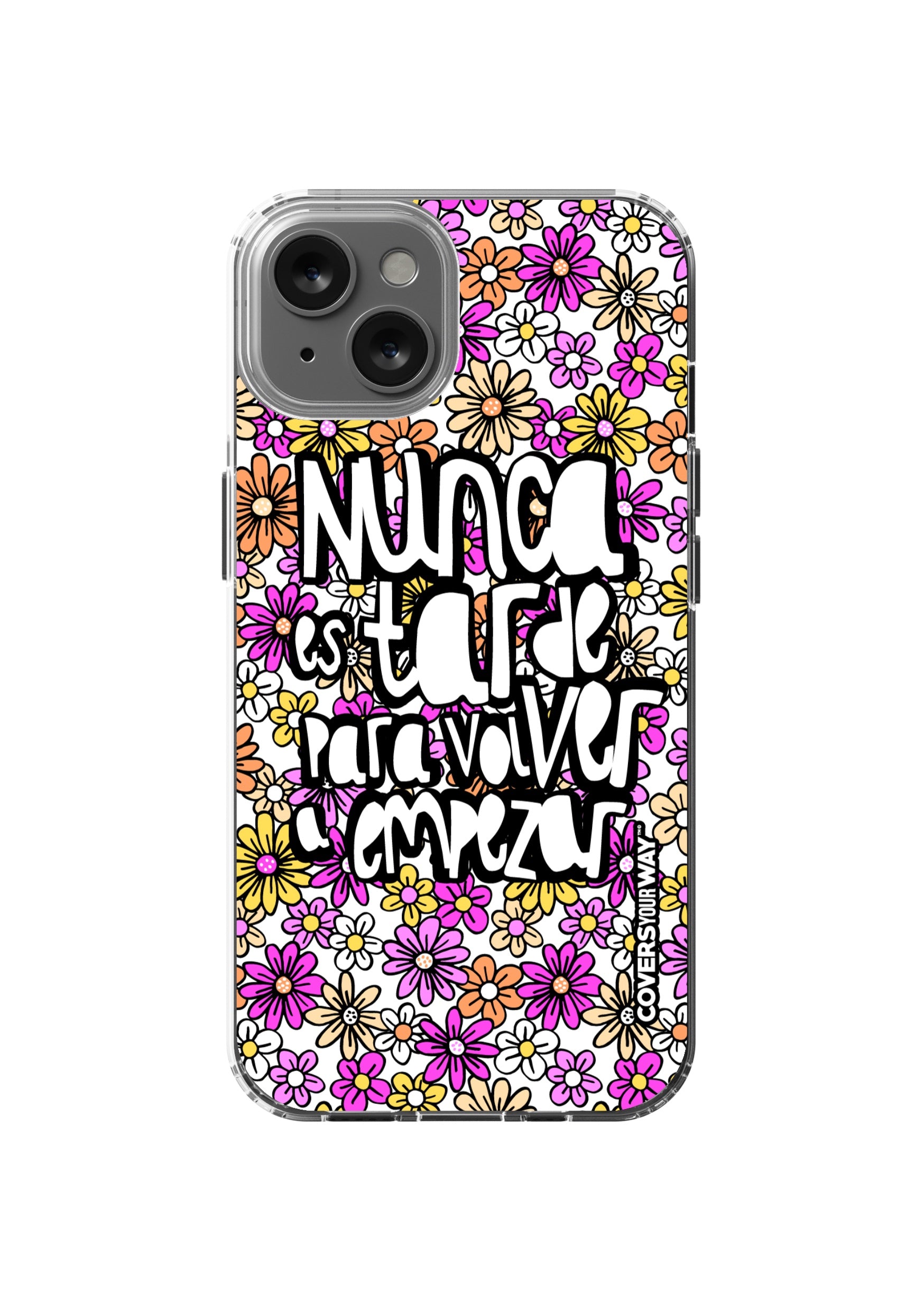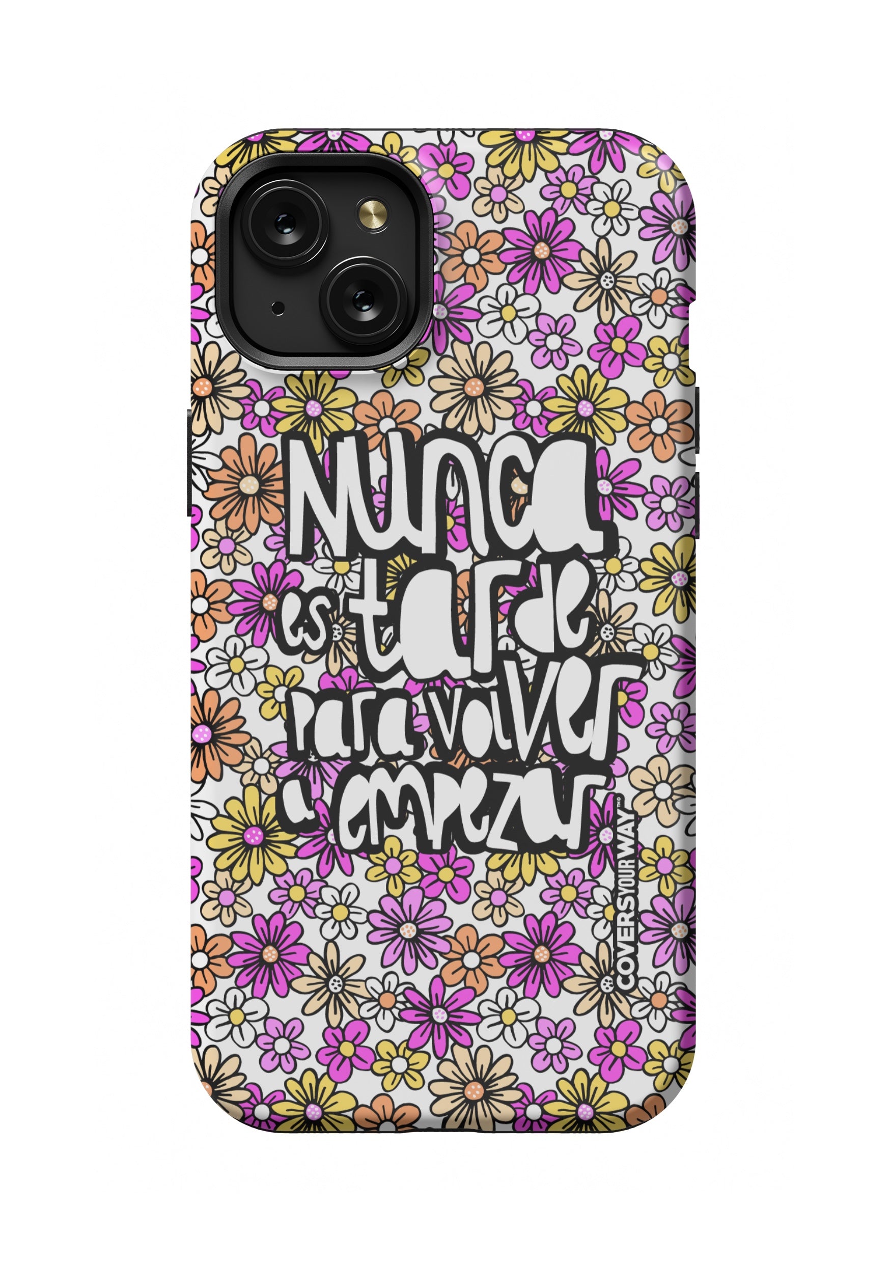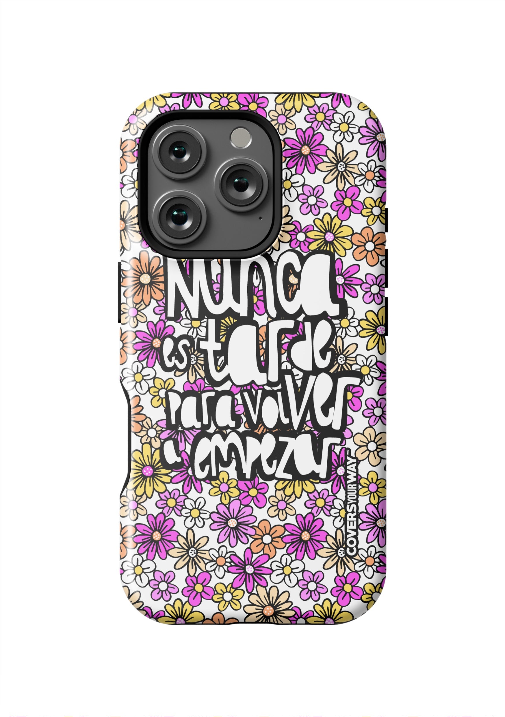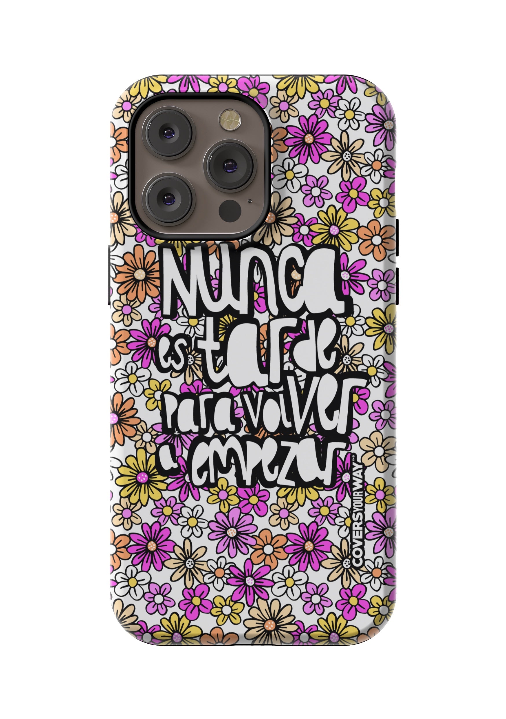 Refresh your style and energy with this durable phone case, designed with the phrase "Nunca Es Tarde Para Volver a Empezar". It protects your device from bumps and scratches while sharing a message of hope, second chances, and new beginnings.